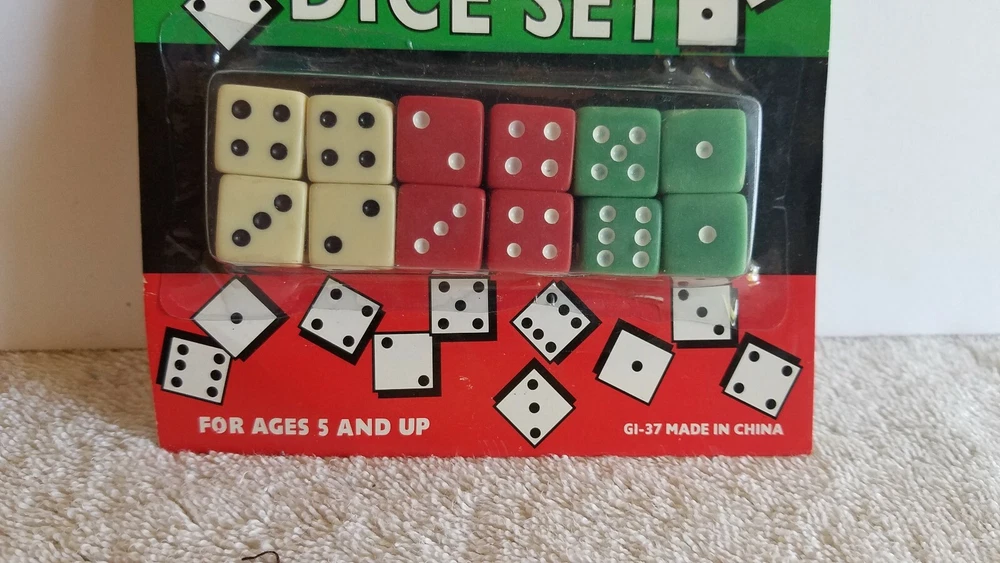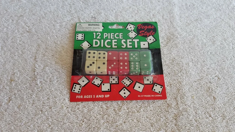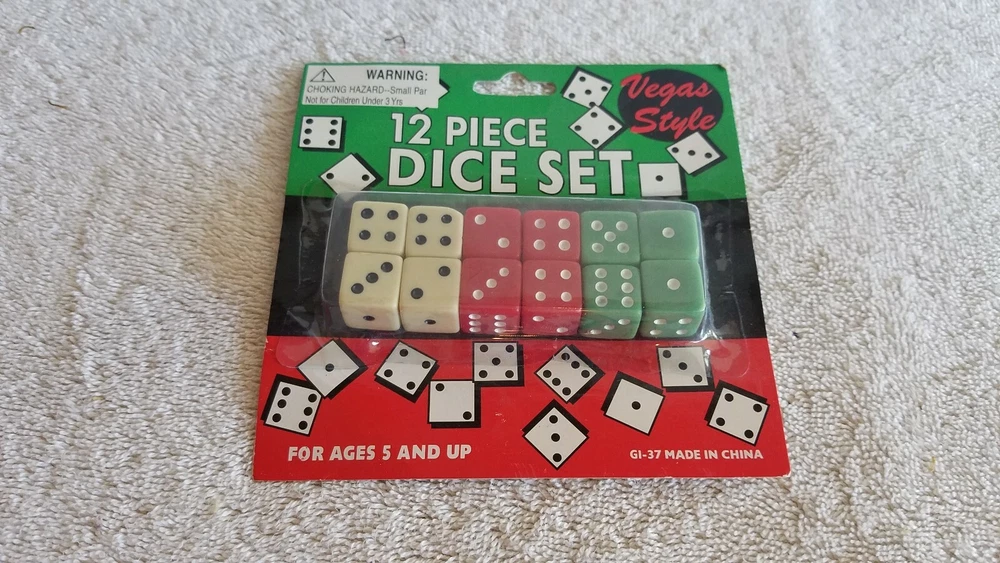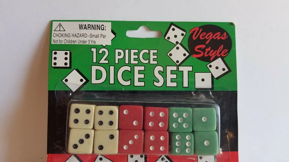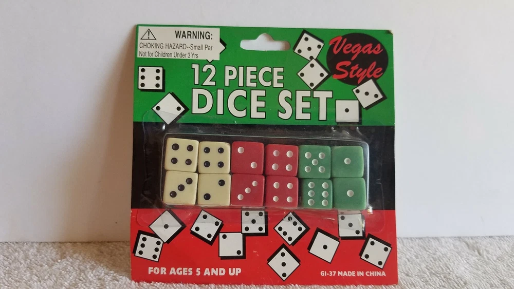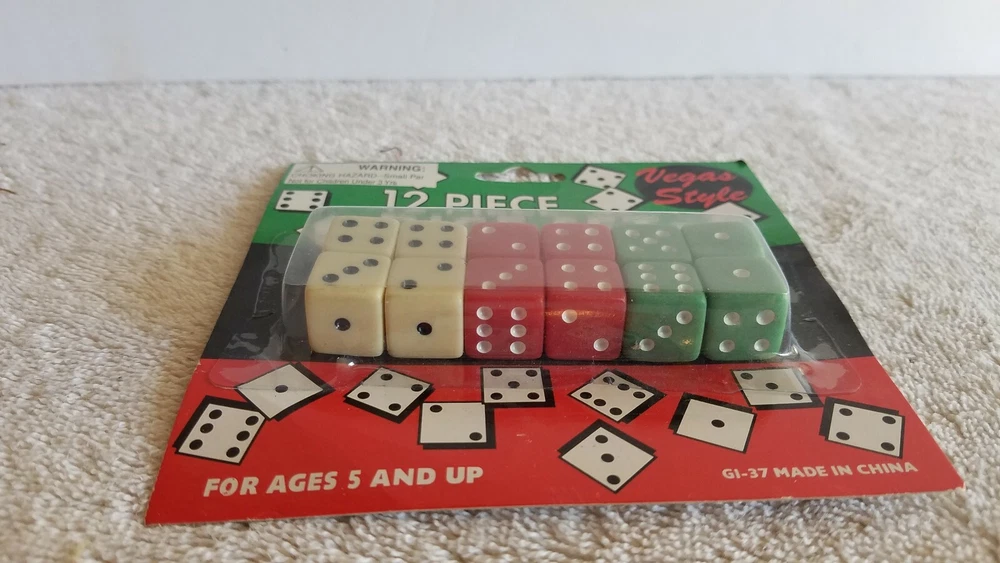 dice colors: red, white, green IMPORTANT INFO: PACKAGING IS FACTORY SEALED BUT DOES SHOW WEAR subject: dice, game night, mancave, barware theme: dice, game night, mancave, barware Country/Region of Manufacture: China IMPORTANT NOTE: PACKAGING IS FACTORY SEALED BUT DOES SHOW WEAR how many total pieces are included in this lot?: one pack of 12 dice COSMETIC ISSUES: PACKAGING IS FACTORY SEALED BUT DOES SHOW WEAR OVERALL COSMETIC CONDITION: PACKAGING IS FACTORY SEALED BUT DOES SHOW WEAR Object Type: dice Handmade: No