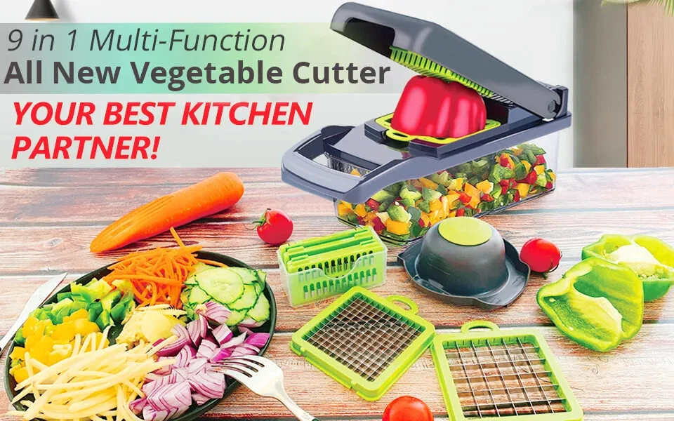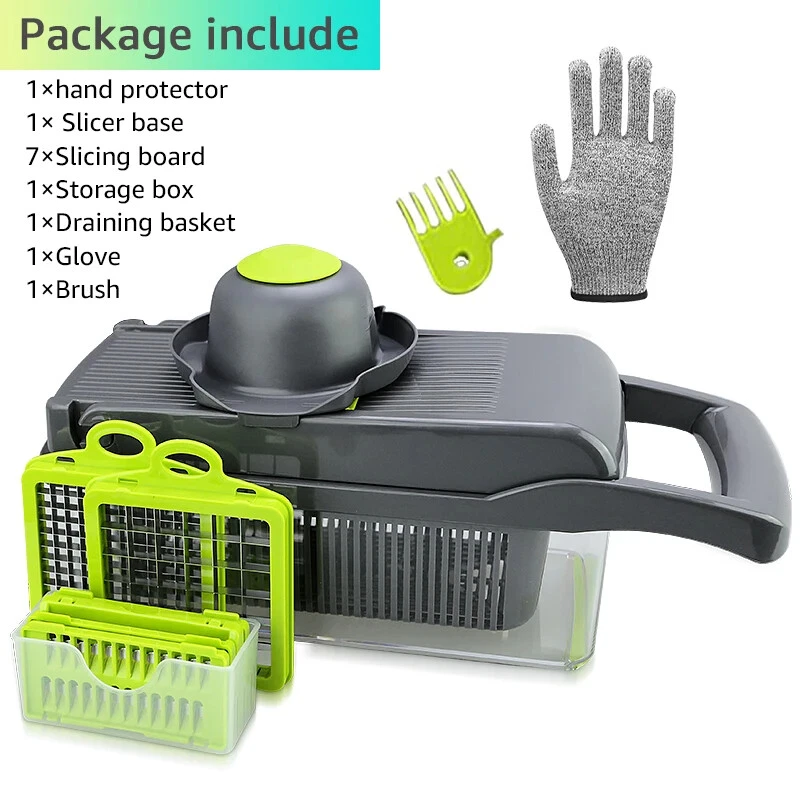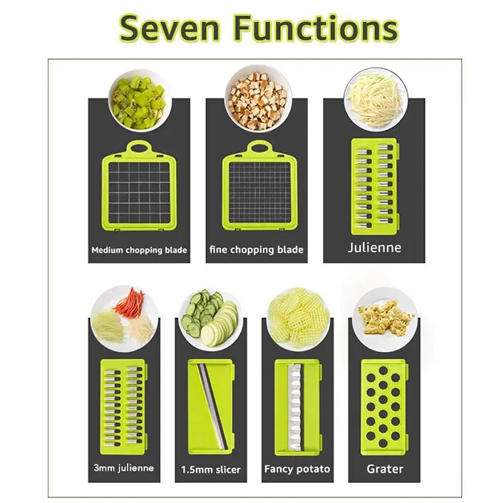 Multifunctional 9-in-1 Food Choppers Vegetable Slicer with 7 Blades, Colander Basket, Container for Salad Potato Carrot Garlic Name:9-in-1 Multifunctional vegetable chopper Material:ABS + stainless steel blades Usage:7 Blades for chopping/dicing/slicing Feature: easy to clean,and easy for storage for all parts of the onion chopper. Volume: Colander is 1.5L, storage container is 2L Washing tips: wash below 60℃ Superior Quality 100% brand new,the onion vegetable chopper dicer is made of high quality BPA-free food grade ABS plastic material,durable and last-long.For better using performance,we adopt the ultra-sharp 420-grade hardened stainless steel blades for chopping/dicing hard vegetables.Heavy-duty stainless steel blades are sharp enough to cut most kinds of vegetables and fruits. 7 INTERCHANGEABLE Blades Humanized design, this vegetable food chopper have 8 types of interchangeable blades,which can give you numerous ways to slicing,shredding, grating. Food can also be cut into different thickness of silk and slices. So functional vegetable chopper gift for cooking lover. A good kitchen helper: Ideal for cutting tomatoes, peppers, carrots, tomatoes, beets, cucumber, onions, garlic and celery. So functional vegetable chopper for cooking lover. Space-saving and good storage: Easy to disassemble with the blades and other accessories,you can store them in the container of the vegetable chopper slicer,help keep your kitchen clean and tidy. 7 mm, small cubes Remove the onion, not the eye 14 mm fruit cubes Quick cut fruit, watermelon, cantaloupe, fruit, etc strip cutting steps 1: cucumber cut, height should not exceed 5 cm 2: cucumber section on the blade 3: quickly press the press plate 4: the cucumber is cut 5: after use, you can use a cleaning brush to clean up the residue, convenient and fast how to cut fancy potato rotate it 90 degrees at a time Hand-guard Covers: Humanized design about the onion chopper slicer, can help protect your hands when working. Drain Basket: With the drain basket design,you can filter the extra vegetables water to the containers of the choppers,space-saving,no mess,very convenient to use.