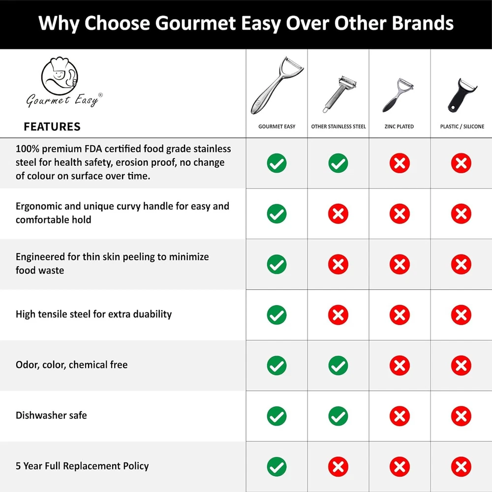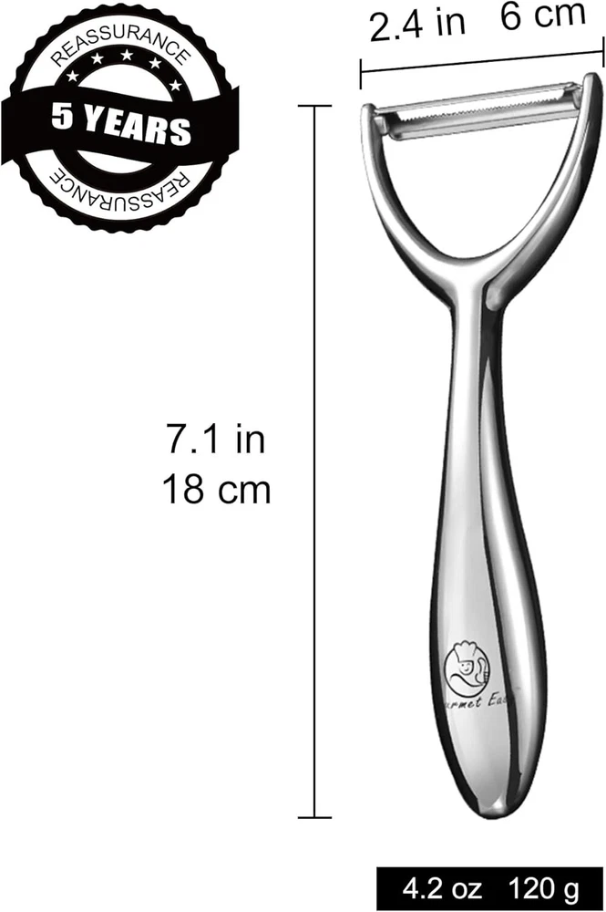 Vegetable Peeler, Stainless Steel Y Potato Peeler for Y Product Details Brand: Gourmet Easy Recommended Uses For Product: Fruit, Vegetable Color: Y Peeler Specific Uses For Product: Fruit, Vegetable Special Feature: Durable Product Dimensions: 7.09"L x 2.36"W Handle Material: Stainless Steel Blade Material: Stainless Steel Model Name: YP1 Power Source: Manual Power Operation Mode: Manual Material: Stainless Steel Style: Y Peeler Item Weight: 0.3 Pounds Blade Edge: Serrated Number of Blades: 1 Manufacture Year: 2024 Manufacturer: Gourmet Easy Item Weight: 4.8 ounces Country of Origin: China Item model number: YP1 Finish types: Mirror Satin Care instructions: Dishwasher Safe Dishwasher compatible: Yes Assembly required: No Number of pieces: 1 Batteries required: No Included Components: Shade included GIFTABLE PACKAGE - Ready to go for gifting to your love ones A high-grade fruit and vegetable peeler is perfect for those who love spending their time in the kitchen. MULTI PURPOSE PEELER, SLICER! Our handheld I shaped potato peeler for kitchen efficiently skins and slices all kinds of vegetables & fruits including potato, apple, pear, carrot, cucumber, etc. Use the peeler side for peeling fruits and veggies. A must have kitchen tool for your veggies & fruits! SLICING OR PEELING MADE SIMPLE! . Our fruit peeler for kitchen with its non-slip ergonomic handle, provides a strong grip whether your hands are dry or wet. Say goodbye to slippery peeling experiences! No more worries about losing control or grip while prepping with our cucumber peeler for kitchen! RUST-FREE STAINLESS STEEL PEELER! Our top quality kitchen peeler blade is made of rust-free stainless-steel (304) which is better than the zinc alloy body. Ensures durability and is built to last. It is anti-corrosion, water proof, dishwasher safe & easy to clean which makes it everyone’s favorite! EXTRA SHARP AND SUPER CONVENIENT - This stainless steel potato peeler is handy for lightweight prep work. If you're looking for culinary tool that can get the job done, our unique kitchen tool is perfect for home, work, picnics, traveling, camping, hiking, fishing, & more. GOURMET MADE SIMPLE: At Gourmet Easy, we're dedicated to simplifying gourmet cooking experiences. We believe that creating delicious meals for your loved ones should be a fun journey, not a daunting task. Share the joy of cooking with your loved ones with our Gourmet Easy Peeler!