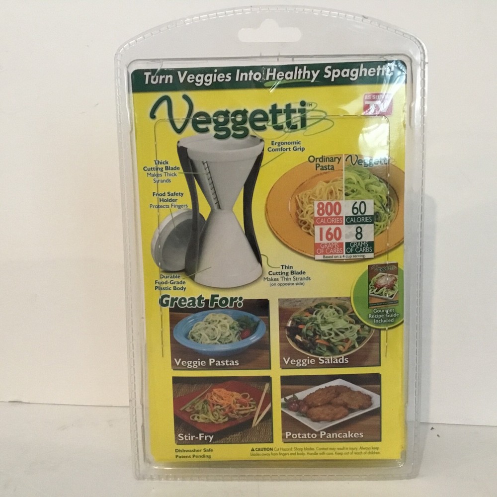 The NEW Veggetti Spiral Vegetable Cutter is a kitchen tool designed for cutting vegetables, potatoes, and pasta into spiral shapes for a low carb pasta alternative. With dual stainless-steel cutting blades, this slicer from the brand Veggetti is easy to use and dishwasher safe. The sleek white design and compact set make it a convenient addition to any home kitchen. As seen on TV, this product is a creative and healthy way to transform your favorite vegetables into delicious spiral noodles for a variety of dishes.
