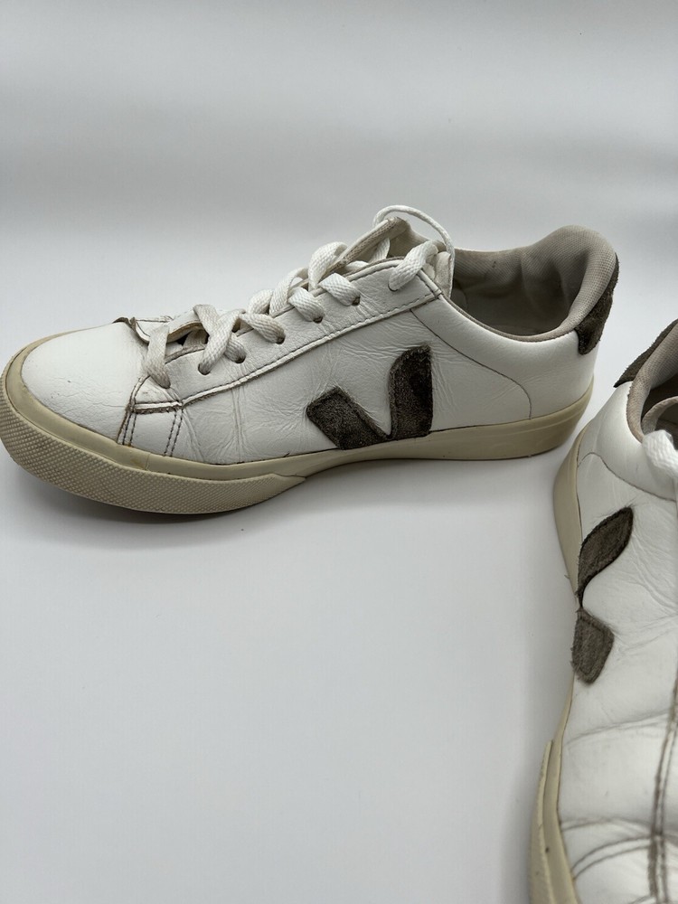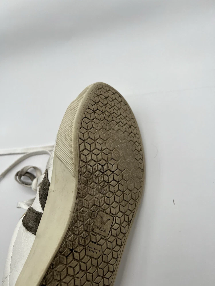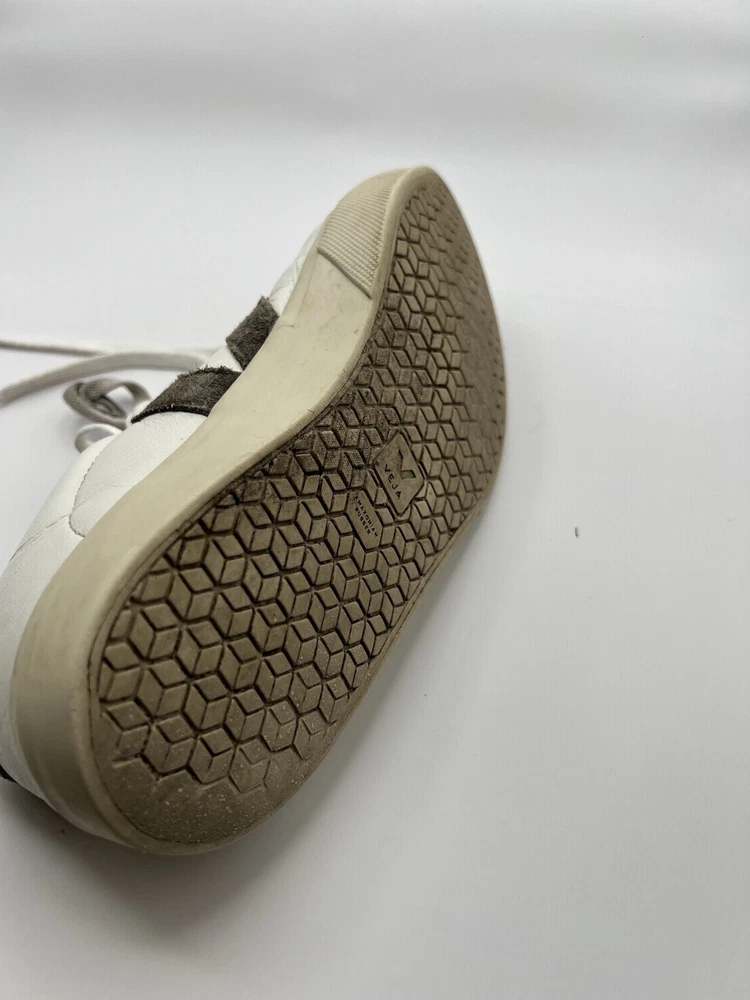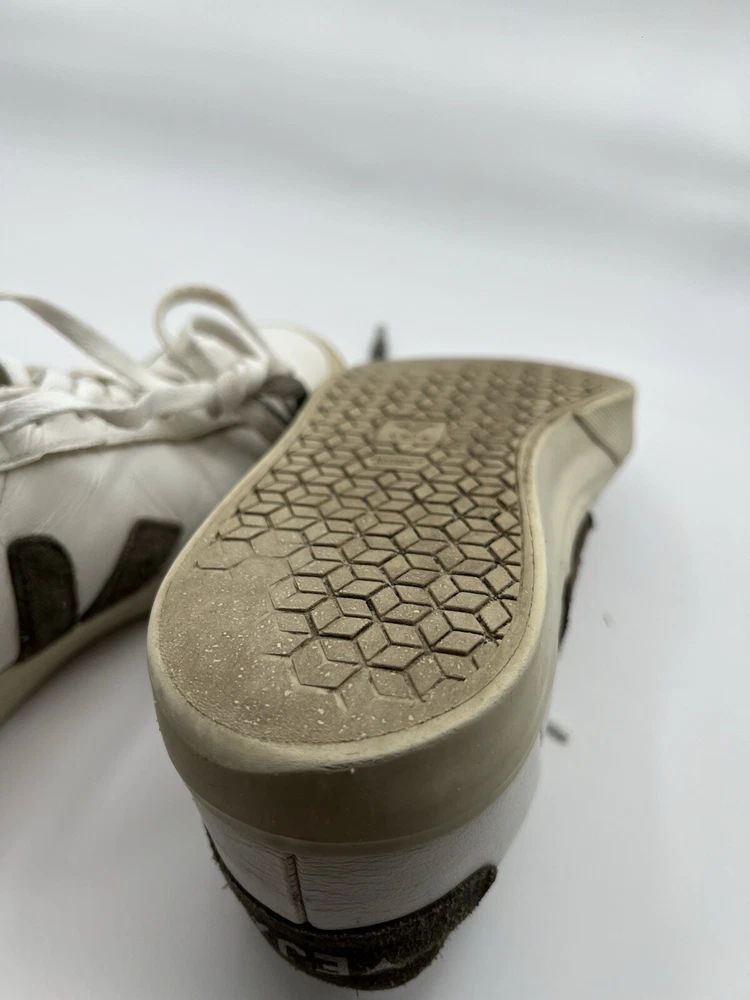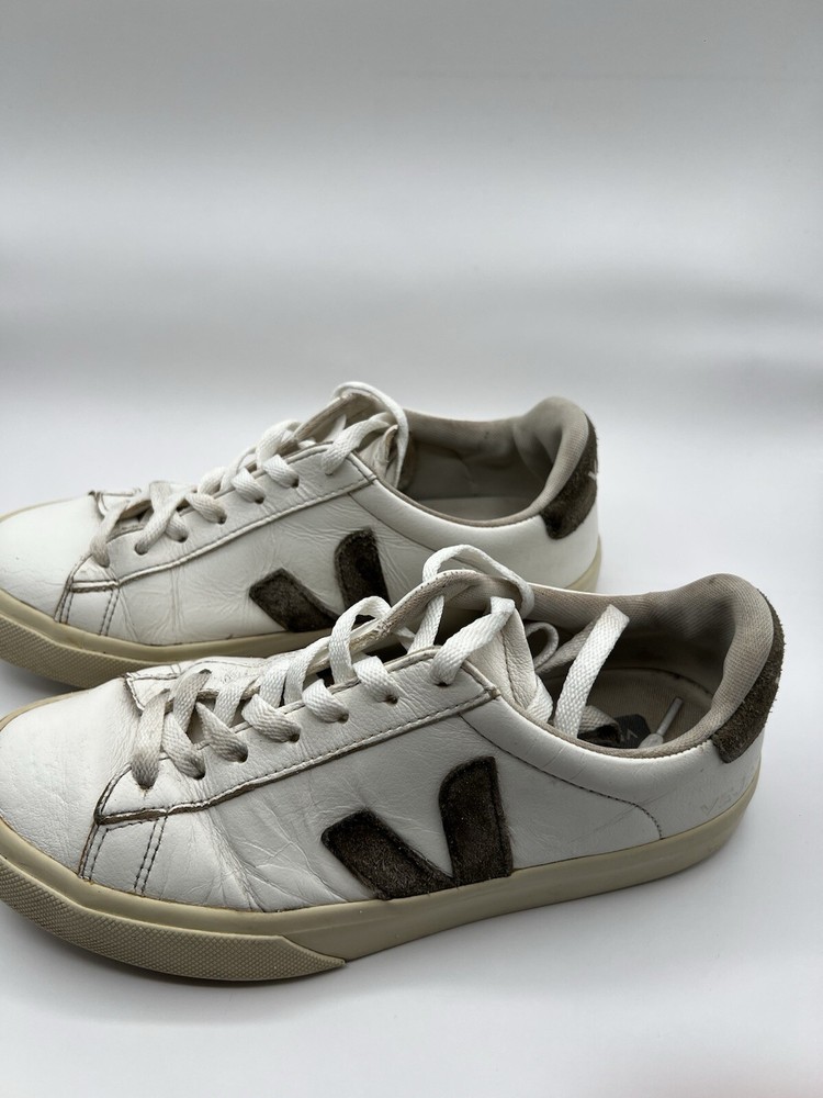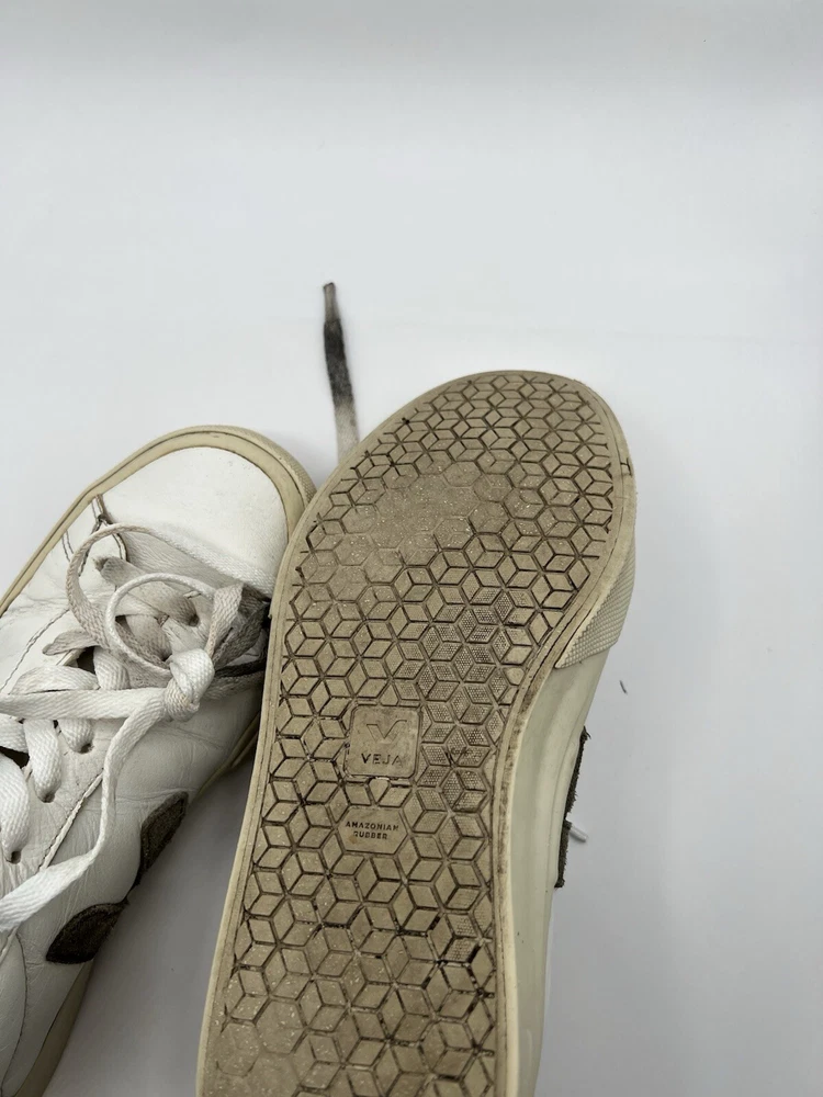 Veja Campo Womens Chromefree Leather - White/Khaki - Size 8 Pre owned, shows signs of usage such as scuffing and creasing as well as dirt stains on laces and interior of shoes
