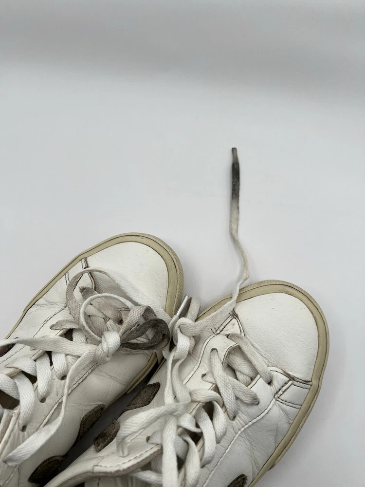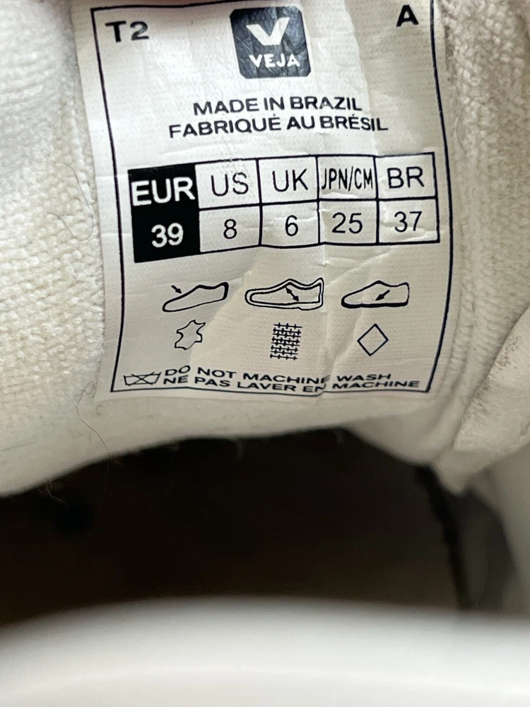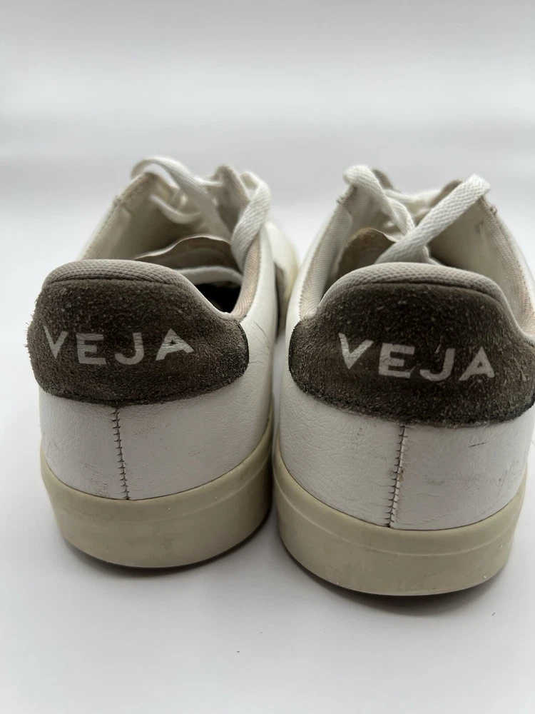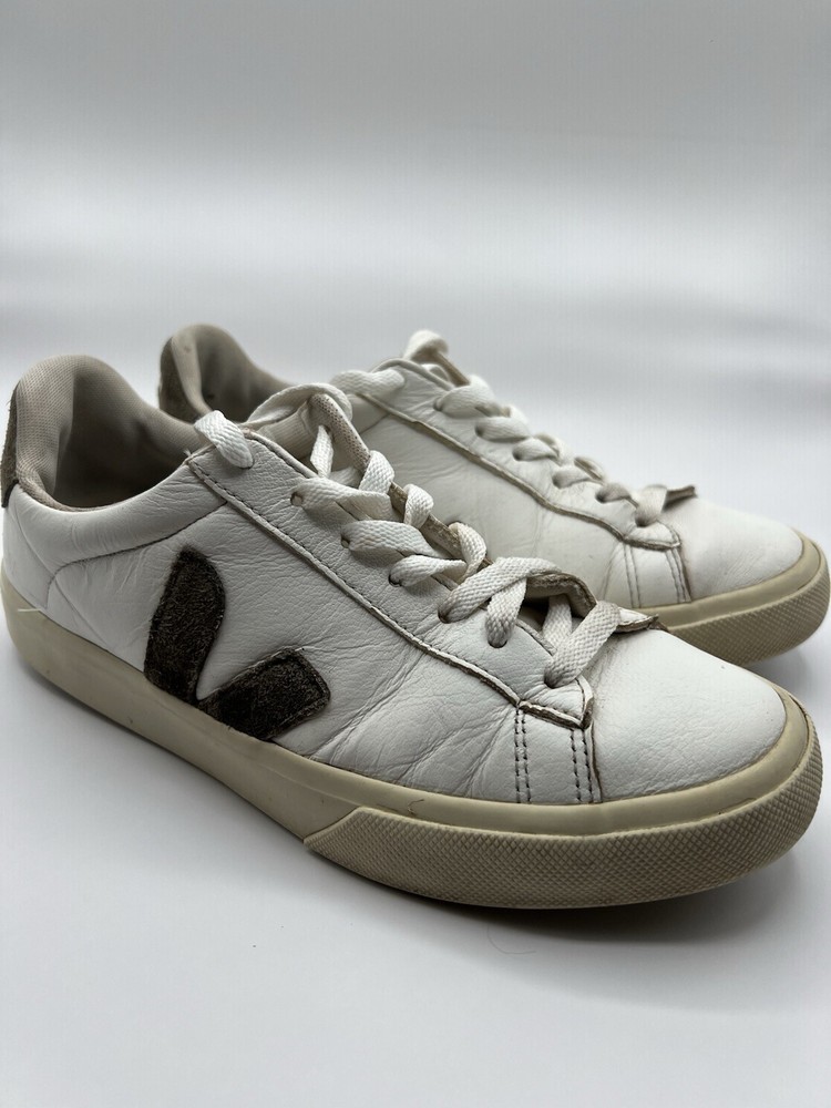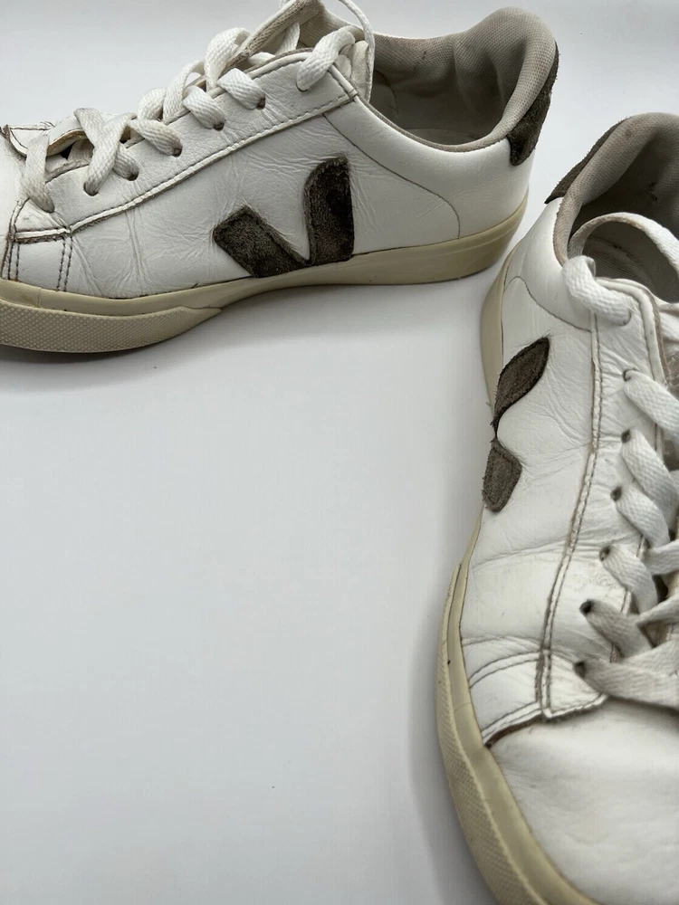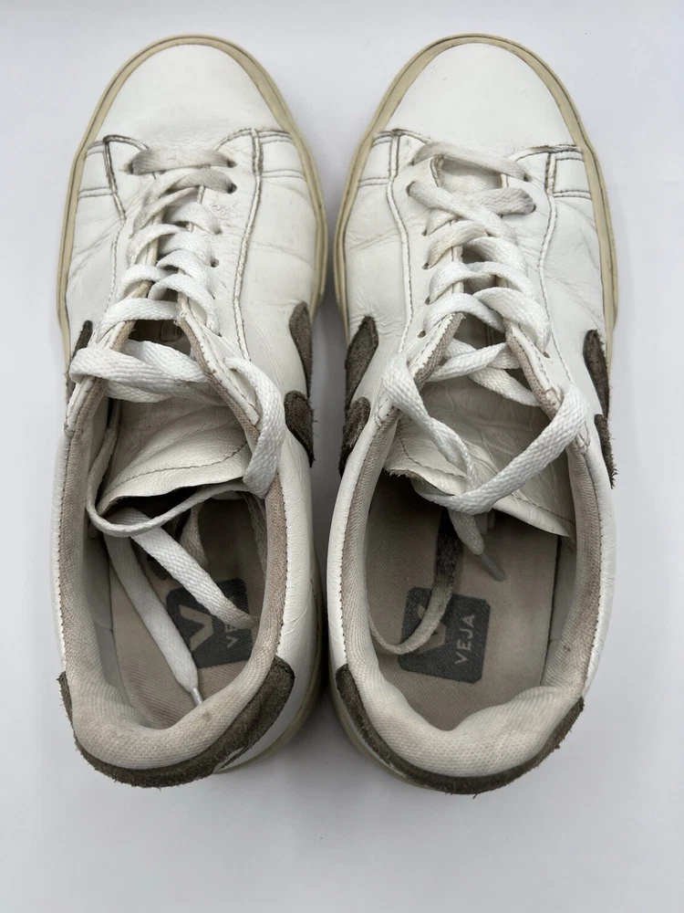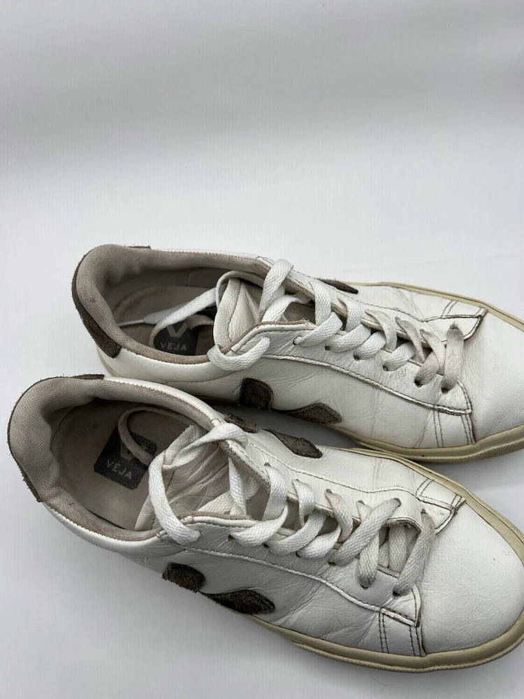 Veja Campo Womens Chromefree Leather - White/Khaki - Size 8 Pre owned, shows signs of usage such as scuffing and creasing as well as dirt stains on laces and interior of shoes