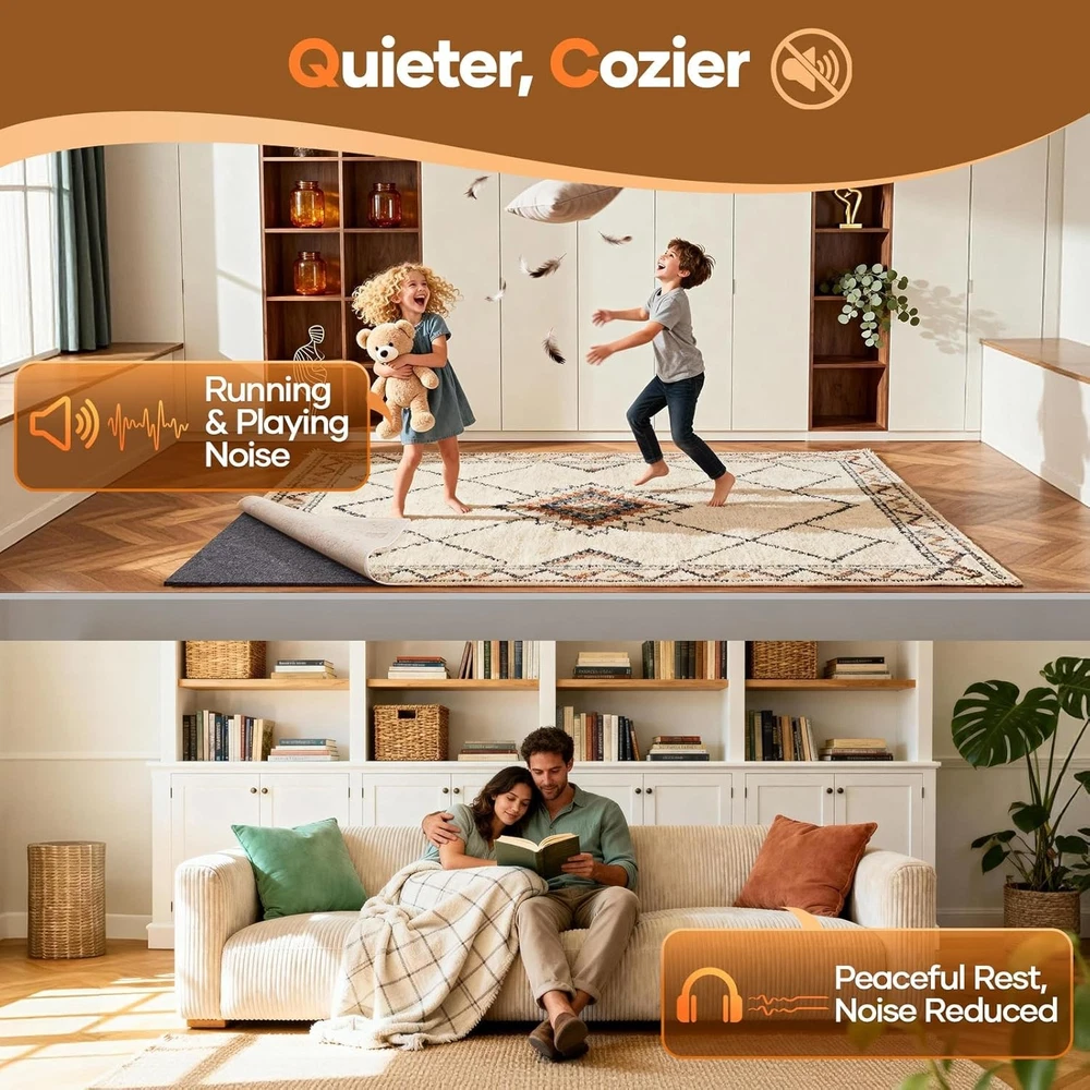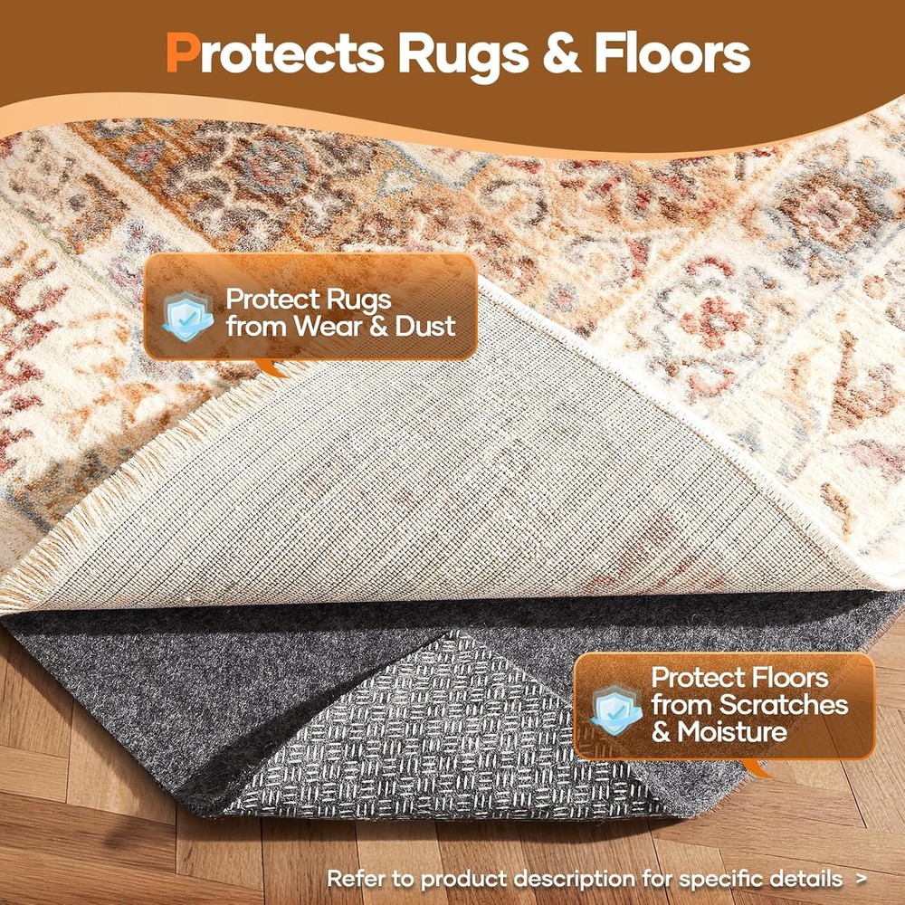 Free eBay listing template designed by dewiso.com Veken Non Slip Cushioned Rug Pad Gripper 8 x 10 Ft, Felt and Silicone Backing, 1/4 inch Thick Carpet Liner for Hardwood Floors and Finishes, Under Area Rugs Anti Skid Mat, Keep Rugs Safe and in Place FREE AND FAST SHIPPING! About this item Helps Prevent Rug Slippage: Designed with a unique high-density cross-bar texture and silicone backing, this carpet underlay provides a powerful anti-slip grip. Keeps area rugs securely in place, preventing sliding, bunching, and wrinkling. Cushioning Rug Gripper with Comfort Support: Choose from 3 thickness options to add the right level of comfort underfoot. The dense felt fiber blend creates a soft yet durable cushion, making your area rugs more comfortable and long-lasting. Protects Rugs and Floors from Damage: Works as a protective layer between carpet and floor, reducing scratches, dents, and daily wear. Extends the life of hardwood, tile, or laminate flooring while keeping rugs cleaner by minimizing trapped dust and dirt. Easy to Cut and Customize: Precision-cut with minimal size error for a perfect fit. This needle-punched, glue-free design won't fray, and can be trimmed with household scissors. Fits any rug size or shape. Safe & Versatile Design: Made from odorless and eco-conscious materials, safe for everyday home use. Provides added warmth and sound insulation, making it an ideal rug gripper for hardwood floors, carpet protection, or multi-surface use. Product We offer a 30-Day Return Policy on items which you are not completely satisfied with. You have the option for a full-refund or an exchange of the item. No returns are available on items shipped outside of the US . Shipping We offer Free Shipping to the US and ship within 2 business days of payment, usually sooner. We use UPS express shipping. That's why your products are usually delivered within 3 days . Contact We try our very best to make sure every customer is completely satisfied. If there's a problem , message us! We're happy to help. 24/7 live chat available.