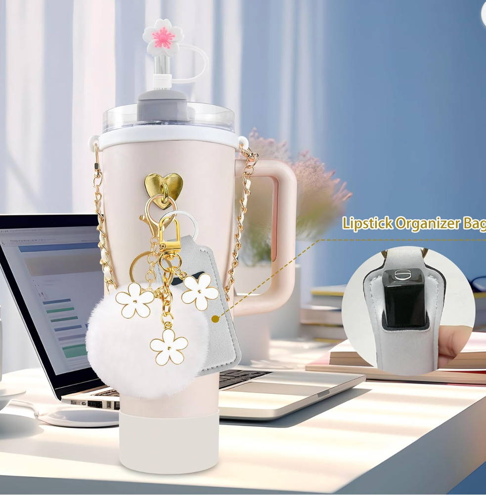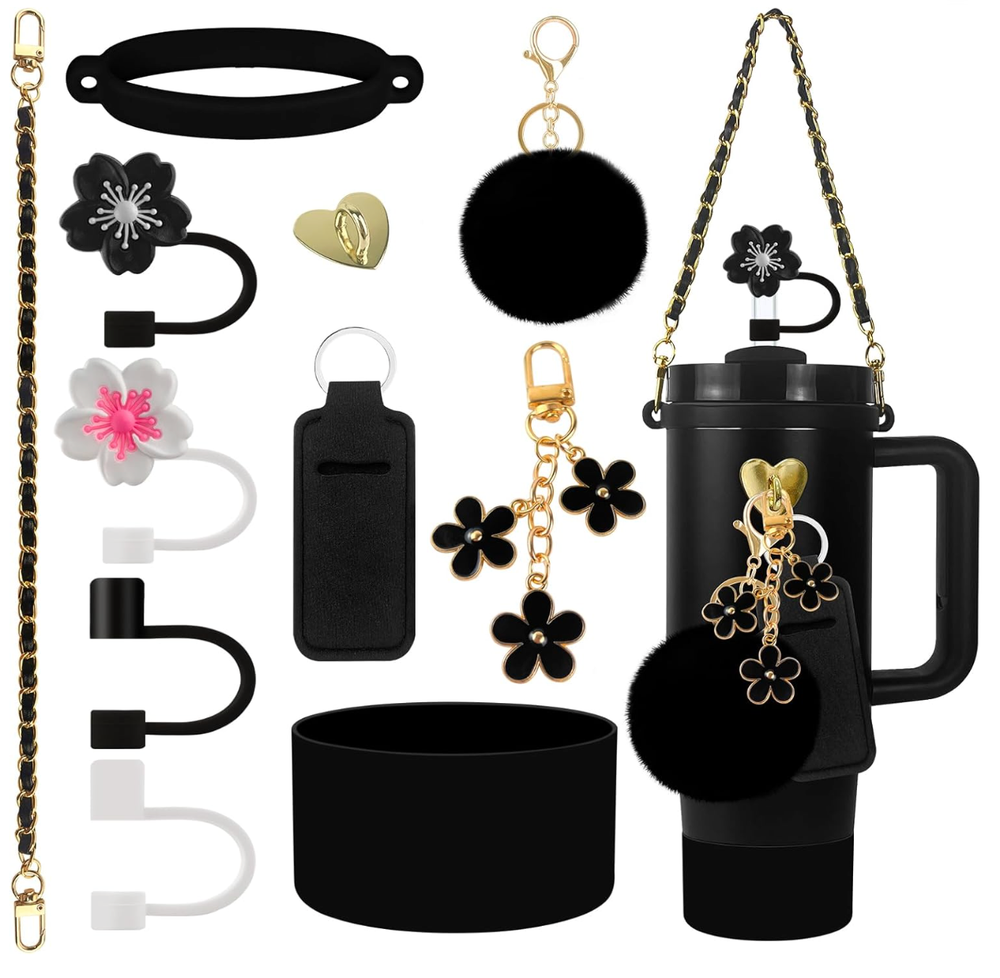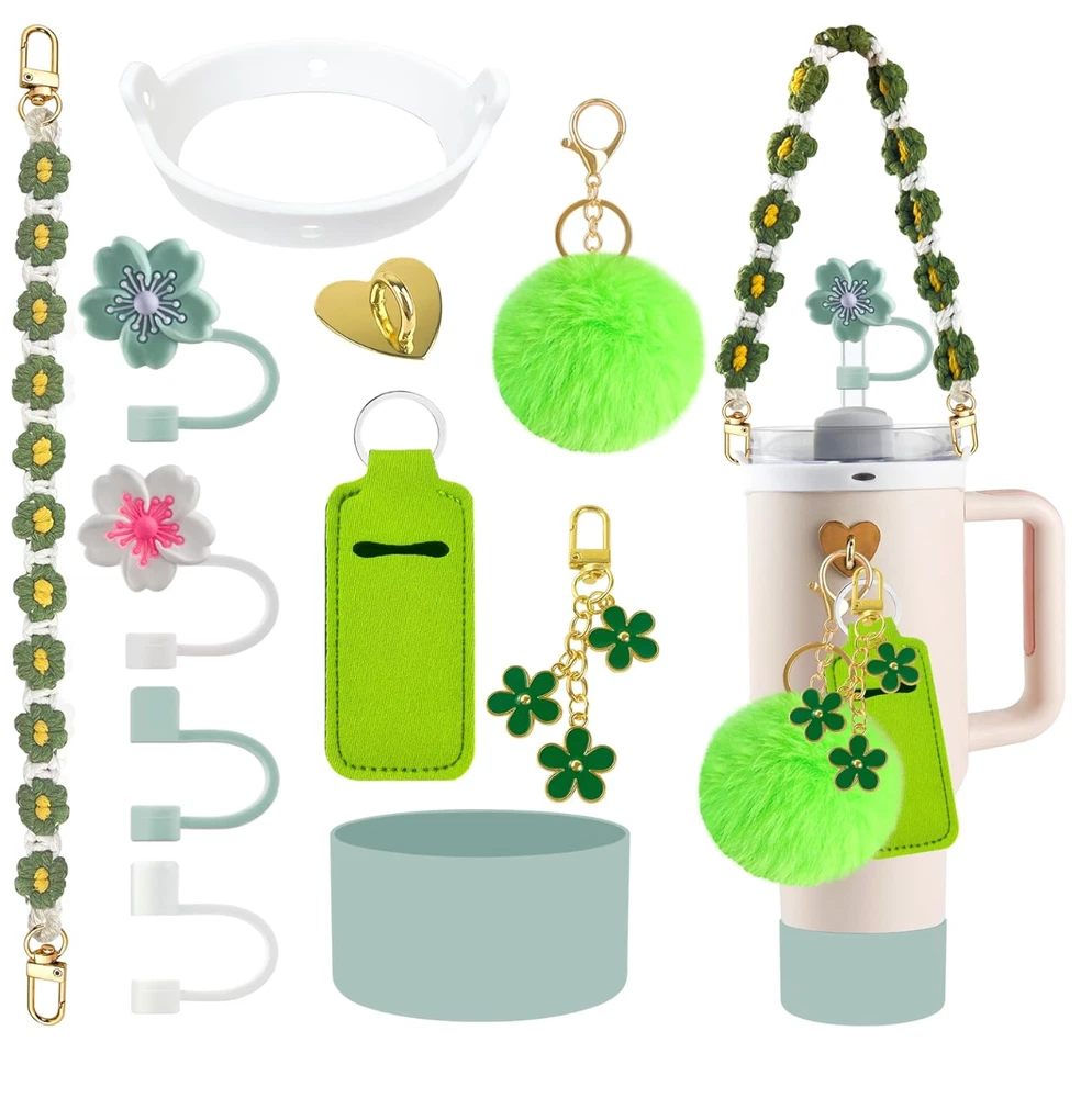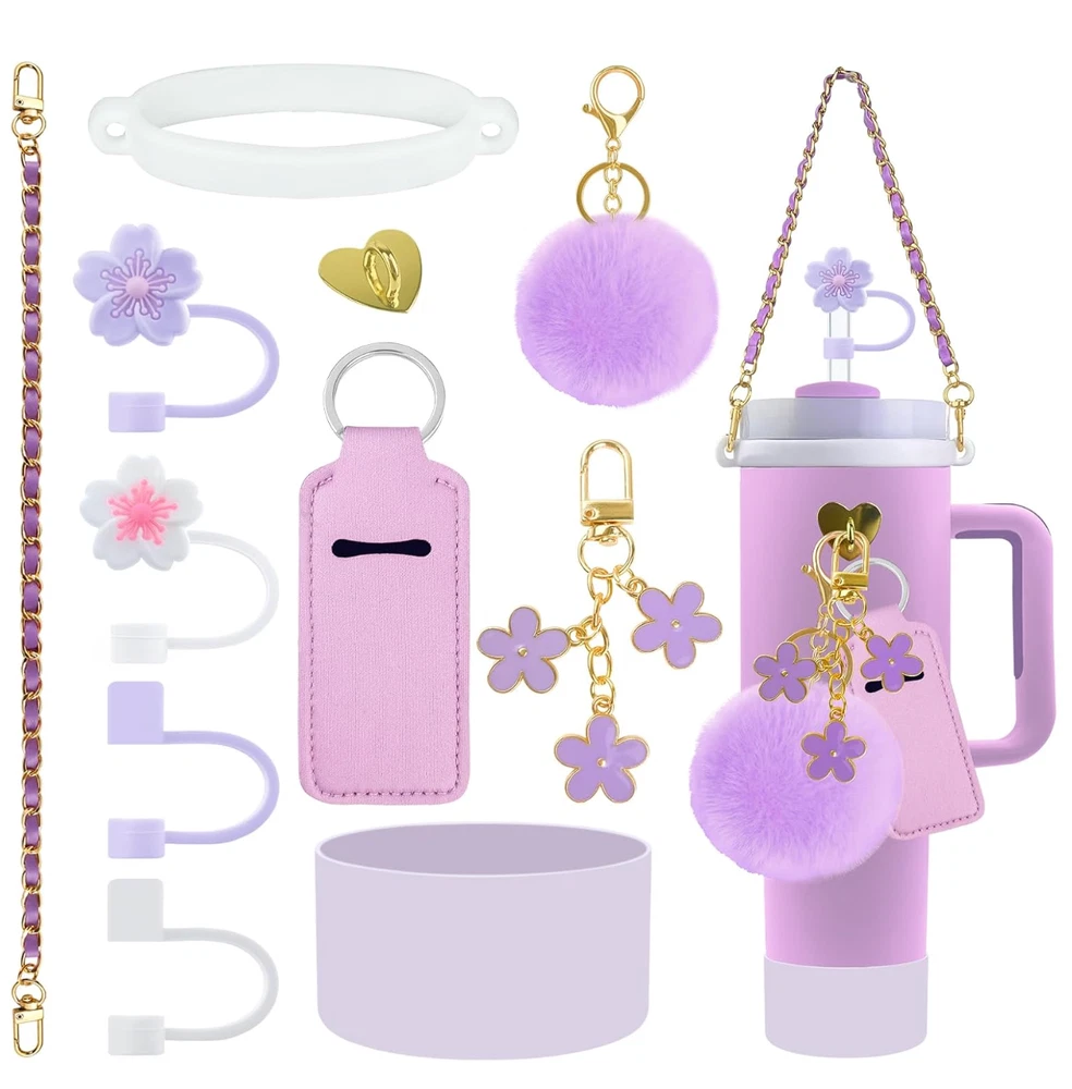 Colors available: Black, Blue, Green, Purple, Pink, Rose, and white (when purchased message the desired color) ALL Colors same price!!! 【11 PCS Tumbler Accessories Set】 Velaco cup accessories for Stanley 30/40 oz tumblers with handle. Includes water bottle handle strap, silicone straw toppers, cup boot, and cute keychain charms. 【Package Includes】 1 handle strap, 1 drawstring ring, 4 silicone straw covers, 1 flower keychain, 1 pompom ball, 1 heart hook, 1 silicone cup boot, 1 lip balm sleeve. 【Food-Grade Silicone】 Durable, reusable, and dishwasher-safe straw covers that are airtight, dustproof, and splashproof—perfect for daily use and outdoor activities. Encourages kids to drink more water too! 【Cute & Practical】 Stylish designs that protect your drinks from dust and spills while adding fun personality to your tumbler. 【Customer Satisfaction】 We care about your experience. Contact us anytime, and we’ll resolve issues within 24 hours. Note: Straws not included.