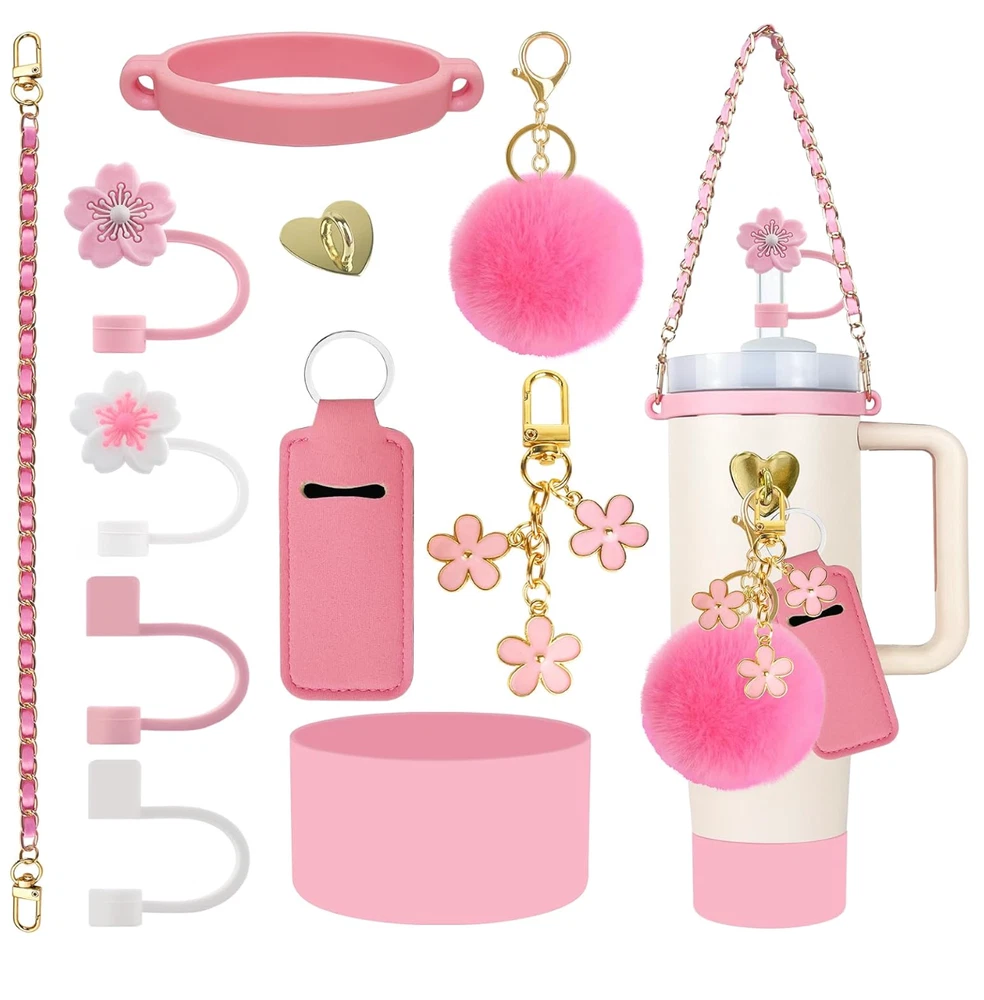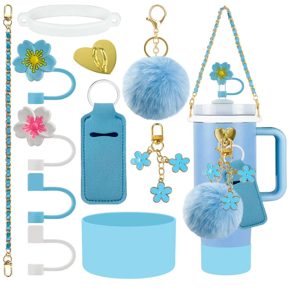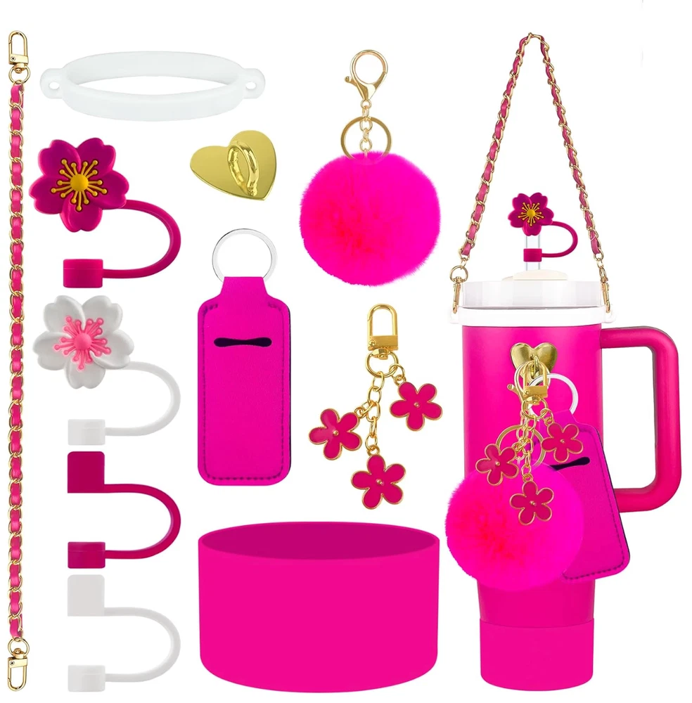 Colors available: Black, Blue, Green, Purple, Pink, Rose, and white (when purchased message the desired color) ALL Colors same price!!! 【11 PCS Tumbler Accessories Set】 Velaco cup accessories for Stanley 30/40 oz tumblers with handle. Includes water bottle handle strap, silicone straw toppers, cup boot, and cute keychain charms. 【Package Includes】 1 handle strap, 1 drawstring ring, 4 silicone straw covers, 1 flower keychain, 1 pompom ball, 1 heart hook, 1 silicone cup boot, 1 lip balm sleeve. 【Food-Grade Silicone】 Durable, reusable, and dishwasher-safe straw covers that are airtight, dustproof, and splashproof—perfect for daily use and outdoor activities. Encourages kids to drink more water too! 【Cute & Practical】 Stylish designs that protect your drinks from dust and spills while adding fun personality to your tumbler. 【Customer Satisfaction】 We care about your experience. Contact us anytime, and we’ll resolve issues within 24 hours. Note: Straws not included.