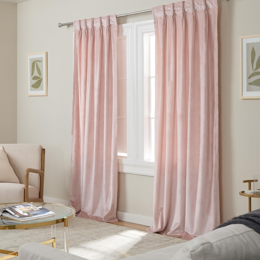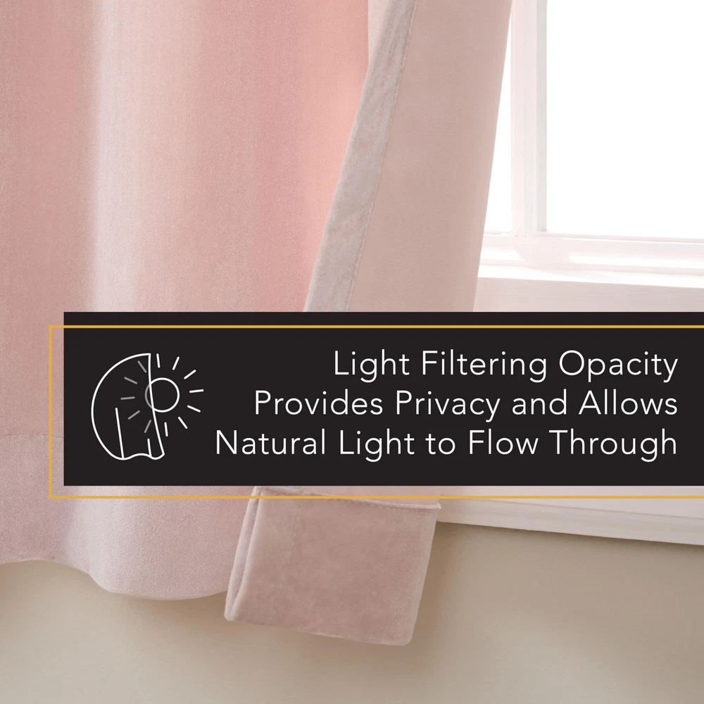 Velour Solid Heavyweight Plush Velvet Indoor Curtain Panel Set Includes two (2) curtain panels, each measuring 27"W x 84"L. Light Filtering Opacity provides privacy while allowing some natural light to shine through 100% Polyester, with plush velvet feel Triple pinch pleat top treatment with hidden back tabs for hanging