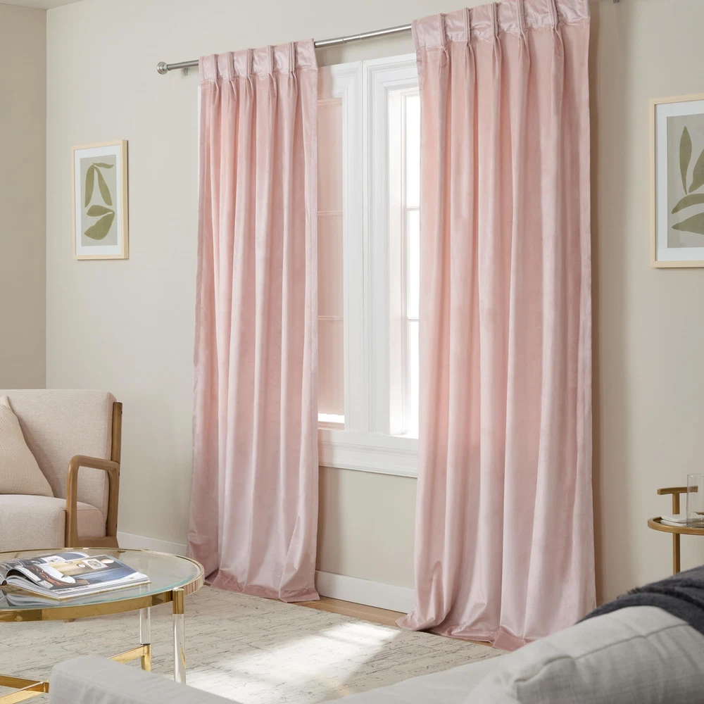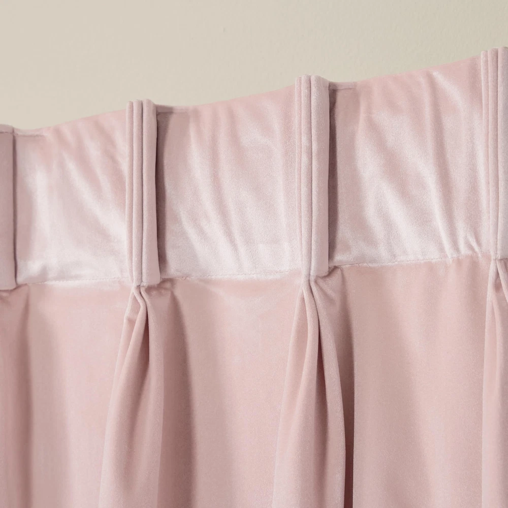 The Velour Solid Heavyweight Velvet Light Filtering Triple Pinch Pleat Curtains are a luxurious addition to any room. Woven with ultra-plush velvet, these indoor curtains are stylish, ideal for blocking natural light, and providing privacy in your home. This light blocking curtain panel set has a beautiful heavyweight texture with a subtle lustrous look. The triple pinch pleat top treatment offers a timeless look using back tabs to fit your favorite curtain rod, making them ideal window treatment for any space. These decorative curtains fit curtain rods up to 1.5” in diameter. For proper look and fullness, the curtain panels should measure 2-3 times the width of your window/opening. Hand wash only. Velour Solid Heavyweight Plush Velvet Indoor Curtain Panel Set Includes (2) curtain panels, each measuring 27"W x 108"L. Light Filtering Opacity provides privacy while allowing some natural light to shine through 100% Polyester, with plush velvet feel Triple pinch pleat top treatment with back tabs for hanging Overall fabric width of 54" at bottom of panel provides full luxe look Hand wash cold with like colors. Only non-chlorine bleach, as needed. Line dry. Cool iron.