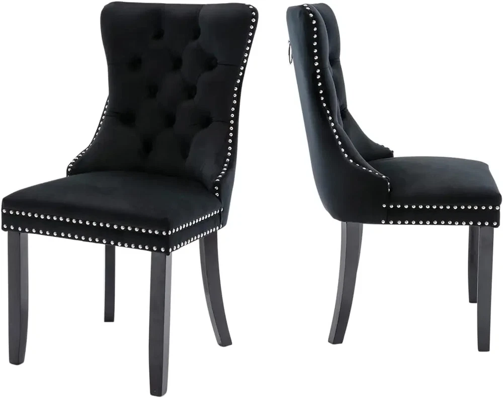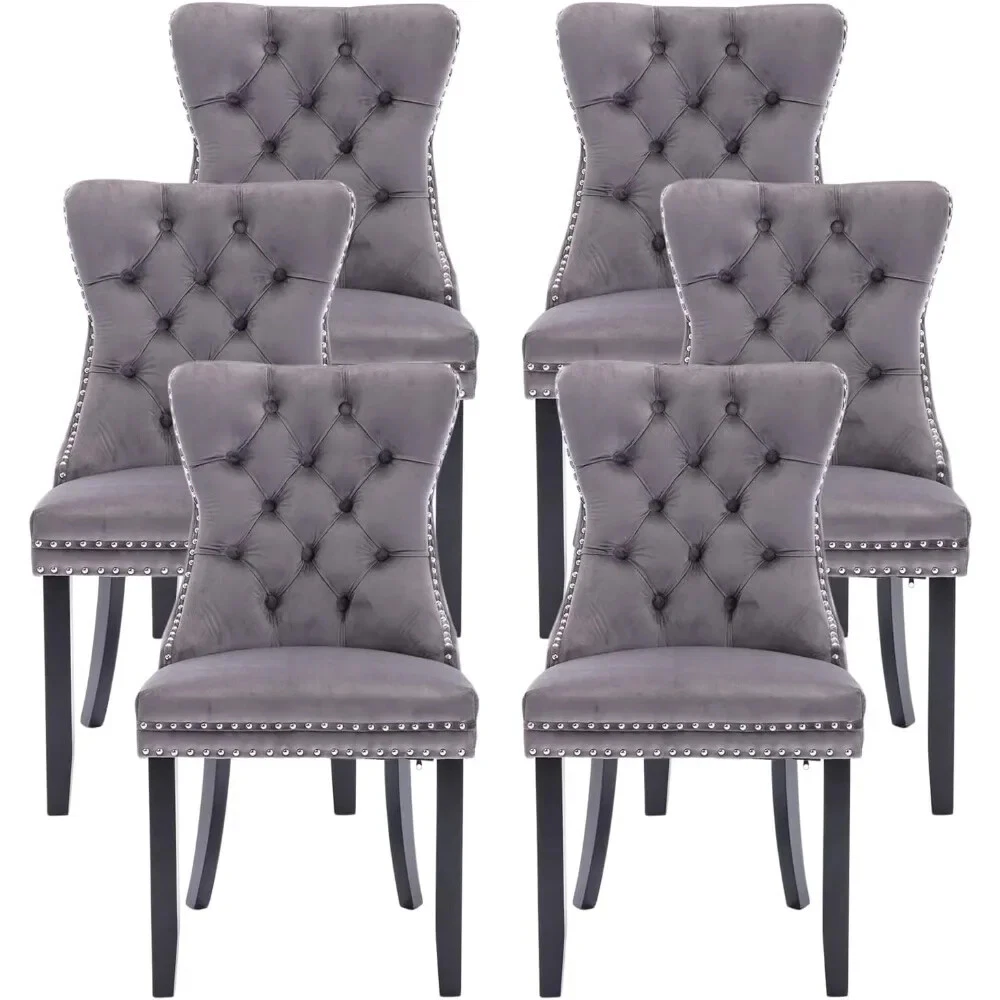 Color Grey Product Dimensions 24"D x 20"W x 38"H Size set of 6 Back Style Solid Back About this item Quality velvet fabric: These wingback dining chairs are made of high-quality velvet fabric, which has super wear resistance and will not fade, the fabric is thick and luxurious, the touch is very delicate. This velvet dining chairs set featuring a very modern mid-century look. Ergonomic High Back: This wingback dining chair set is equipped with high backrest for a strong comfortable back support. Plenty decorative rivet inset around cushion and back not only make it looks noble and elegant but also give the whole chair a feeling of exquisite luxury. Soft and Comfortable Kitchen Chairs: The Cushion uses a high elasticity foam and multilayer board, double elastic structure with a high rebound sponge, providing you with a comfortable seating experience. And brings a very warm atmosphere into dining room,sitting room and apartment. Sturdy Upholstered Dining Chairs & Easy to Assemble: The chair's frame and legs are made of solid wood with enough security to hold up to 280 pounds. Please use the instructions and assembly tool inside the package to complete the assembly. Adjustable pegs on the legs allow you to adjust the height of the legs. After-sales Service: We provide two years warranty and free return for quality problems, if you are unsatisfied with our product, please feel free to contact us and we will reply within 24 hours. We will give you the best service. From the brand Product Description Dine-in luxurious style with this Upholstered Dining Chair Featuring a curved high back, plush cushioned seat and deeply tufted velvet upholstery studded with nailhead, this dining chair is sure to take your dining experience to a whole new level. Solid rubber wood legs provide sturdy support and complement the stunning upholstery for a sleek, contemporary design. Perfect for desks, dining rooms, living room, or sitting areas, this upholstered side chair strikes a traditional silhouette.Luxury Velvet fabric with with thick cushion upholstered on a durable solid wood frame. Velvet Dining Chairs Luxury Velvet fabric with with thick cushion upholstered on a durable solid wood frame. Thick sponge filling, delicate nail decoration, cluster decoration and solid wooden frame make this chair outstanding and charming. The Deep button tufting adds extra comfort and accents the stylish piece of art dining Chairs. The durable solid wood legs are finished in a vintage color to match any style. Intricate stitching with delicate head trimming, exquisite back curve and clustering details and solid rubberwood legs bring stylish splendor to dining rooms, living rooms, bedrooms or guest rooms. Note: The phenomenon of velvet downing is common, and it will also occur in daily use. Wipe it with a hot towel, and then dry it with a hair dryer. Feature: Main Material: Upholstered Main Material Details: Velvet Weight Capacity: 280 lb. Overall Dimension: inch 20" Width X24" Depth X 38" Height Seat Dimension: 20 W inch 17" D. Seat cushion thickness 5"H. Back Seat Dimension: 19.7 W x inch 20" H ( from seat to top of the seat)