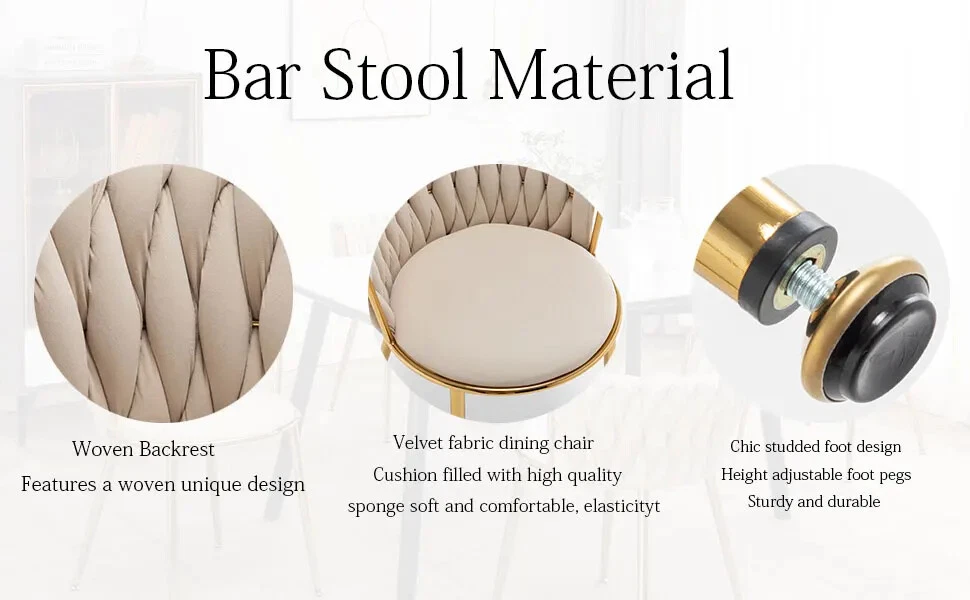 About this item Unique Design: This classic dining chair features a woven backrest design with a gold-plated metal frame for a beautiful and luxurious look. Comfortable Dining Chair: Velvet fabric is comfortable and soft to the touch, high-density sponge cushion, ergonomic tufted backrest, providing better comfort for you and your family. Strong Frame: The dining chair frame is made of solid wood and thickened metal, so the dining side chair is very stable and can support up to 200 pounds. Each leg has height-adjustable pegs, which makes the dining chair better to keep smooth. Versatile: This dining side chair is sturdy and compact and won't take up much space. The luxurious and elegant appearance makes it suitable for dining room, kitchen, living room, bedroom and powder room. Cushion size: 17.7 inches wide and 16.9 inches deep. Please look carefully when purchasing. Product sellpoints Dining Chairs Set Of 6|Velvet Upholstery & Gold Metal Legs:Luxurious velvet upholstery paired with elegant gold metal legs for a sophisticated dining experience. Ergonomic Tufted Backrest:Ergonomically designed tufted backrest ensures comfort during long dinners. Sturdy Woven Backrest:Durable woven backrest offers a classic design with lasting support. Adjustable Height Metal Legs:Adjustable pegs on the metal legs provide stability and smoothness on uneven floors. Versatile Dining & Accent Chair:Versatile design suitable for dining rooms, kitchens, living rooms, and more. Product Description