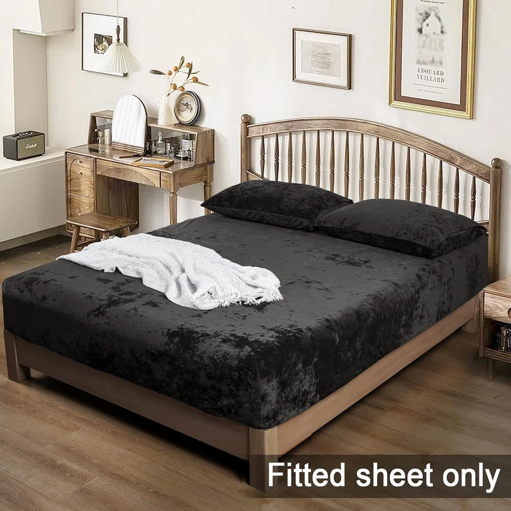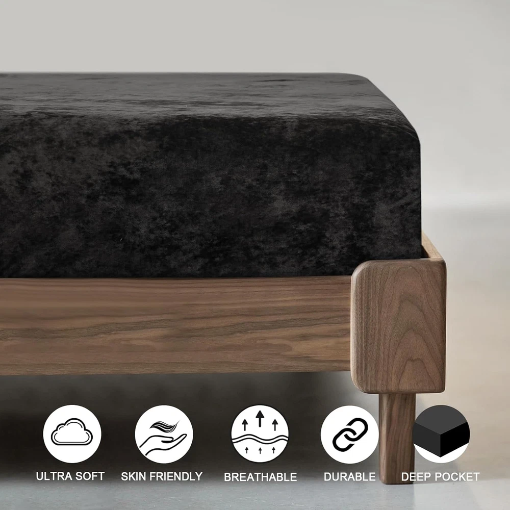 Chosen Velvet Fabric: The fitted sheet is made of 100% selected velvet fabric, fluffy, soft and skin-friendly, providing comfy and cozy sleeping experience for you and your family. Elegant Appearance: The velvet fabric with specail craftsmanship feature not only soft and uinform luster, but also amazing light and shadow effect in different light intensity and angle. Giving a luxurious allure for an impressive coordinating foundation with our premium velvet fitted sheet. Secure & Snug Fit: Measuring 80" by 60" with 15" deep pocket, our fitted sheet is designed for all queen sized bed mattress. With full and reinforced elastic band at backside, it will safely and securely cover your mattress. Easy Care: Machine wash separately in cold water, gentle cycle. Do not bleach. Tumble dry on low heat or lay flat to dry. Remove promptly. Warm iron as needed. No pilling, no shrink, no fade, no shed, labor tests show that the velvet fitted sheet keep its shape and stay brands new after 102+ wash cycles. Package Include: PHF Super Soft Velvet Fitted Sheet Queen(80" x 60" x15''), perfect for queen sized bed mattress. Product Description The video showcases the product in use. The video guides you through product setup. The video compares multiple products. The video shows the product being unpacked. Selected Velvet PHF fitted sheet is made of 100% selected velvet, sumptuously soft, fluffy and cozy, providing extreme comfort for sweet sleep. Due to a gentle textile process that ensures no shedding or pilling. 360° Extra Strong Elastic Each fitted sheet has full encased elastic band covered with self-fabric at the bottom, can fit your bed mattress snugly and safely without any shifting. 15 Inches Deep Pocket Our premium fitted sheet with deep pocket can stretches up to 15 inches, pull snugly over any mattress up to 15 inches effortlessly and simply, go neatly round the corners to stay in place. Easy to Use Its stretchy or elasticized edges make it a breeze to slip on and off, saving time and effort during bed making and changing linens. 1 Multiple Colors 2 Size Refrence PHF Luxurious & Cozy Fitted Sheet Material Truly Velvet Truly Velvet 100% Washed Cotton 100% Viscose Made from Bamboo Truly Velvet Size Twin/Full/Queen/King/CK Twin/Queen/King Twin/Full/Queen/King Twin/Queen/King Twin/Queen/King Color 10 Colors Available 6 Colors Available 12 Colors Available 11 Colors Available 5 Colors Available Price 28.99-37.99 25.99-32.99 21.99-27.99 25.99-35.99 26.99-33.99 Features Elegant Appearance, Soft, Warm Ultra Soft, Warm Cooling, Breathable Soft, Skin-friendly Soft, Skin-friendly Season Autumn,Winter Autumn,Winter Spring, Summer All Season Fall Winter and Spring