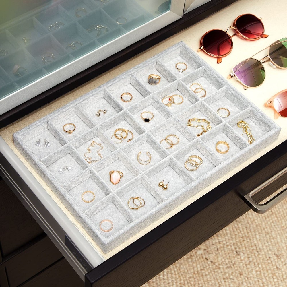 Velvet Jewelry Organizer Tray for Earrings, Stackable 24 Grid Storage for Rings (Gray, 14x10 in) Stackable Earring Tray: Use this 24 grid jewelry organizer to hold rings, earrings, necklaces, bracelets, and other small items; the trays easily fit in drawers and nightstands Home Organization: This velvet earring tray is ideal for giving as a gift to loved ones for weddings, anniversaries, birthdays, and Valentine's day; it easily stacks to save space Material: Our jewelry grid organizer is made of soft, quality velvet material and a durable wooden tray Dimensions: This gray stackable jewelry organizer measures 13.5 x 9.5 inches, are 1.2 inches thick and has 24 compartments measuring 2 x 2 inches Package Contents: In this pack, you will receive 1 gray velvet jewelry grid tray to organize and display all of your precious items Shipping We offer FREE shipping on all orders! We ship within Three business days of payment, usually sooner. We use a selection of shipping services such as UPS, FedEx, USPS etc. We only ship to the lower 48 states, no APO/FPO addresses or PO Boxes allowed. Local pickups and combined shipping options are not provided at this time. Return You can return a product for up to 30 days from the date you purchased it. Any product you return must be in the same condition you received it and in the original packaging. Please keep the receipt. Payment We accept payment by any of the following methods: PayPal Please pay as soon as possible after winning an auction, as that will allow us to post your item to you sooner! Feedback Customer satisfaction is very important to us. If you have any problem with your order, please contact us and we will do our best to make you satisfied. Contact Us If you have any queries, please contact us via ebay. We usually respond within 24 hours on weekdays. Please visit our eBay store to check out other items for sale! Thank you for shopping at our store.