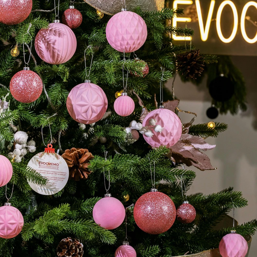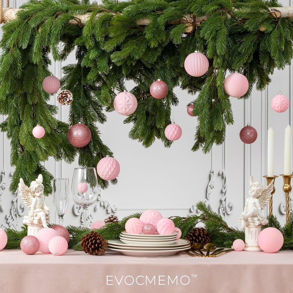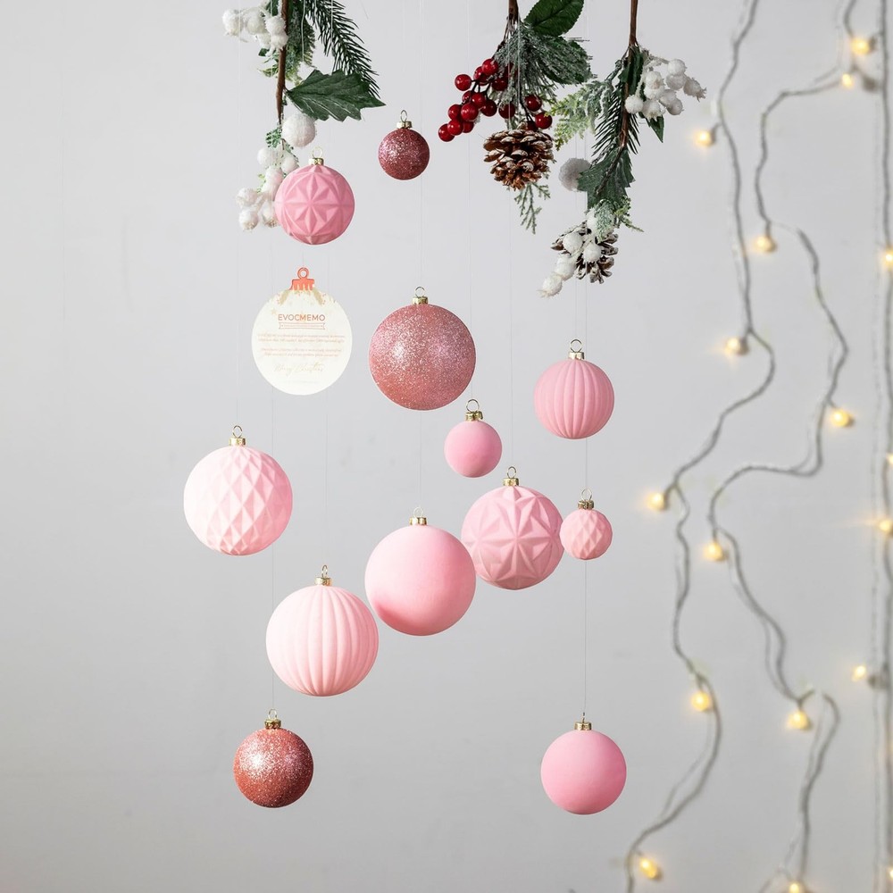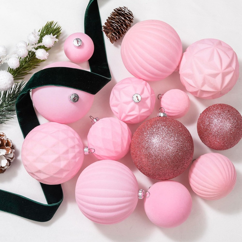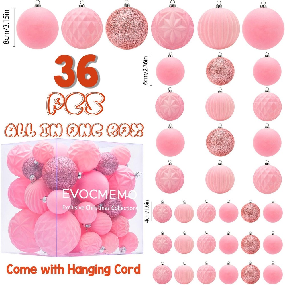 "36pcs Christmas Ornaments Set includes: Small Ball Ornaments(1.57""/40mm)x18pcs; Medium Ball Ornaments(2.36""/60mm)x12pcs; Large Ball Ornaments(3.16""/80mm)x6pcs; In Velvet Flocked and Glitter Finishes with 5 differents Styles. Available in 11 colors. Come with Metal Ornament Caps and Hanging Cord Shatterproof and Sturdy Unique Velvet Texures Vintage and Luxury Designs" Vintage & Exquisite Christmas Ornaments: Enhance your holiday decor with our 2024 exclusive Christmas collection of handcraft velvet flocked Christmas ornaments. This set offers three versatile sizes and a delightful range of color combinations. Craft a captivating Christmas display that embodies the festive spirit with this comprehensive set. Unique Velvet Texture: Our ornaments stand out with their unique velvet texture and classic pink christmas hues. Includes 18pcs small(1.57"/40mm), 12pcs medium(2.36"/60mm) and 6pcs large(3.16"/80mm)ball ornaments, the subtle elegance of these pieces makes them a versatile choice for any holiday theme. Shatterproof & Durable: Each ornament is meticulously crafted from sumptuous velvet textile and shatterproof polystyrene balls, seamlessly combining elegance with lightweight durability. Embrace the enchantment of handcrafted artistry and relish the allure of these ornaments without concerns of breakage. Metal Ornament Topper: Unlike others that use plastic ornaments caps, our Christmas decorations feature metal caps! With the delicate pattern on it, adds a touch of vintage flair to this Chrismtas ornaments set. Come with Hanging Cord: Our ornaments come ready-to-hang on a gold string. Hang them on your tree or suspended from ribbon, display tucked into your mantel and table decor. Beautiful accents as a bowl or basket filler. Minor color variations may occur due to individual monitor settings. These handcrafted ornaments bear unique distinctions in each piece, adding to their character and charm. Elevate your holiday decor with these versatile and sturdy ornaments, where elegance meets peace of mind.