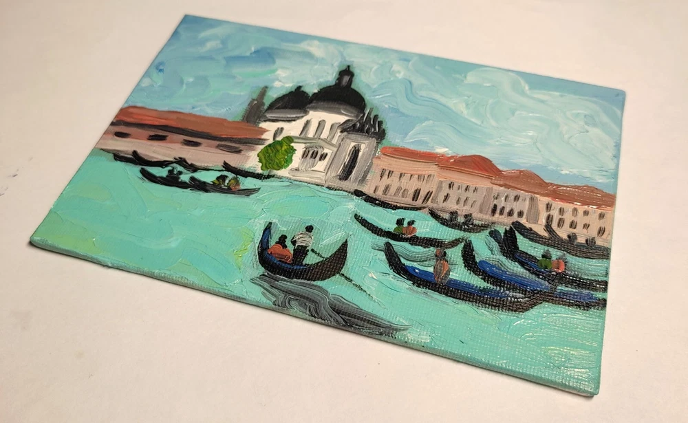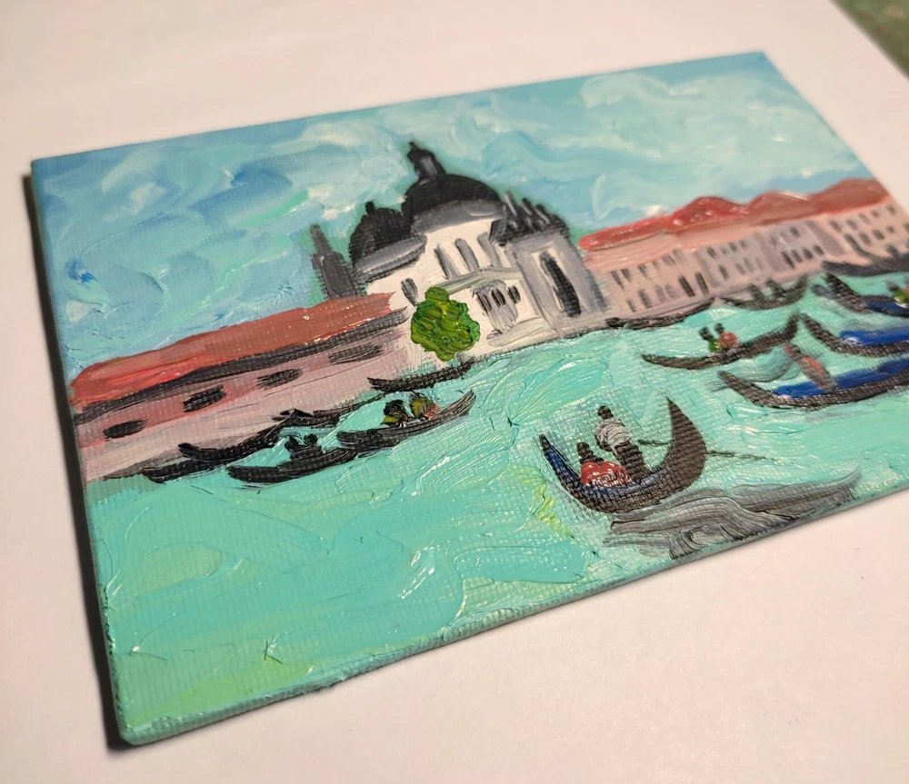 Venice Italy. Original Oil Painting (6''x4'' - 10x15 cm). Canvas board. Handling time for 1-3 days after receving your payment. Estimated shipping time is 15 to 30 business days. I ship Standard International Belarus post worldwide. Free shipping. The artist Veranika Krasnova (art name Roni Goldfinger) has been working for 15 years using the original and unique technique & "finger painting" technique, that determines the name of her paintings and art gallery. The subject of Roni’s interest is not only the technique of “finger painting”, but, as well, is the way of it’s artistic expression. She steps over the usual use of the paint brush using the oil paintings and turns it into an absolutely direct tactile way of communication with the canvas. That provides the highest relationship between the author and her works. When we talk about the art types and art works, where the object is not just an art-made, but a hand-made, we note that there is a special energy connection between the intellect, emotions, elusive fluids and psychological strings. As a rule, painting has an intermediary between the author and the canvas like a paint brush, paints, etc. Roni writes with her own hand using her own five-fingered brush: from the broadest (palm) to the thinnest (pinkie). They are full of bright fantasy and live joy, taken from her personal impressions and dreams. It would seem that Roni describes the famous countries, cities, motifs - basic textbook signs in her paintings: Red Lights - in Amsterdam, Moulin Rouge – in Paris, The Guard of the Pyramids of the Sphinx – in Egypt and etc. During the process of painting she uses her own outlook, gives her own perspective, changes the age of the actors if it’s required and remodels the world into the irony-free universe and a carnival bacchanalia. There is a place for everything inside her art: for always mutual love, for conversation always with the interlocutor, for partnered dancing, for meetings without parting. If you look for stylistic analogues of what Roni Goldfinger does, you will find out that it’s an obvious instinct that is not just played by a professional, but sincerely created by a person without the standards of professionalframeworks and canons.