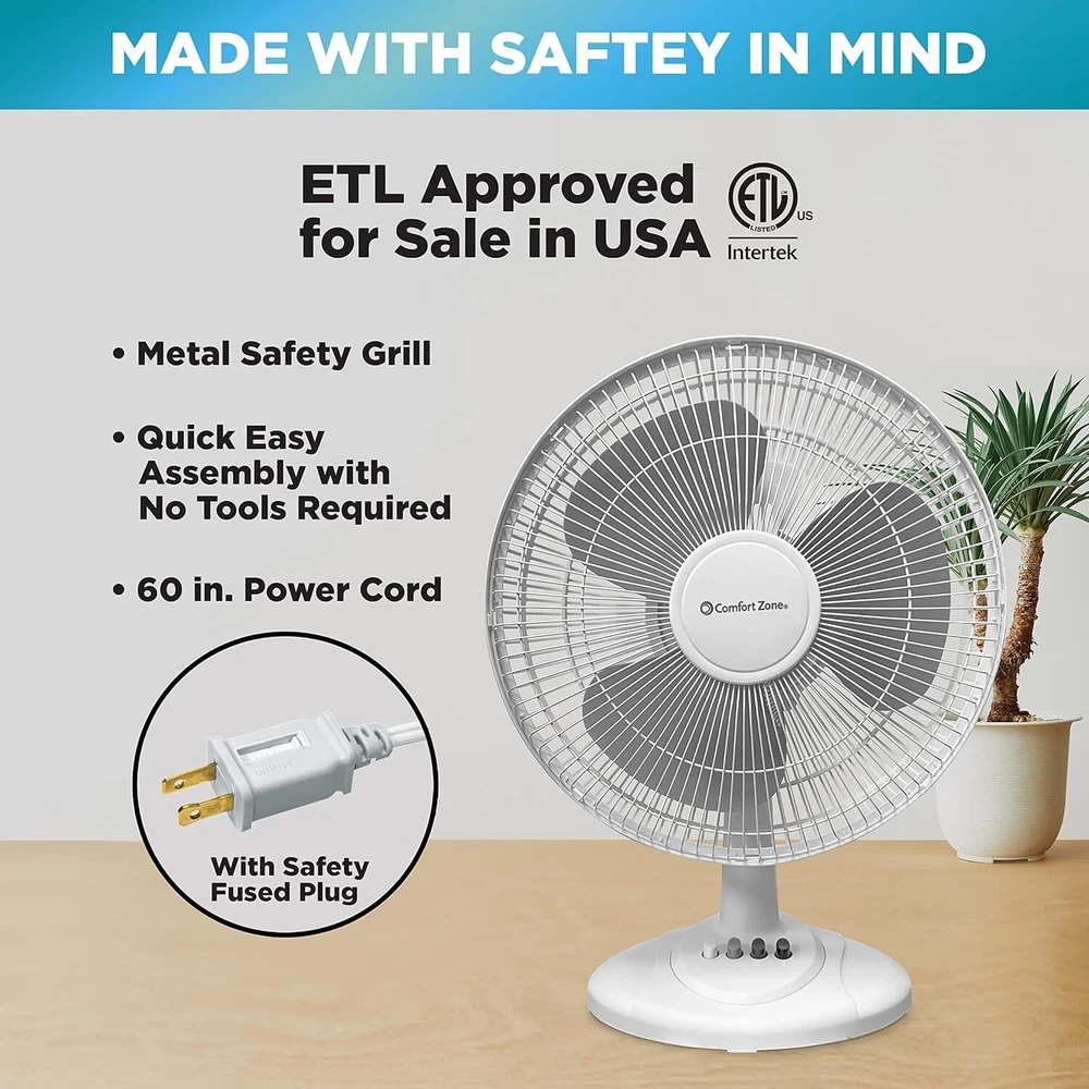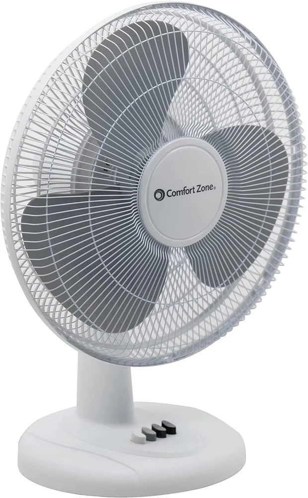 Comfort Zone 12 inch Table Fan with Adjustable Tilt, Wide Area 12", White Product Details Brand: Comfort Zone Color: White Electric fan design: Table Fan Power Source: Corded Electric Style: Classic Product Dimensions: 8.25"D x 16.25"W x 13.75"H Room Type: Bedroom, Living Room, Home Office Special Feature: Portable, Quiet Operation, Lightweight Recommended Uses For Product: Ventilating, Cooling, Air Circulation Noise Level: 55 dB Wattage: 37.2 watts Finish Type: Metal Number of Blades: 3 Air Flow Capacity: 210 Cubic Feet Per Minute Blade Length: 12 Inches Speed: 1436 RPM Voltage: 120 Collection Name: Electric Fans Switch Type: Push Button Item Weight: 4.8 Pounds Included Components: CZ121WT Table Fan, Product Manual, Cord Indoor/Outdoor Usage: Indoor Model Name: CZ121WT Specification Met: ETL Control Method: Touch Connector Type: 2-Pin Blade Material: Plastic Efficiency: 210.0 cubic_feet_per_minute Is Cordless?: No Number of Power Levels: 3 Main Power Connector Type: 2-Pin Manufacturer: Mr. Brands, LLC. Size: 12" Form Factor: Stand Alone Item Weight: 4.8 pounds Country of Origin: USA Item model number: CZ121WT Is Discontinued By Manufacturer: No Diameter: 12 Inches Finish types: Metal Care instructions: Hand Wash Assembly required: Yes Number of pieces: 1 Batteries required: No Mounting TypeController Type: Tabletop MountButton Control MaterialNumber of Speeds: Plastic3 CUSTOMIZABLE AIRFLOW: Experience personalized comfort with this oscillating fan's 3-speed controls. With easy-to-use push buttons, you can effortlessly switch between low, medium, and high speeds to find the perfect airflow for your needs. Whether you desire a gentle breeze or a powerful gust, this fan provides versatile options to keep you cool and comfortable. Enjoy complete control over your indoor environment with this convenient 3-speed oscillating fan. VERSATILE AIRFLOW CONTROL: Precise control over the direction & coverage of the airflow with this indoor fan. Featuring an adjustable tilt and oscillating design, you can easily customize the angle and range of the breeze to suit your preference. Whether you need a focused airflow for targeted cooling or a widespread circulation for a refreshing breeze, this fan can be angled, adjusted, and oscillated to create the perfect revitalizing airflow exactly where you need it. Stay cool and comfortable with the versatility of this quiet indoor fan. NOISE-FREE PERFORMANCE: Enjoy a peaceful and focused environment with this quiet office fan. Designed with a motor that operates almost silently, this fan ensures that your studying or office work remains undisturbed by any loud hum or irritating noises. Experience a tranquil atmosphere while staying cool and comfortable throughout your tasks, thanks to the quiet and efficient operation of this office fan. LONG-LASTING DURABILITY: This small oscillating table fan is designed with a strong focus on safety and durability. It features a robust metal grill that effectively shields the blades from debris, ensuring a safe and reliable operation. Built to withstand the test of time, this fan is crafted with high-quality materials to ensure its longevity and provide you with consistent airflow for years to come. Experience peace of mind knowing that your fan is not only efficient but also built to last. HASSLE-FREE ASSEMBLY: Enjoy a quick and effortless setup with this quiet room fan. Designed for your convenience, it features a user-friendly assembly process that allows you to easily attach the fan to the accompanying plastic base in just a matter of minutes. No complicated steps or tools required. Simply follow the straightforward instructions and have your fan up and running in no time. Experience the cooling comfort without any delays or frustrations with this hassle-free assembly design. Versatile 3-Speed Air Output With a three-speed air output design, this Comfort Zone 12" oscillating table fan can switch from gentle air circulation to a brisk, invigorating breeze with the push of a button. This versatile table fan offers a refreshing breeze that is suitable for hot summer days at your desk or humid nights beside your bed. Oscillating Design for Increased Air Circulation This quiet table fan is equipped with an oscillating fan head, which sways from side to side to create a gentle breeze throughout the entire room. The oscillating feature is ideal for living rooms, family movie nights and other group settings, or simply for creating a consistent breeze in a small room. Quiet Motor for Minimal Sound A great option for those who need a fan to sleep, this quiet fan for bedrooms creates very little noise, even when on its fastest speed function. It provides a gentle, consistent breeze while creating minimal sound, which can help provide relief on hot and humid nights. Adjustable Tilt for Added Control To ensure the fan is always blowing air in the direction you want, this 3-speed oscillating fan includes an adjustable tilt, which can be pointed up or down to direct the air flow with more precision. This provides steady relief from the heat on hot summer afternoons and can be used as a sleeping fan with added control over the output.