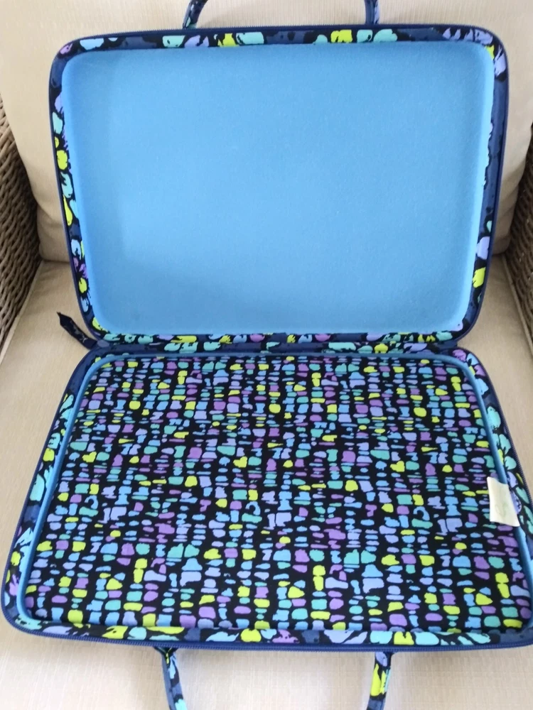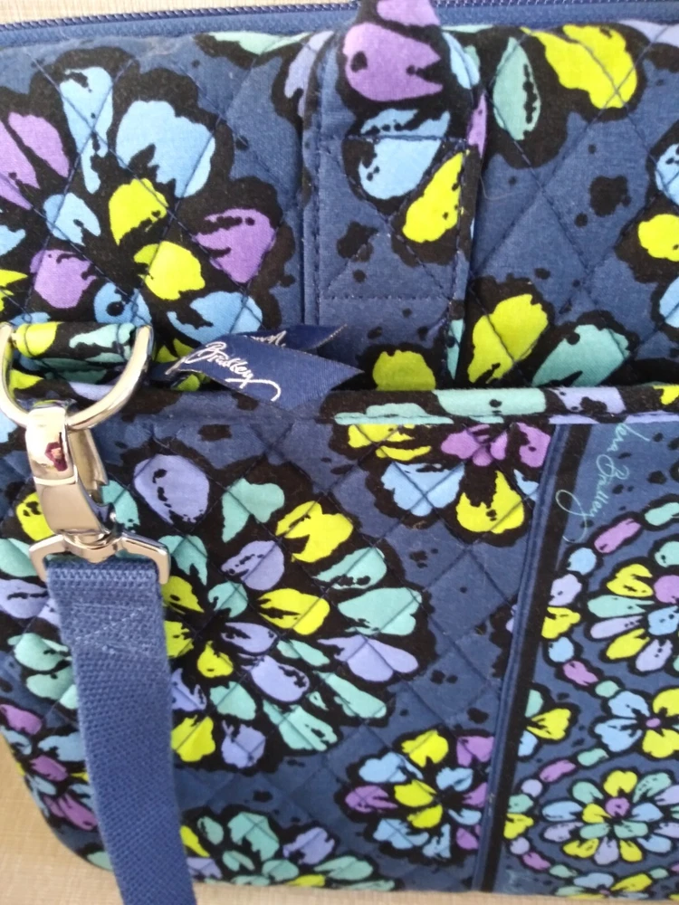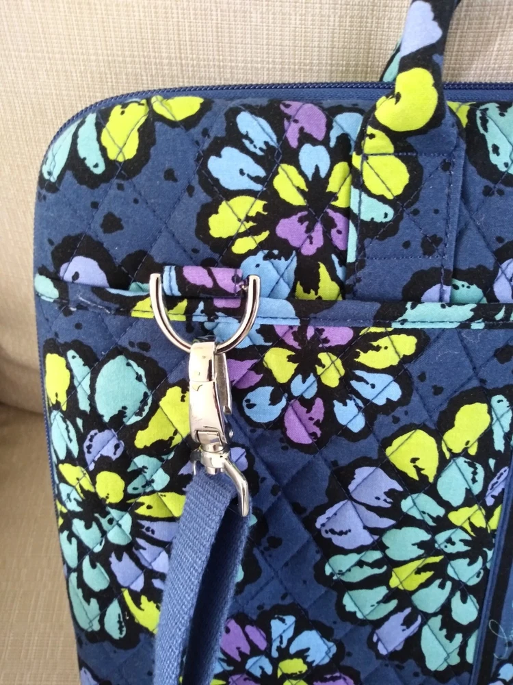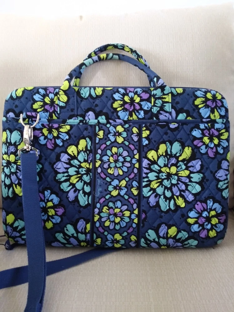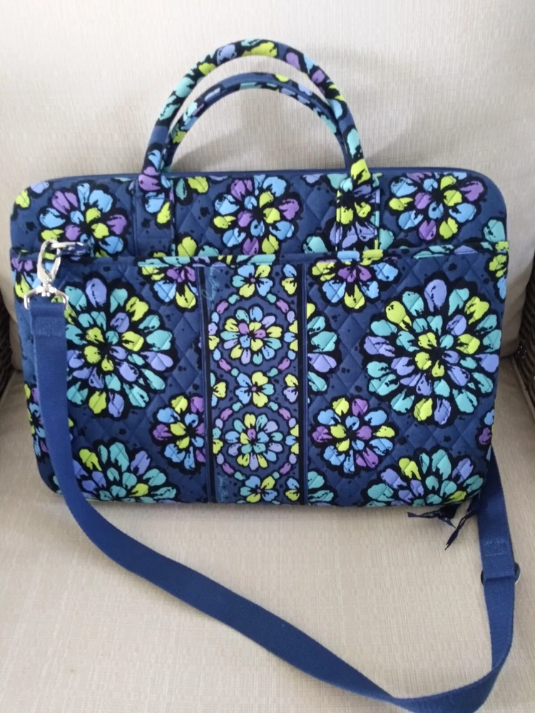 Bag has full length zipper closure pocket on the front and full length slip in pocket in the back Detachable adjustable shoulder strap Will hold loptop measuring 16"×11" or less Bag is in good condition with no stains or wear of fabric