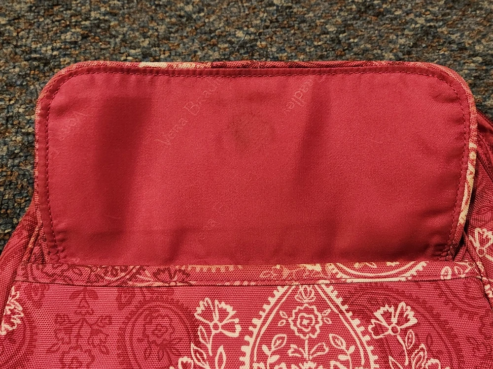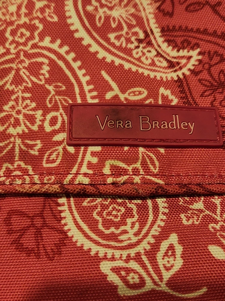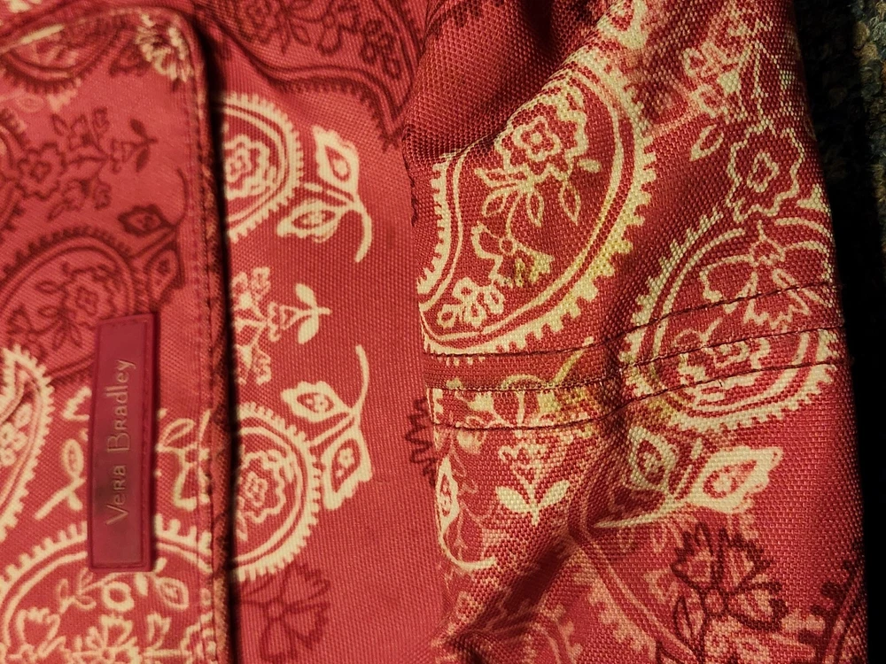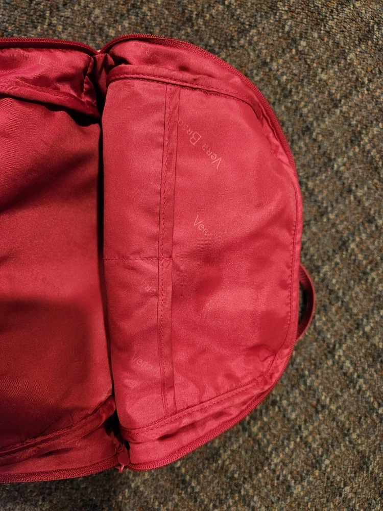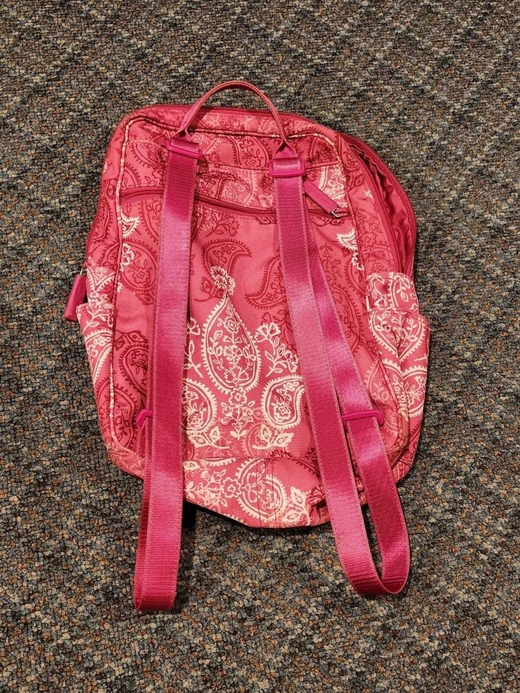 This Vera Bradley Canvas Backpack in a medium size is perfect for any occasion whether it be travel, casual, workwear or business. The backpack features a rectangular shape with a quilted finish and double straps for comfortable wear. The pink exterior color with silver hardware adds a touch of elegance to the design. The backpack is lined with cotton and fabric and includes inner pockets, outer pockets, an organizer, and a laptop sleeve for added convenience. The backpack is also lightweight, eco-friendly, and includes a mobile phone pocket, bottle pocket, and limited edition design. This backpack is a must-have for any Vera Bradley fan and is perfect for everyday use. Bag is used and has ware as shown.