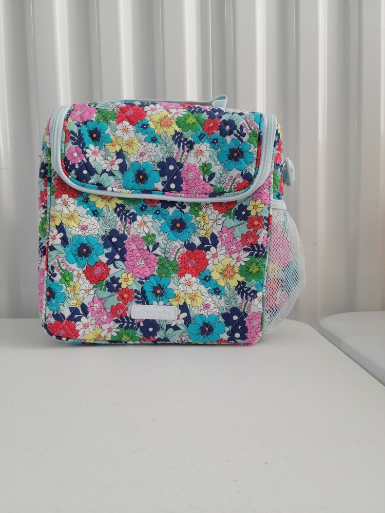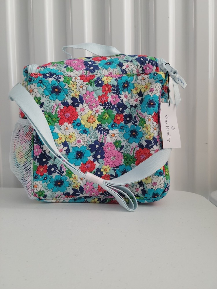 This colorful Vera Bradley lunch tote is perfect for any stylish woman on the go. The exterior is made of durable cotton with a beautiful floral pattern and a quilted finish. The bag has a zip closure and features a cotton handle/strap in a multicolor design. This medium-sized tote is ideal for carrying all your lunch essentials. The interior is vinyl lined for easy clean-up. Whether you're heading to work or out for a day with friends, this bag is sure to complement your style.