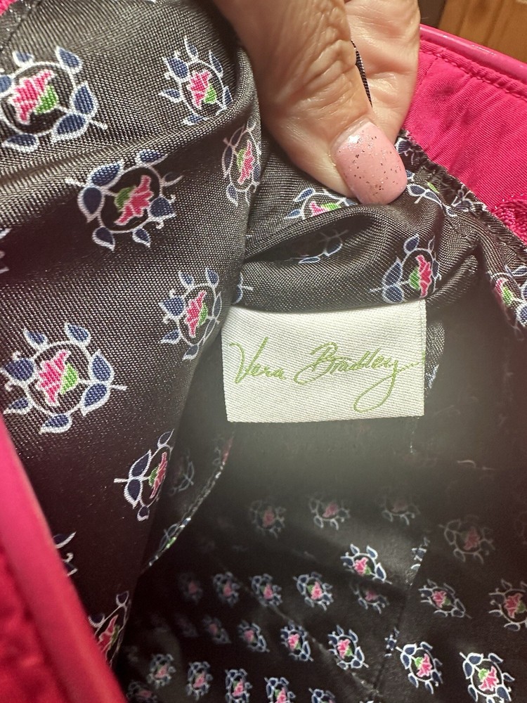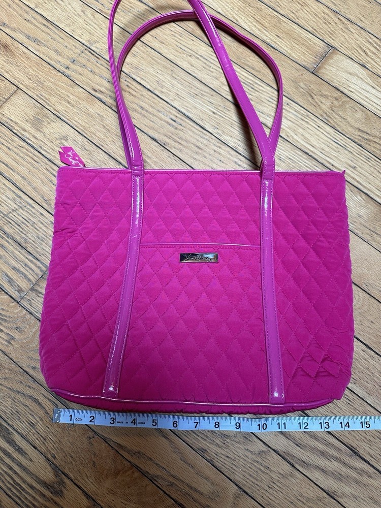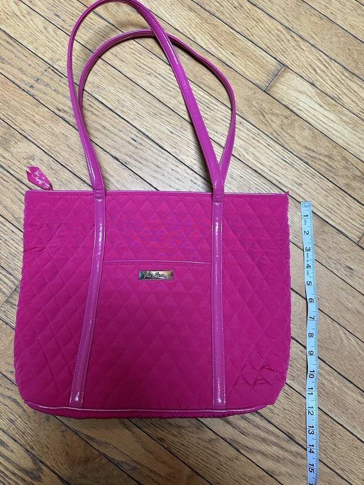 This VERA BRADLEY tote is a stylish and functional accessory for any woman. The fuchsia color and quilted finish add a touch of elegance to any outfit. The zipper closure provides a secure and convenient way to carry your belongings. The microfiber material is durable and easy to clean, making it a practical choice for everyday use. Patent leather fuchsia shoulder straps