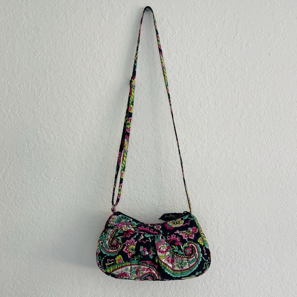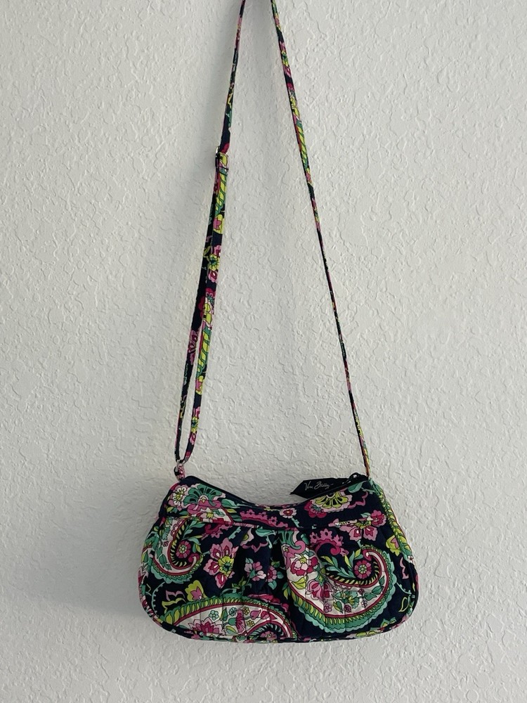 Shape: Crescent Finish: Quilted Bag Width: 10 in Accents: Zipper Style: Crossbody Fabric Type: Knit Personalize: No Strap Drop: Adjustable Theme: Flower Handle Style: Crossbody Strap Closure: Zip Vintage: No Pattern: Paisley Handle/Strap Material: Cotton Lining Color: Multicolor Exterior Color: Multicolor Hardware Color: Silver Bag Height: 5 in Customized: No MPN: FRANNIE Product Line: Vera Bradley Frannie Department: Women Size: Small Bag Depth: 3 in Brand: Vera Bradley Exterior Material: Cotton Features: Adjustable Strap Model: Frannie Handle/Strap Color: Multicolor Occasion: Crossbody Lining Material: Cotton Handmade: No