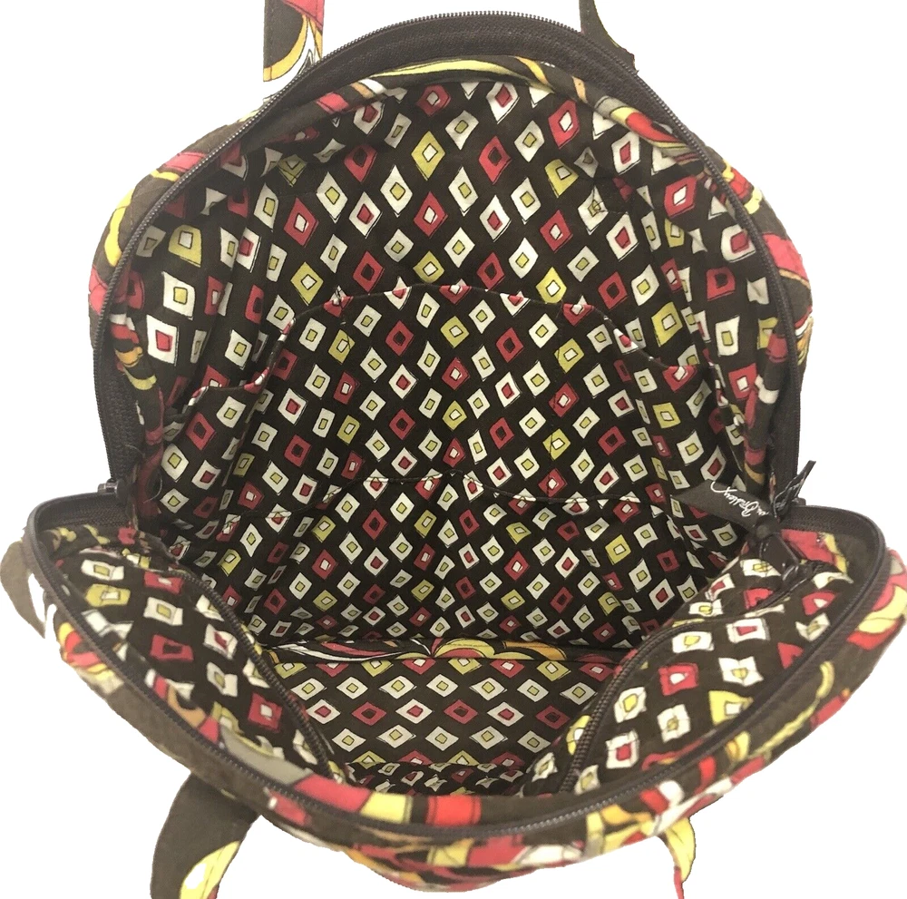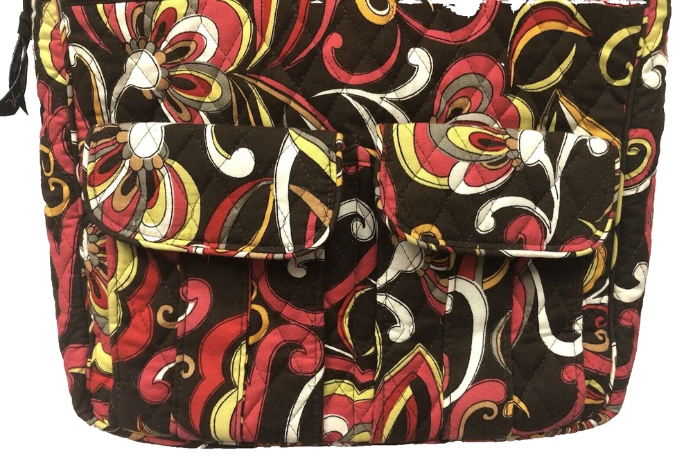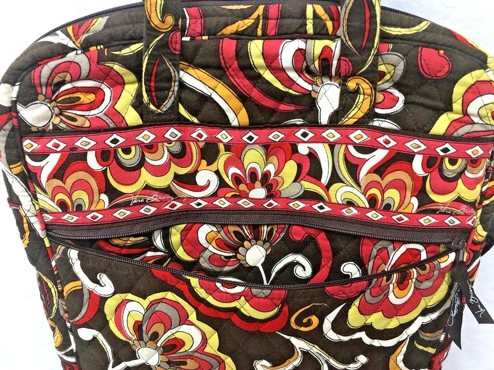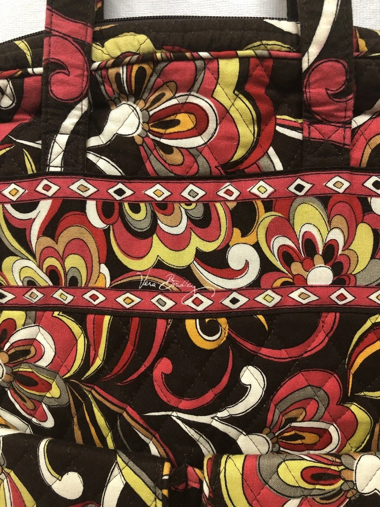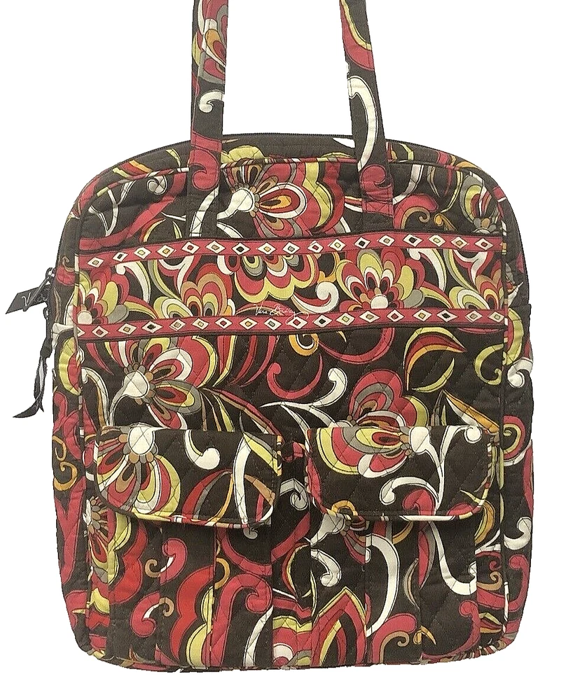 Vera Bradley Large Tote Handbag Purse Multicolored Red Yellow Brown. Lots of pockets zippered and snap 13” strap Dimensions 14” x 12” x 3.5” CONDITION Preowned Good small faint stain smaller than a pea Inner zipper coating is rubbing off See all pictures for details Please contact us with any questions or concerns. Thanks!