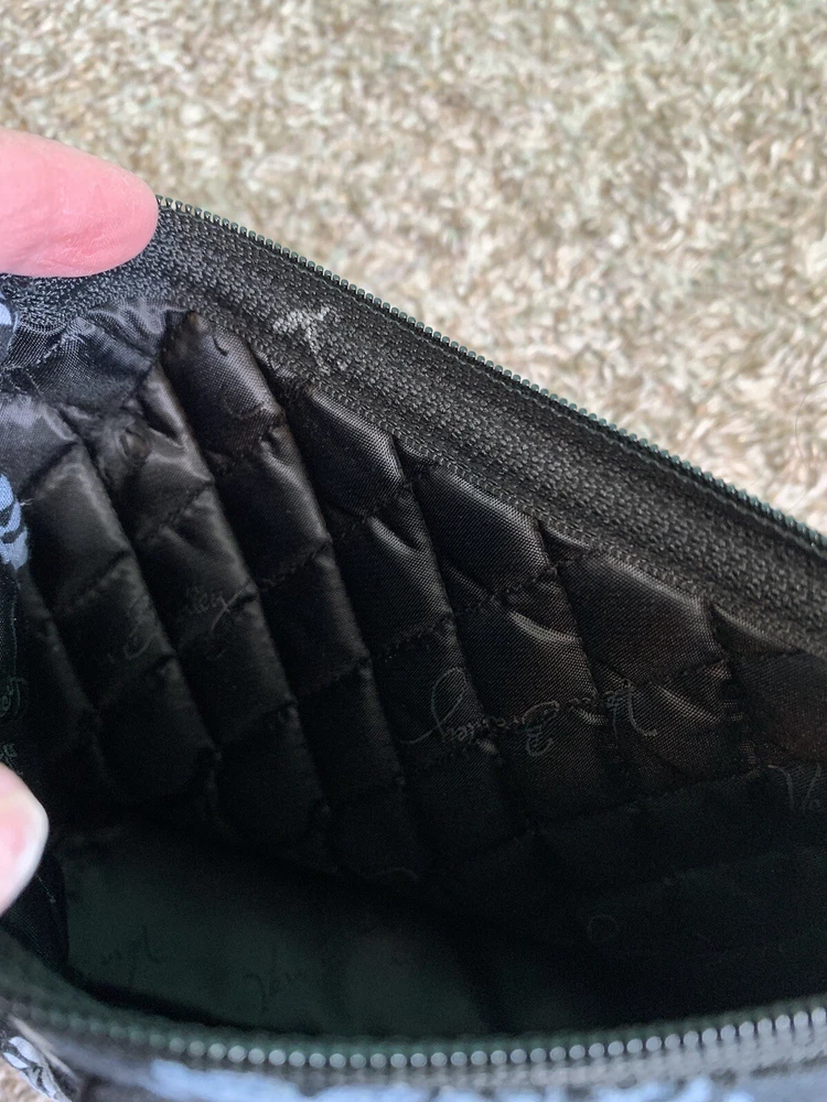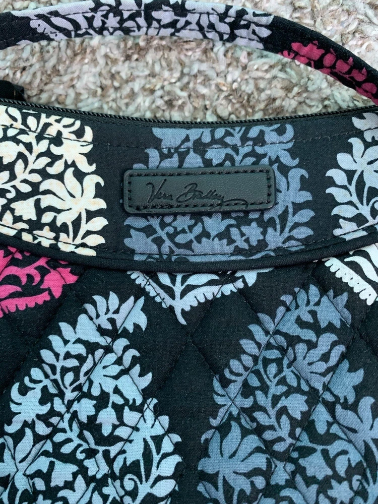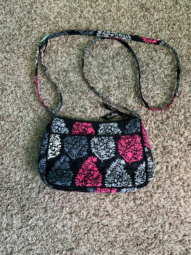 Vera Bradley quilted crossbody Black pink grey white print Approximate measurement 8” width, 6” height, 2” depth, 55” strap at longest Adjustable strap Zip closure, pocket on outside Good condition
