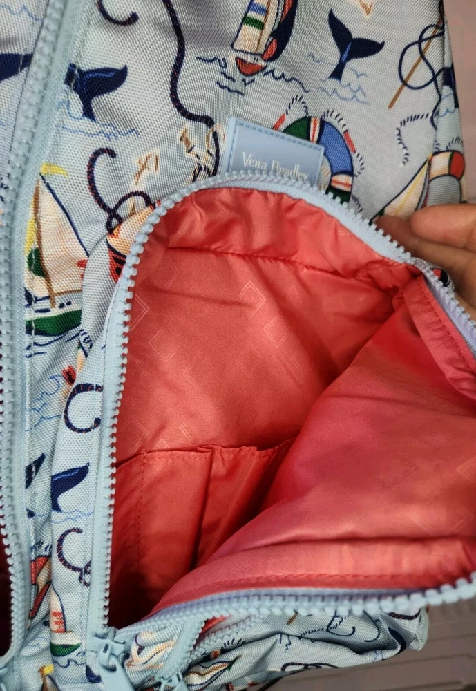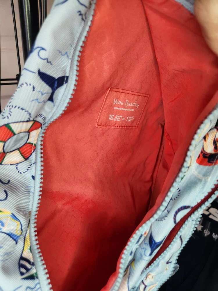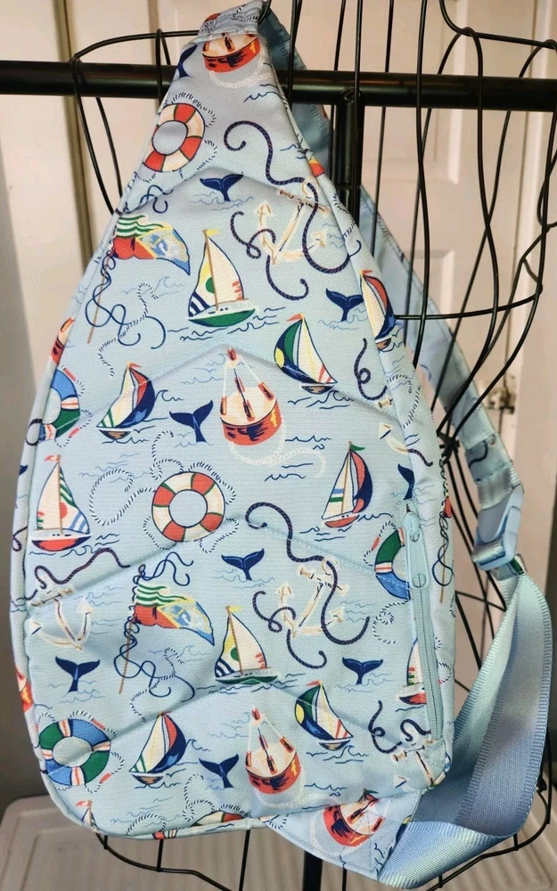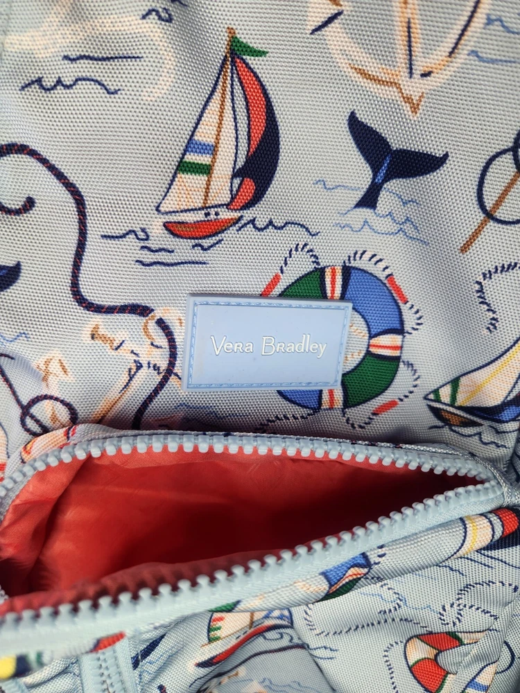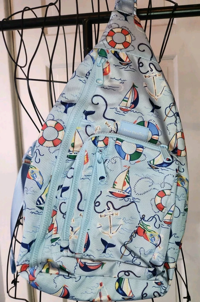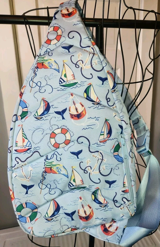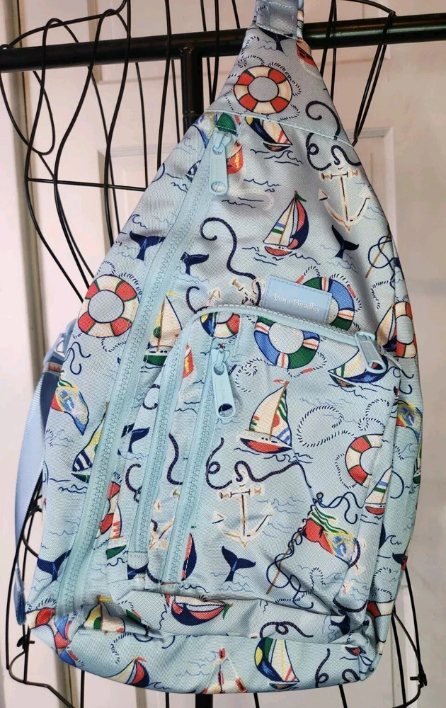 This Vera Bradley Reactive Sling Backpack in "Really Regatta" features a nautical theme and coral lining. This medium-sized backpack has a triangular shape with a zip closure, blue handle/strap, and has an adjustable cross-body strap as well. It's nice and lightweight and perfect for that beach or lake outing. This item is pre-owned and in excellent condition! Ships fast!