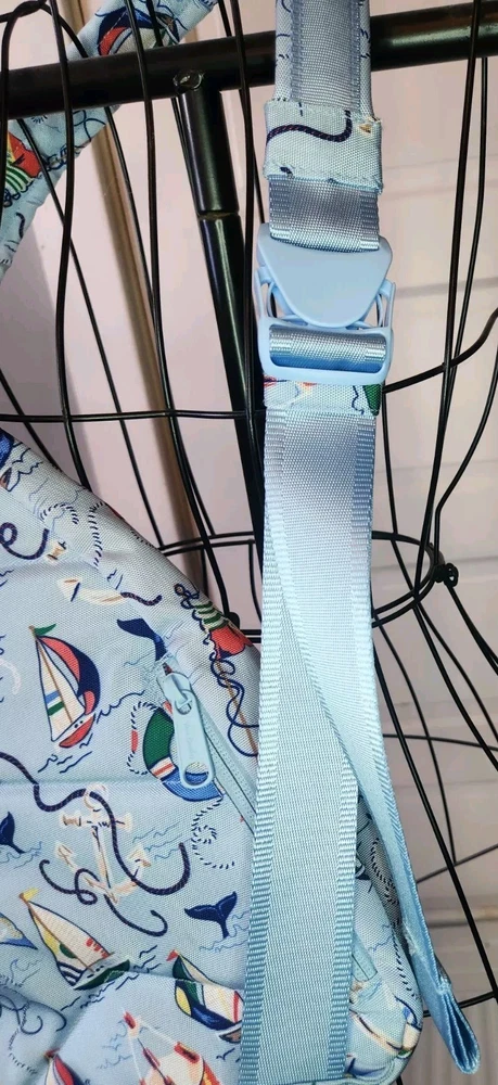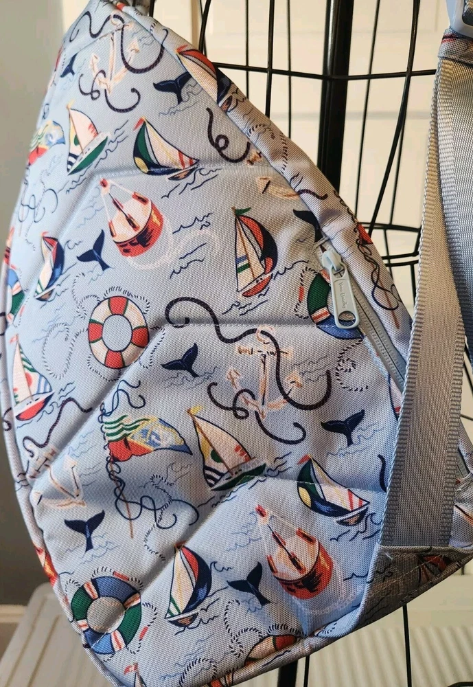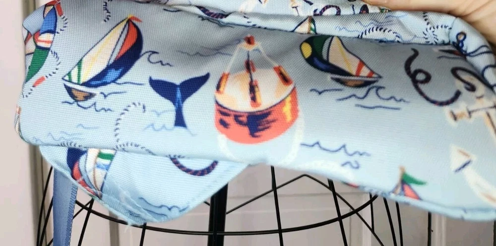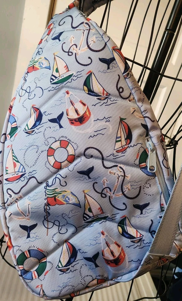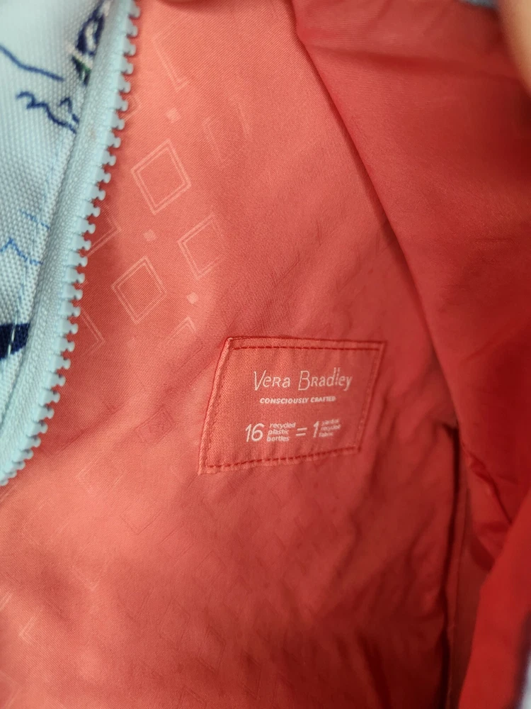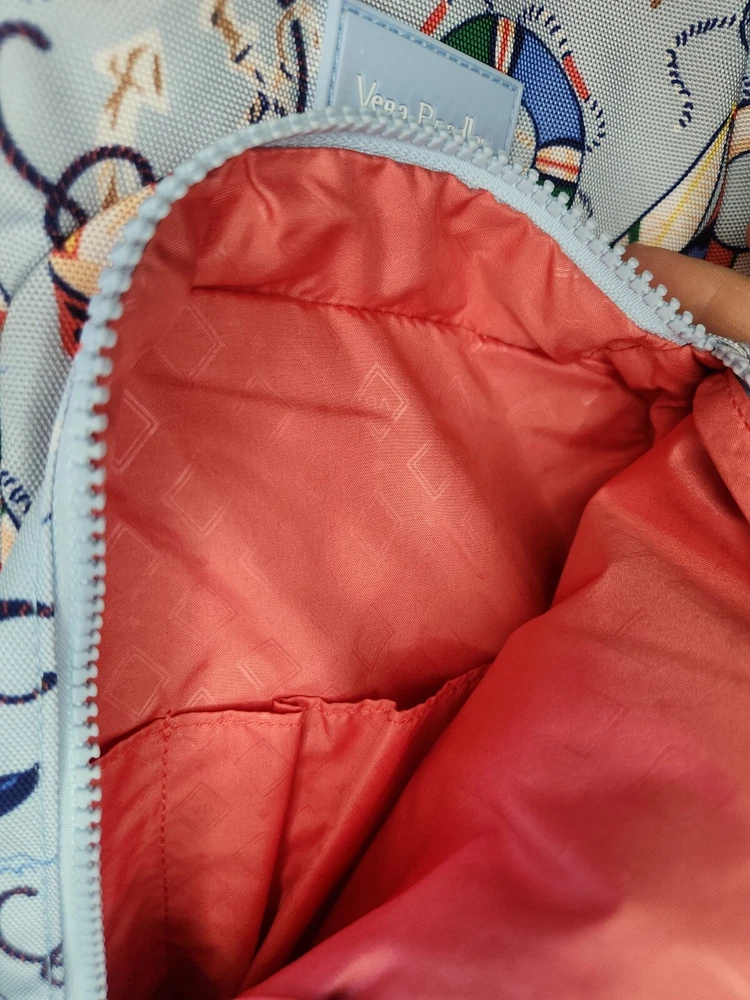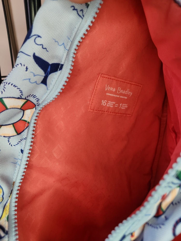This Vera Bradley Reactive Sling Backpack in "Really Regatta" features a nautical theme and coral lining. This medium-sized backpack has a triangular shape with a zip closure, blue handle/strap, and has an adjustable cross-body strap as well. It's nice and lightweight and perfect for that beach or lake outing. This item is pre-owned and in excellent condition! Ships fast!