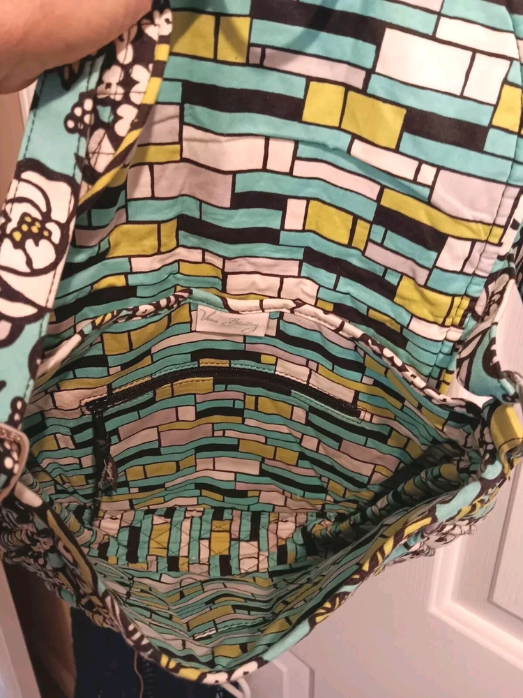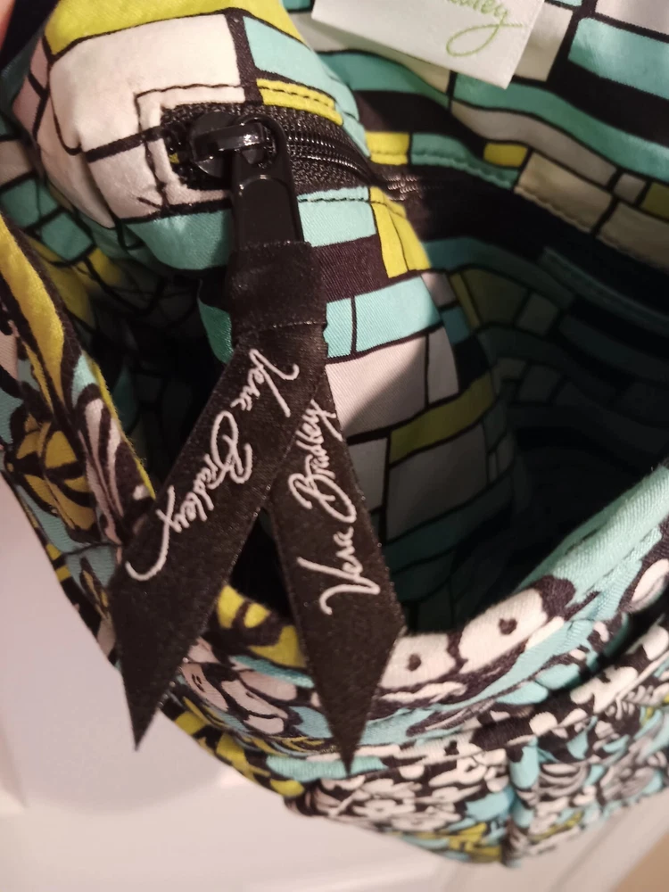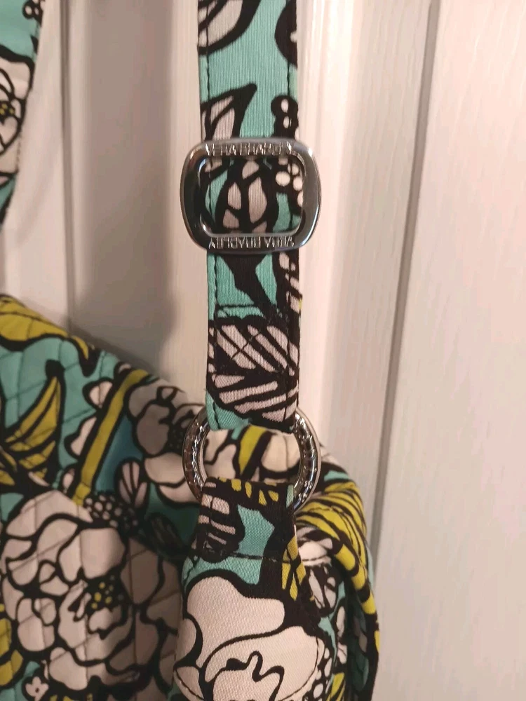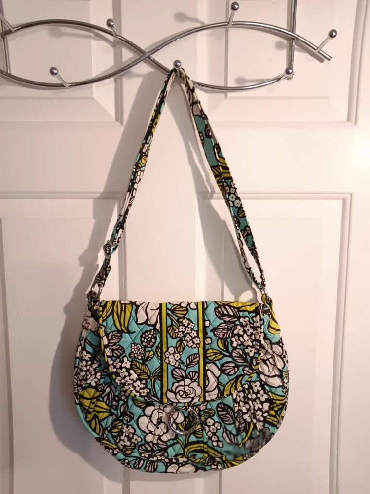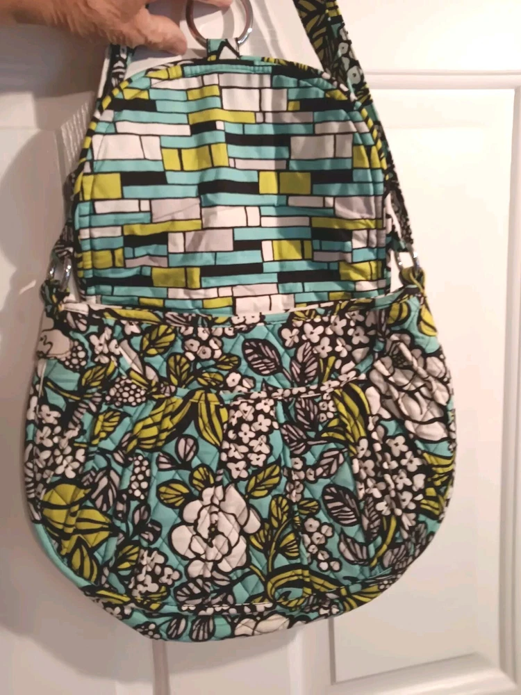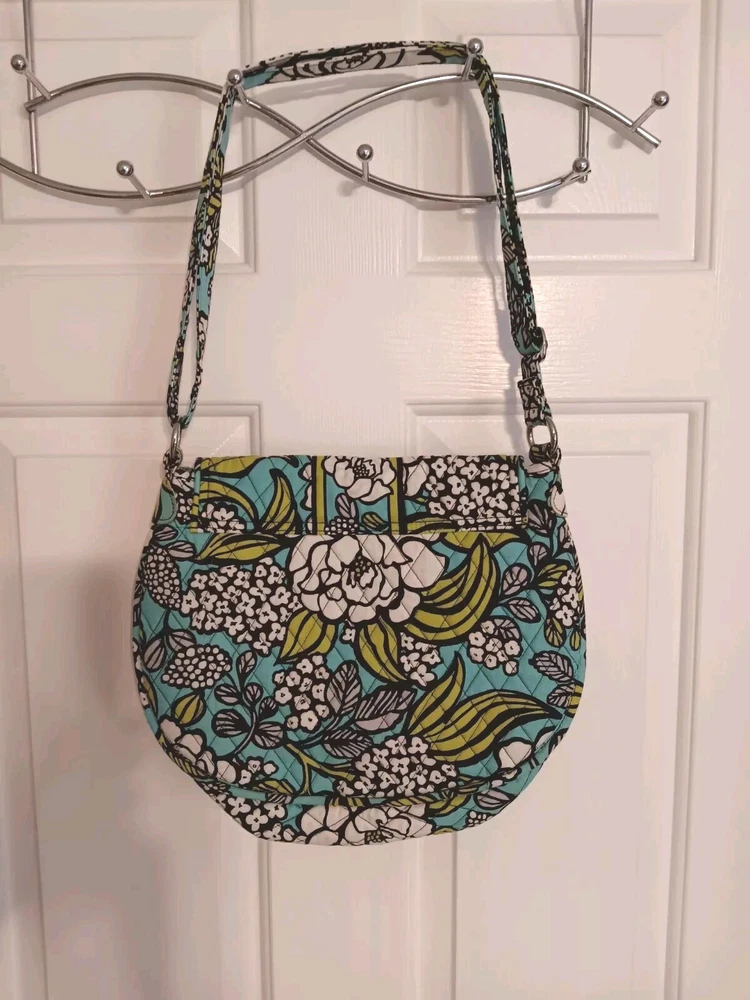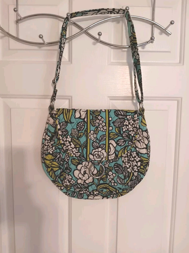 This beautiful Vera Bradley crossbody bag is perfect for any fashion-forward woman. The exterior is a stunning white color with blue and green floral patterns that add a pop of color to any outfit. The bag features a white handle/strap color and white hardware color, making it a versatile accessory for any occasion. The interior is lined with a matching white color, providing ample space for all your essentials. With its stylish design and functional features, this crossbody bag is a must-have for any woman on the go.