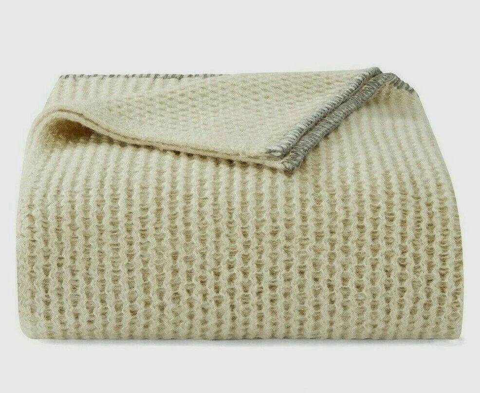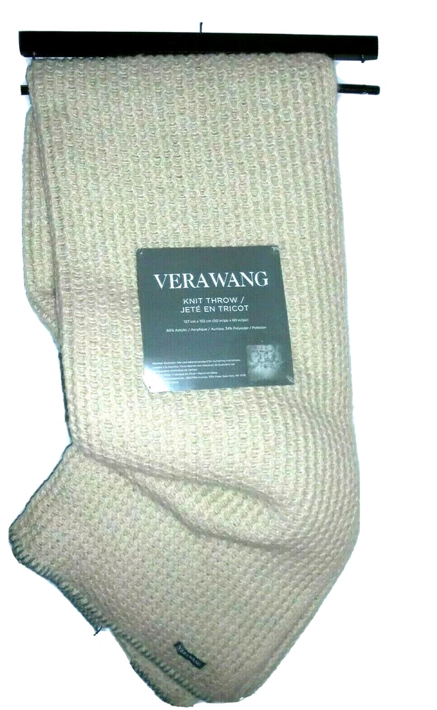 Vera Wang Heather Knit Throw size: 50" x 60" color: Beige acrylic / polyester blend knit machine washable soft luxurious knit for year round use whip-stitch detail on edges in grey zipE