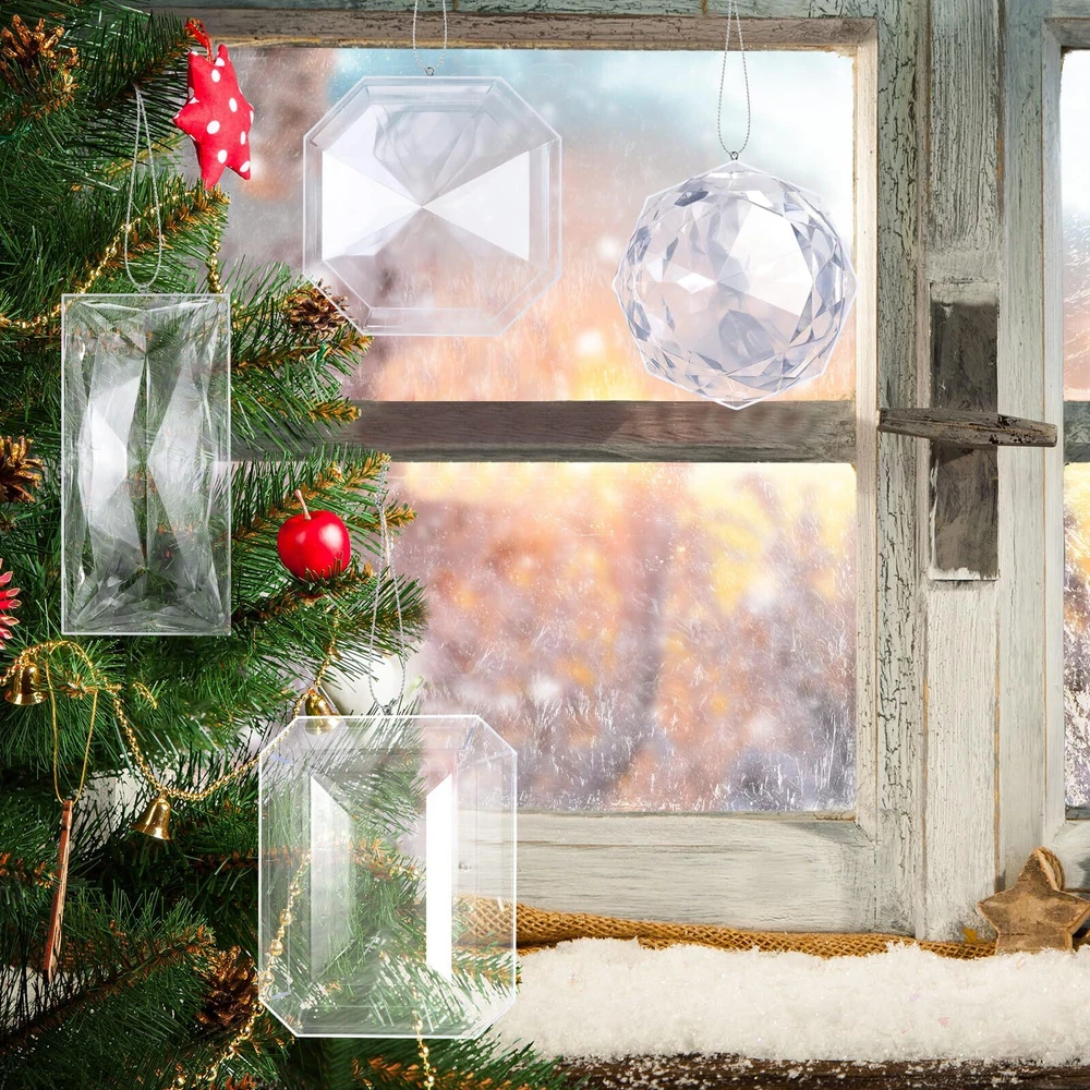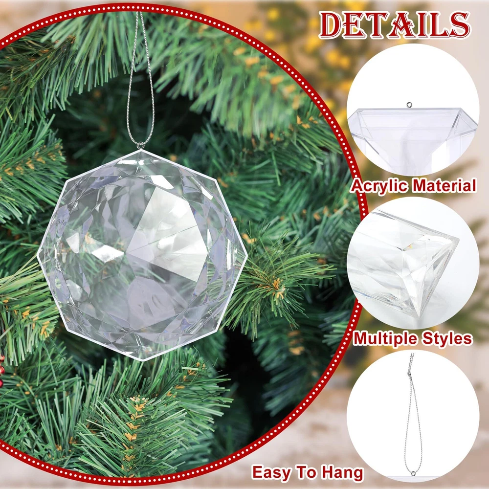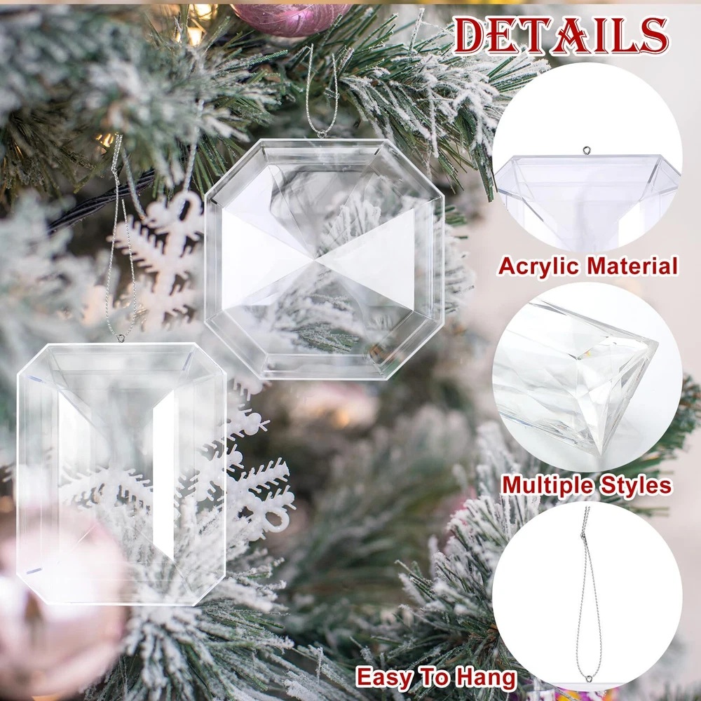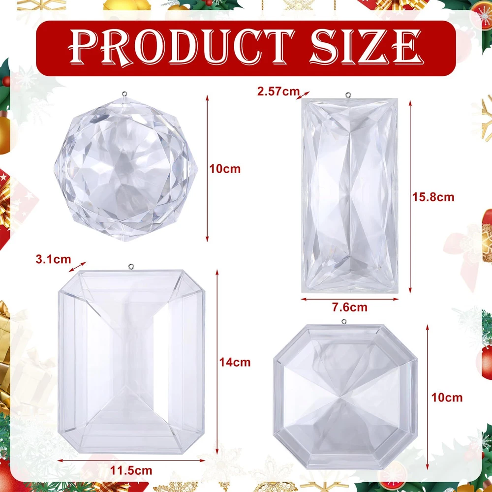 Features: Ideal Christmas gift: The Christmas acrylic hanging decoration is an ideal gift choice for most occasions, and it makes a surprise for your friend or your family on Birthday or mothers day gifts, celebration and wedding decor. Creates a festival atmosphere: This glitter Christmas ornament adds a elegant touch to your Christmas decorations, and its silver exquisite appearance can be matched with other Christmas decorations (not included) as your Christmas decorations to increase the warm atmosphere. Specifications: Material: acrylic Color: silver Size: Large: about 6.2 x 3.0 x 1 inches(L x H x W) Middle: about 5.5 x 4.5 x 1.2 inches(L x H x W) Small: about 3.9 x 3.9 inches(L x H) Package includes: 4 x Glitter Christmas jewel ornament Notes: Manual measurement, please allow slight errors on size. The color may exist a slight difference due to different screen displays. Package Includes: you will receive 4 pcs different styles of jewel ornaments, with 3 sizes, including 5.5 x 4.5 x 1.2 inches, 6.2 x 3.0 x 1 inches, and 3.9 x 3.9 inches, each equipped with hanging ropes, the appropriate size can meet your decorative needs Various Silver Appearance Designs: the Christmas hanging ornaments are designed with various silver appearances with angular shapes, including tortoise shell shape, rectangular, square rhombus and round rhombus, creating a stunning visual impact Quality Material: the silver Christmas acrylic decorations are made of quality acrylic, which is sturdy and shiny in the light; This kind of gem ornaments has strong color fixation ability and can keep the color bright after a long time of use Easy to Hang: each Xmas jewel ornament has a rope, and it is pre-installed, no need to thread the rope yourself, you can effortlessly display it on your Christmas tree, garland or anywhere you want to hang the glass Christmas decoration Wide Application: these Christmas tree ornaments are ideal decorations in home, party, and it also suitable for Christmas, Thanksgiving, weddings, etc, you can also DIY your wreath, garland, and balls painting by our jewel Christmas decorations