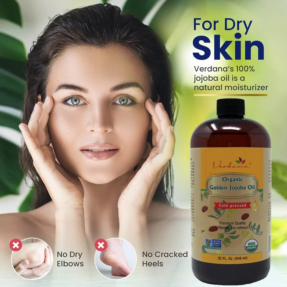 Verdana Organic USDA Certified Organic Golden Jojoba Oil, Cold Pressed, Unrefined, 32 Fl Oz Bulk size - Deepthi Organics Product Details Size: 32 Fl Oz (Pack of 1) Brand: Verdana MPN: 103O-32 UPC: 040232359101 EAN: 0040232359101 Brand: Verdana Item Volume: 32 Fluid Ounces Item dimensions L x W x H: 6 x 2 x 7.5 inches Age Range (Description): Adult Special Feature: Non Comedogenic Product Dimensions : 6 x 2 x 7.5 inches; 2 Pounds UPC : Manufacturer : Organic Verdana USDA ORGANIC JOJOBA OIL: The Verdana jojoba oil is simply 100% Organic Simmondsia chinensis (jojoba seed) oil nothing added and nothing removed. The oil is USDA NOP certified organic, vegan, and free of GMOs. We left this pure jojoba oil in its natural state so that you can use it straight from the bottle or add it to other beauty products. FOR DRY SKIN: Dont you just hate it when your elbows or heels get so dry that they crack? Verdanas 100% jojoba oil is a natural moisturizer, very similar to the sebum that the skin naturally produces. Its safe to use as a facial moisturizer. Gently massage a few drops into the desired area according to your personal preference. FOR DRY HAIR: Are you sick of frizzy hair that has a mind of its own? Tame your frizzy hair and boost hair growth with Verdanas virgin jojoba oil. This also helps with itchy or flaky scalp. Add a few drops to your shampoo or directly to your damp hair. Massage it in to your scalp according to your personal preference. Rejuvenate brittle, frizzy, and dry hair with our jojoba oil. FOR RAZOR BURN: This natural filtered jojoba oil is the perfect solution for razor burn, being non-allergenic and non-comedogenic. Apply the organic oil before shaving to create a smooth surface for shaving. Then, apply it after to moisturize your skin and help cuts heal. NATURAL MAKEUP REMOVER: Our cold pressed jojoba oil is a natural way to remove your makeup every day. Avoid extra dry skin that comes from some makeup removers. Add a few drops to a cotton ball or pad and gently wipe off your makeup. If you have very dry skin, jojoba oil will help to moisturize the areas where you removed the makeup.
