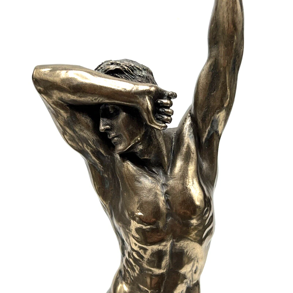 The Veronese Design Merman sculpture is a 7 7/8" tall piece made of bronze and resin, featuring a merman stretching on a rock. It has an antique bronze finish and an eclectic style, perfect for home decoration. The tabletop sculpture has dimensions of 4.25"D x 5.5"W x 7.5"H and weighs 1.4 pounds. Ideal for Mothers or Father's Day, it adds an architectural theme to any space. I will pack with care and get it to you ASAP /thanks for looking !