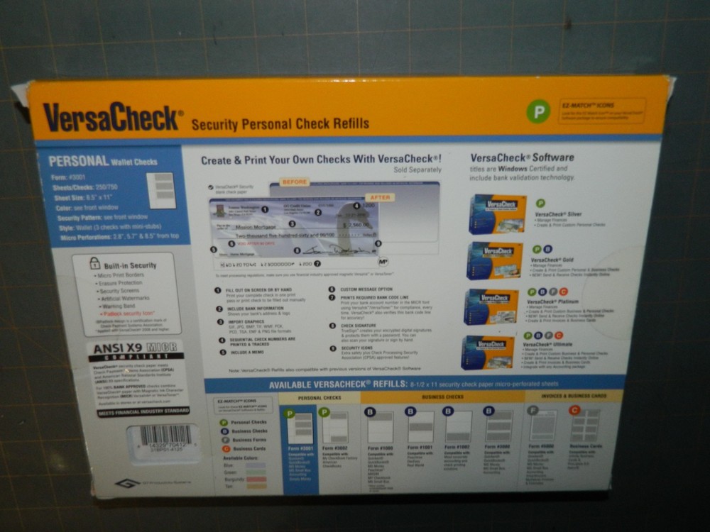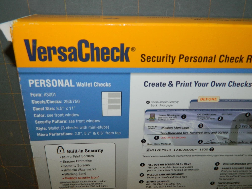 VersaCheck Security Personal Check Refills Form #3001 Voucher Checks 250 Sheets New unused in opened box Wallet size 3 personal checks with mini stub on each 8.5x11 page See the photos - what you see is exactly what you will get! Immediate free shipping!