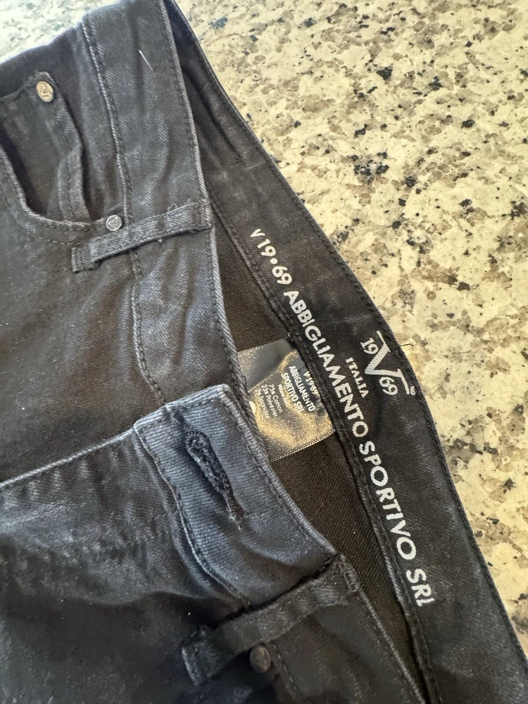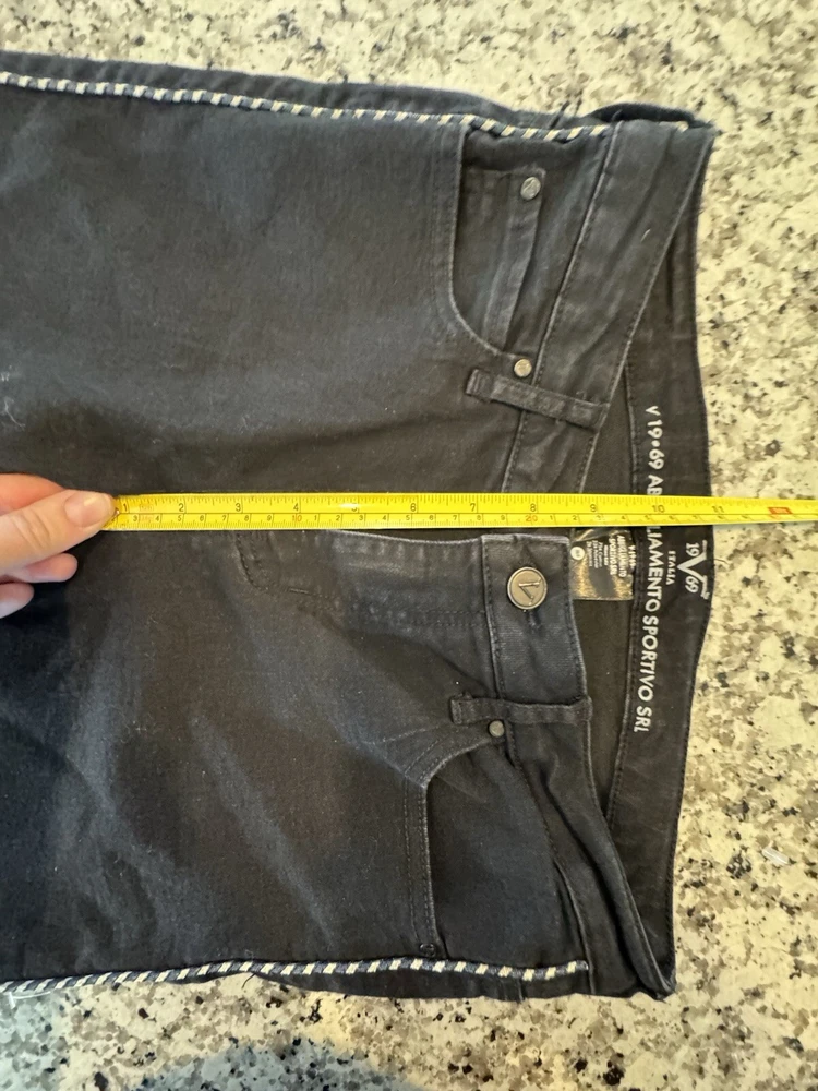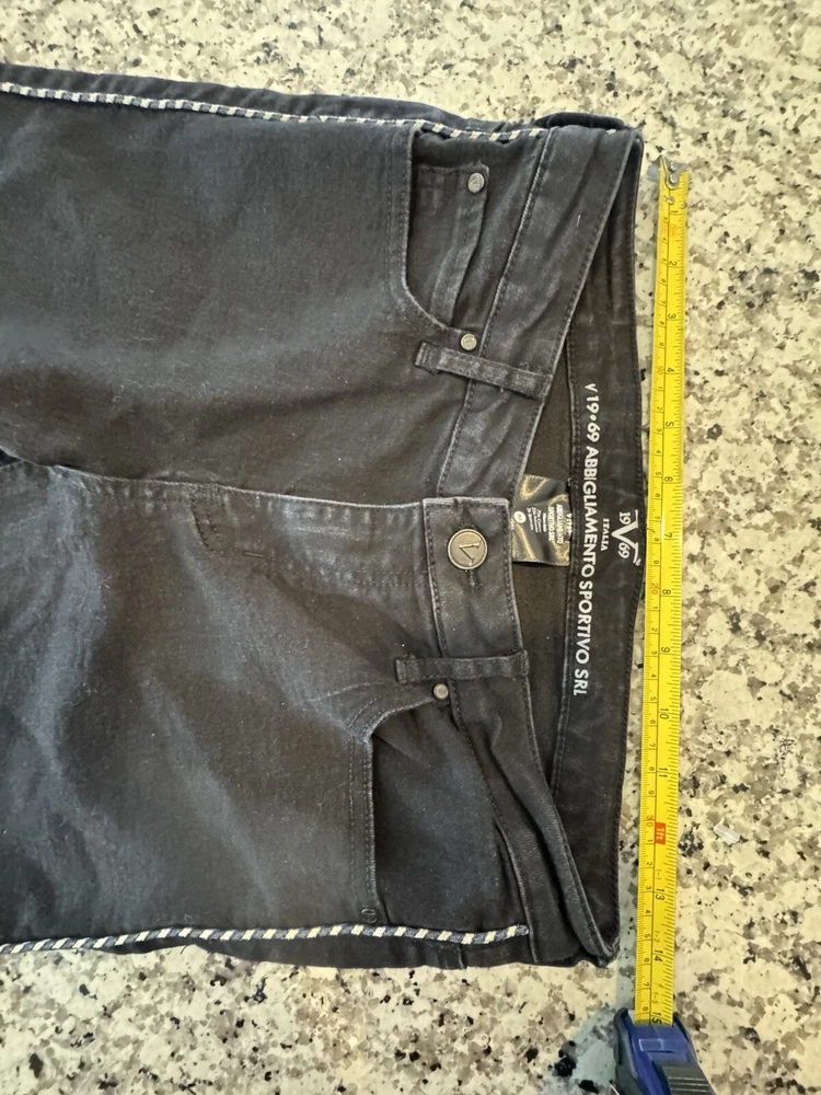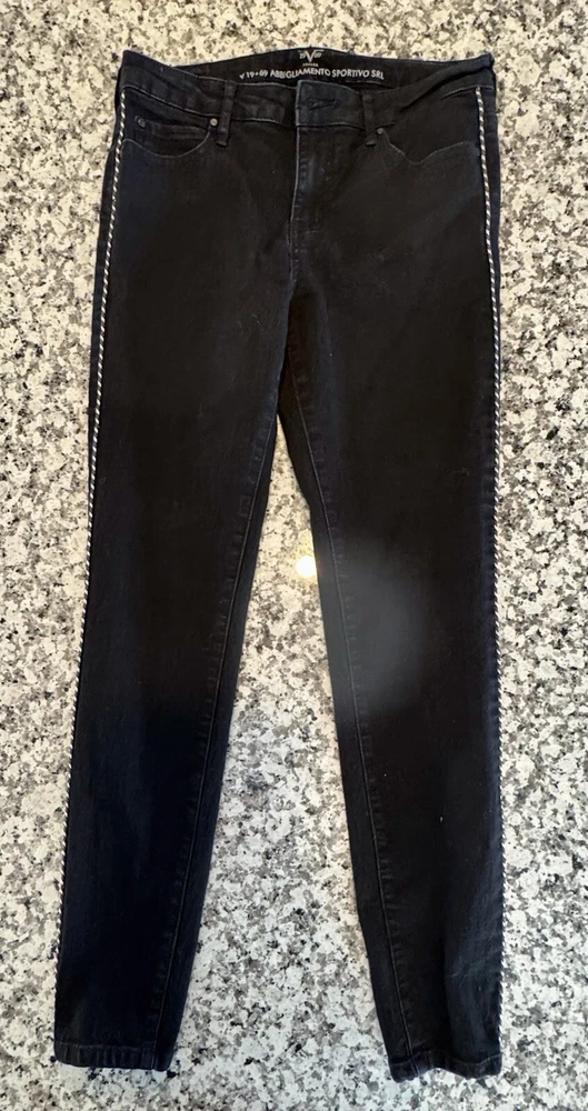 Super cute and in excellent preowned condition!! Measurements in photos are estimates only as garment laid flat. No Tears or rips. Be sure to check all photos. Buyer is responsible for reviewing all photos for condition. I do my absolute best to find any flaws prior to listing, and always disclose any that i do find. With that said, there may still be flaws present that were missed unintentionally by human error. All of my items are carefully inspected then stored safely after photos. This ensures you receive the item in the same condition it was photographed. The Versace 19-69 Abbigliamento Sportivo Srl Italia Side Rope Black Jeans are a stylish pair of skinny jeans in a size 6. Made of a cotton blend denim fabric, these jeans feature a unique blue side rope detail for added flair. With a slim fit and a mid-rise of 8.5-10.5 inches, they have a 28.5-inch inseam and a dark wash finish. Perfect for all seasons, these Versace jeans exude a mix of festival, rock, bohemian, and retro themes with a touch of urban flair, making them a versatile and trendy addition to any wardrobe.