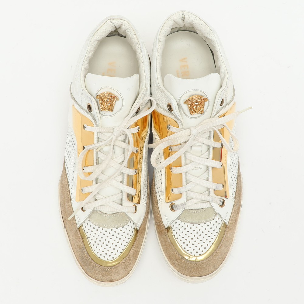 Coming in a classic silhouette, these designer sneakers are a seamless combination of luxury, comfort, and style. These sneakers are designed with signature details and comfortable insoles.Certified by The Luxury Closet - This item has gone through a detailed authentication process overseen by our experts. We offer a lifetime guarantee of authenticity on all our items. Import duties, taxes and charges are not included in the item price. These charges are the buyers responsibility. Please check with your country’s customs office to determine what these additional cost will be prior to buying. Our eBay Store About Us Contact Us Add to Favorite Sellers Versace White/Beige Leather and Suede Medusa Low Top Sneakers 43 $436.7 Coming in a classic silhouette, these designer sneakers are a seamless combination of luxury, comfort, and style. These sneakers are designed with signature details and comfortable insoles. Product Details Brand Color White Dimensions Material Leather, Suede Size 43 Outsole Width 10 cm Outsole Length 29 cm Heel Height Includes The Luxury Closet Packaging Certified by The Luxury Closet This item has gone through a detailed authentication process overseen by our experts. We offer a lifetime guarantee of authenticity on all our items. How We Check The in-house team of experts at The Luxury Closet is highly trained to verify the authenticity and the condition of the luxury products. They ensure that only 100% authentic items are put on sale.The evaluation process is unique with its own mix of assessment criteria and differs according to the category. Each item is evaluated based on the following combination of hallmarks, hardware, stitching, symmetry, material, craftsmanship, stamping, codes, hologram stickers, and packaging. Our authenticators also check if the items have been modified or amended (e.g., aftermarket diamonds, replaced batteries, repaired bags, etc.) International Buyers Import duties, taxes and charges are not included in the item price. These charges are the buyers responsibility. Please check with your country’s customs office to determine what these additional cost will be prior to buying.