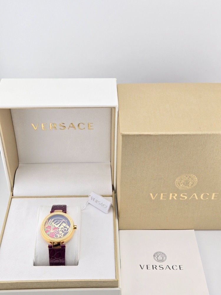 Versace Mystique Hibiscus Flower Dial Purple Watch – 19Q81D9HI-S702 ($5400 MSRP) New with Original Box and Tags! This watch is a Shelf Pull from one of the Major Department Stores. May find few micro scratches on the watch case/band, visible under a direct and strong light. Indulge in the allure of high fashion with the Versace Mystique Hibiscus Flower Dial Purple Watch – 19Q81D9HI-S702, a masterpiece that seamlessly blends opulence with sophisticated design. The watch features a striking gold PVD stainless steel case, which is elegantly complemented by a sumptuous purple leather strap. The fixed gold PVD bezel, adorned with dazzling diamonds, accentuates the luxurious nature of this timepiece, while the 38mm round case shape ensures a flattering fit on any wrist. The focal point of this exquisite watch is its unique hibiscus flower baroque dial, which is a testament to Versace's commitment to artistry and innovation. The dial's rich purple hue is beautifully contrasted by the gold-tone hands, adding a touch of regal elegance. With no markers to distract from its pure design, this analog watch emphasizes its sophisticated simplicity. Equipped with a scratch-resistant sapphire crystal and a water resistance of up to 50 meters, this watch offers both style and practicality. The quartz movement guarantees precise timekeeping, while the fold-over clasp ensures a secure and comfortable fit. Perfect for those who appreciate luxury and artistry, the Versace Mystique Hibiscus Flower Dial Purple Watch is a statement piece that combines timeless elegance with modern functionality. Features Gold PVD stainless steel case with a purple leather strap. Fixed gold PVD bezel set with diamonds. Hibiscus flower baroque dial with gold-tone hands. No markers. Dial Type: Analog. Quartz movement. Scratch resistant sapphire crystal. Pull / push crown. Solid case back. Case diameter: 38 mm. Round case shape. Fold over clasp. Water resistant at 50 meters / 165 feet. Functions: hour, minute. Fast and Free Shipping You're already purchasing the item. Why pay additional for shipping, especially slow shipping? We get your order shipped out within 1-business day and delivered to your doorstep as quickly as possible. Competitive Pricing With our dynamic pricing model, our prices are always competitive. Our prices are some of the lowest that you will find on the internet. Rest assured that you're getting a good deal when purchasing with us. 30-day Money Back Guarantee We are committed to making sure that you leave this transaction satisfied. If you're unhappy with the product for any reason, you may return it back for your money-back or a replacement within 30 days. No questions asked!