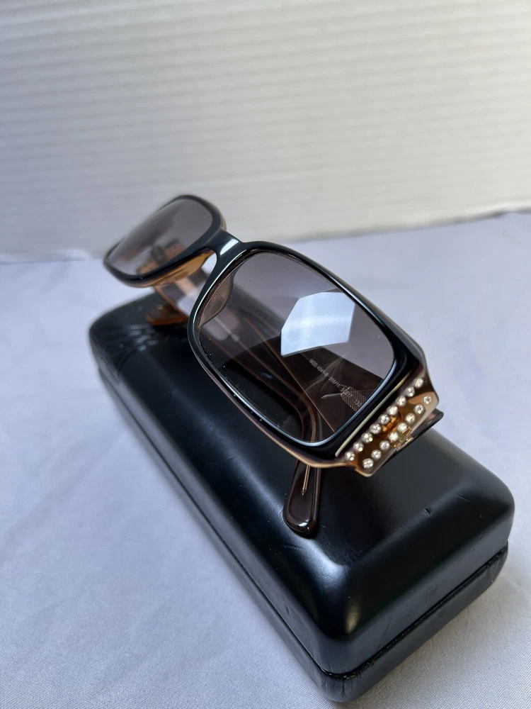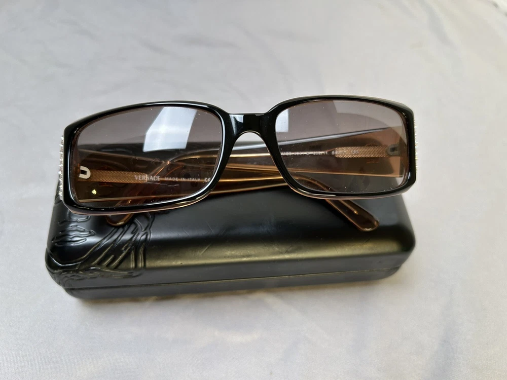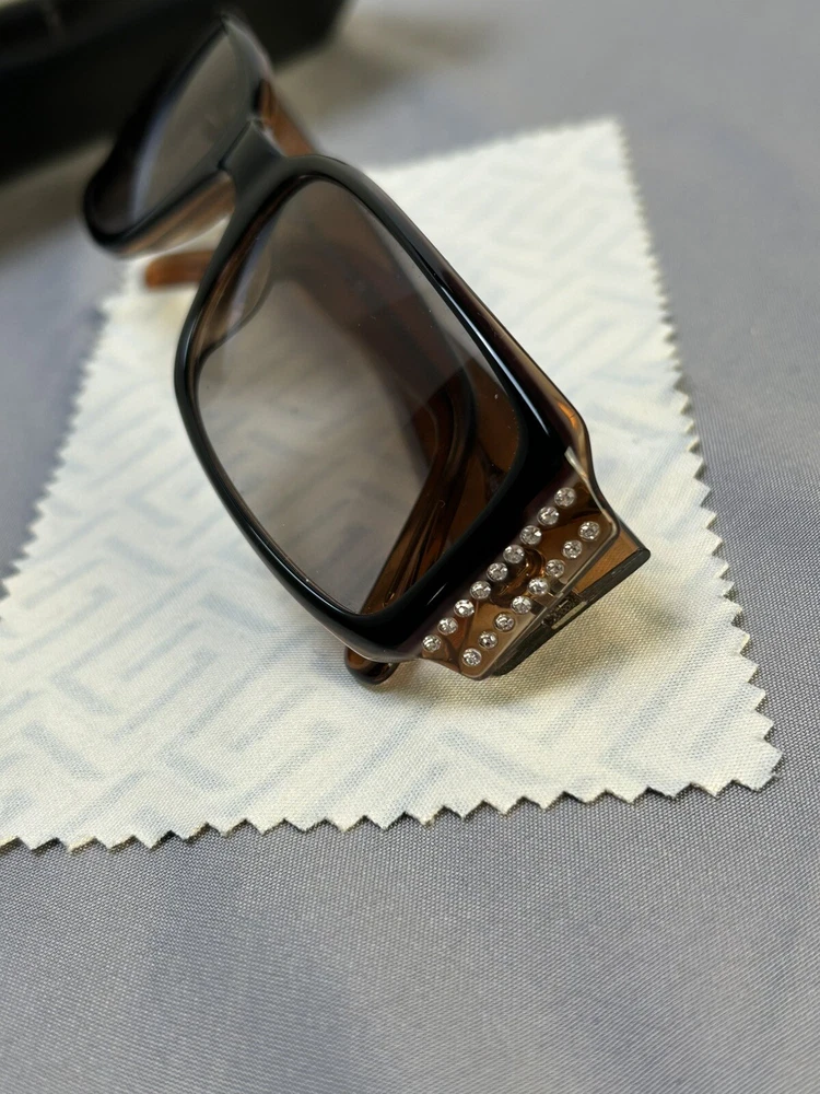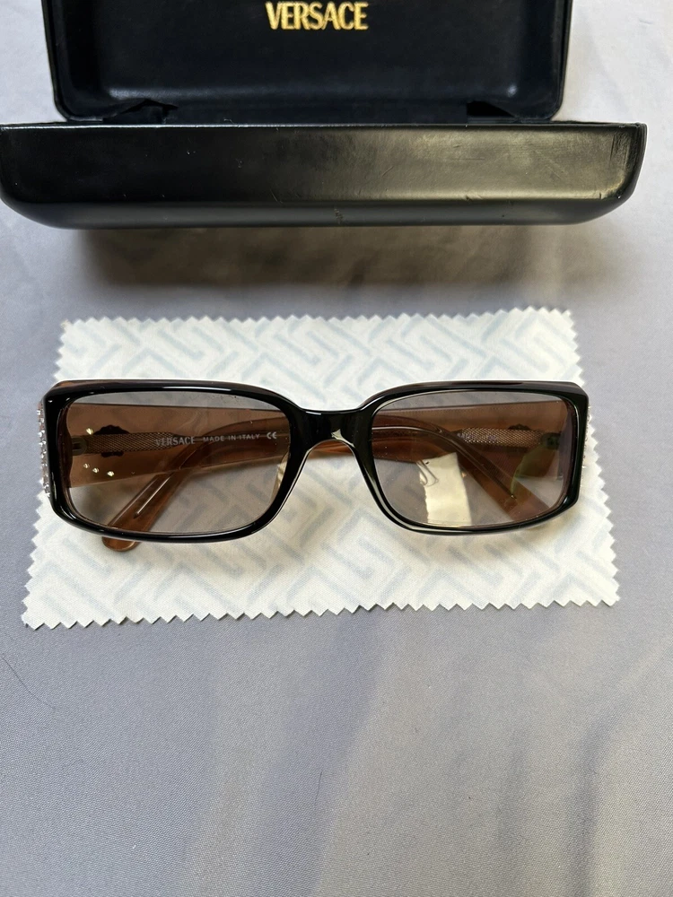 Versace VE 4041B Sunglasses Color: Black w/ Caramel Designer Case and Lens Wipe Included. Pre-owned w/ some ware. One rhinestone missing on one side. Case has some scuffs. Lenses and frame aside from rhinestone is in good condition, no scratches on lenses. Please let me know if you’d like any additional pictures.