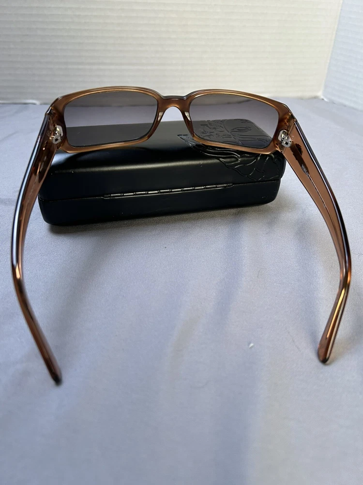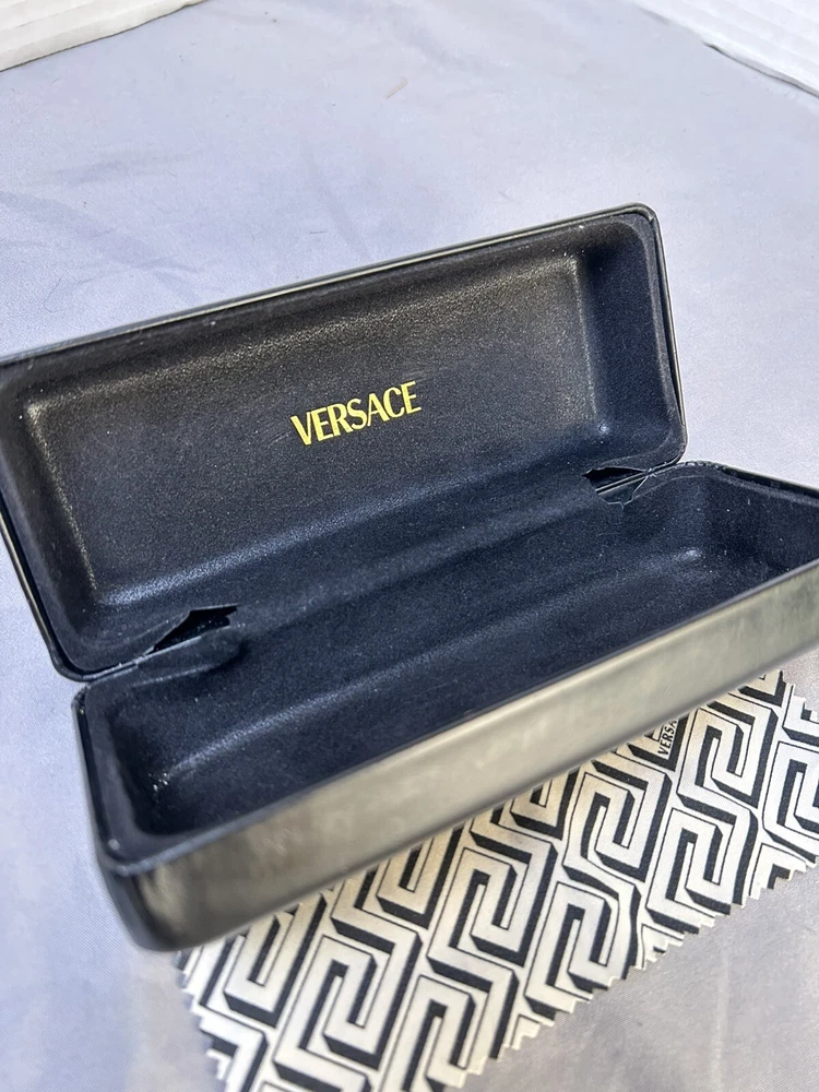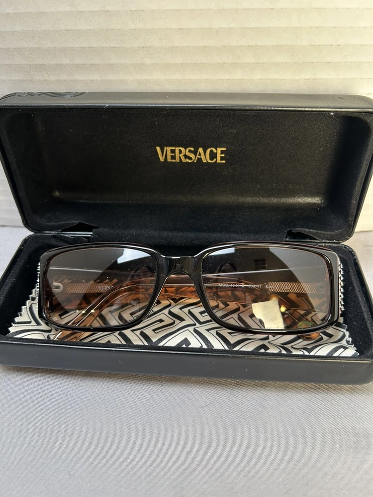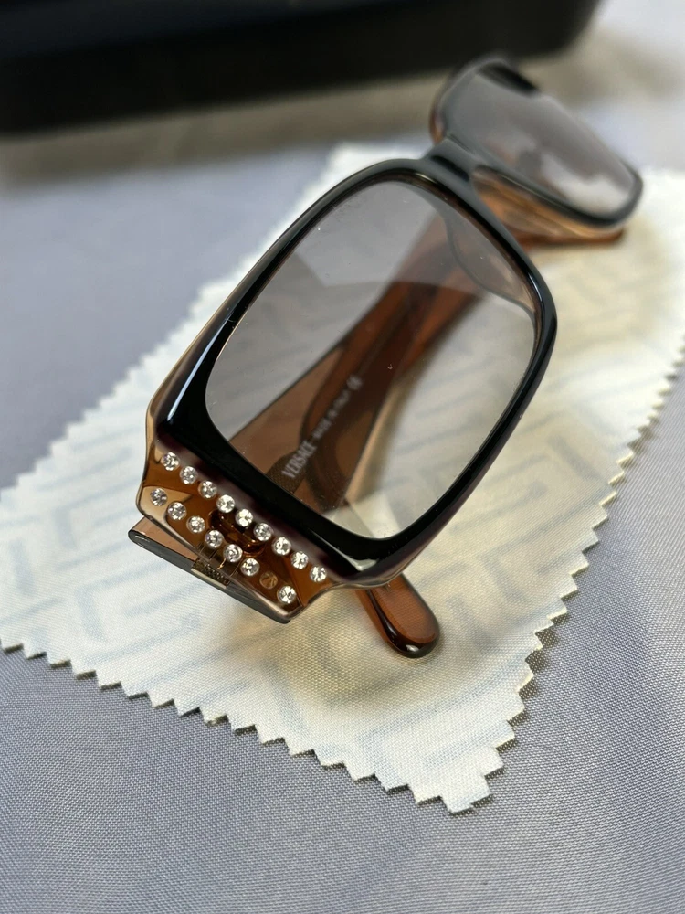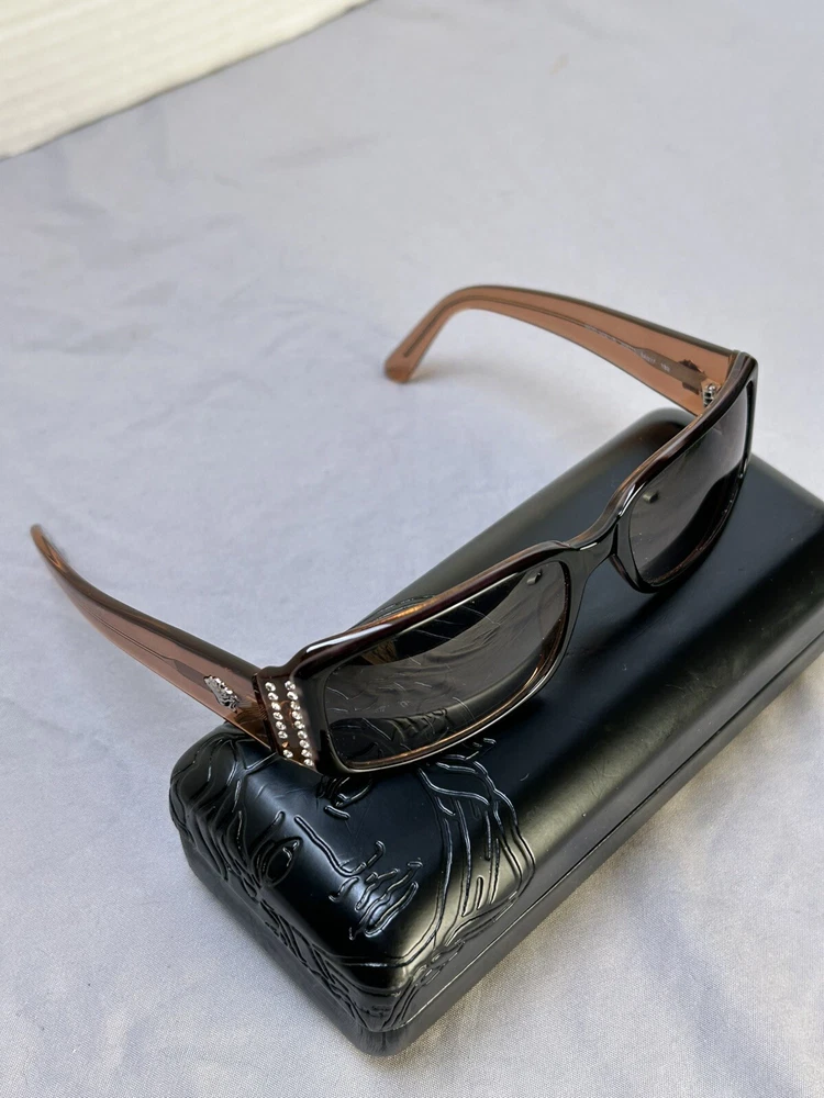 Versace VE 4041B Sunglasses Color: Black w/ Caramel Designer Case and Lens Wipe Included. Pre-owned w/ some ware. One rhinestone missing on one side. Case has some scuffs. Lenses and frame aside from rhinestone is in good condition, no scratches on lenses. Please let me know if you’d like any additional pictures.