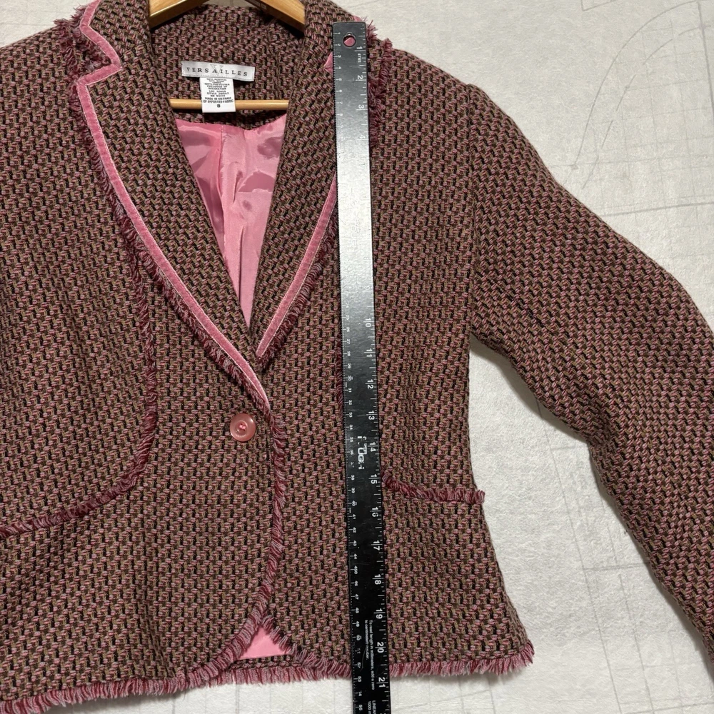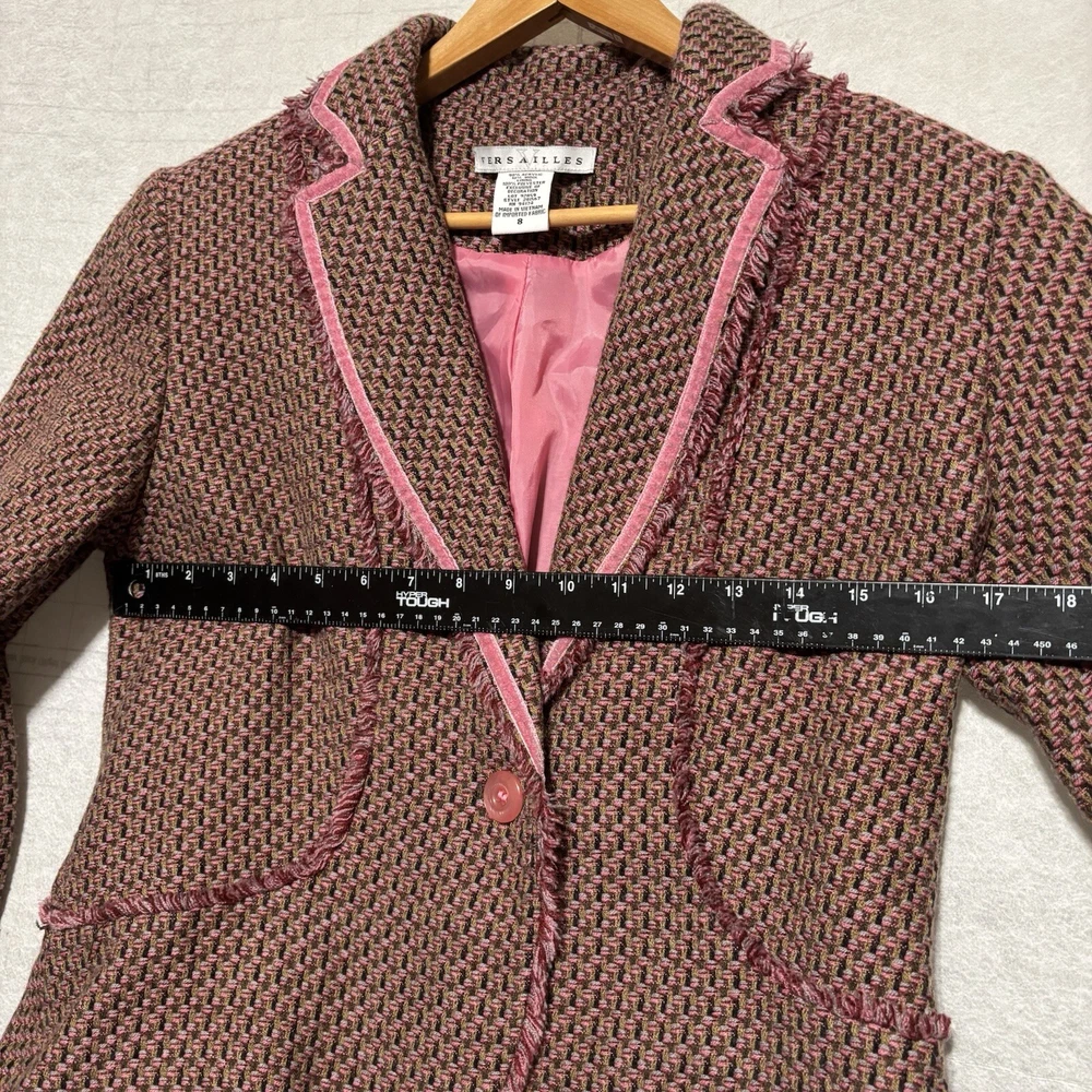 Versailles Women’s SZ 8 Pink Acrylic Wool Blend Tweed Fringed Blazer Padded. Condition is Pre-owned. Shipped with USPS Ground Advantage.