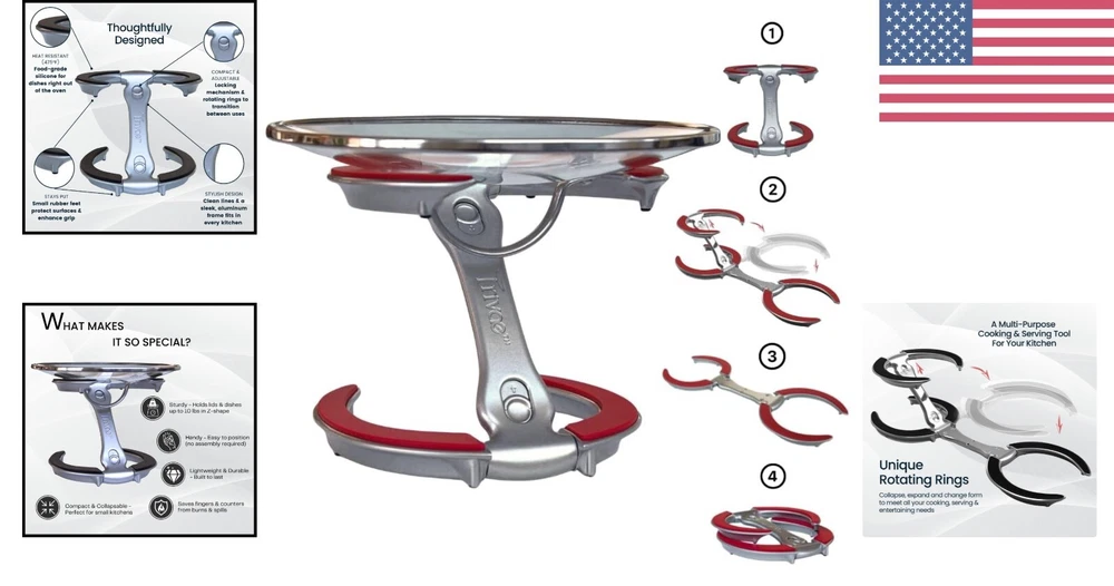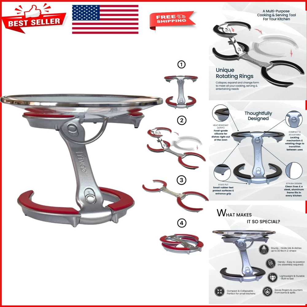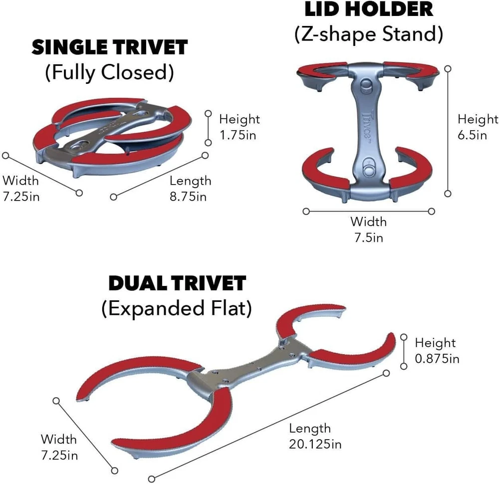 Product Dimensions: 8.75"l X 7.25"w X 1.75"th Item Weight: 1.34 Pounds Material: Aluminum, Silicone UPC: Does Not Apply Brand: Unbranded Model: Kitchen Accessory Features: Heat Resistant, Durable, Compact, Adjustable, Dishwasher Safe Global Trade Identification Number: 00604697977418 gtin13: Does Not Apply Shape: Round Personalize: No Number of Items in Set: 1 Type: Lid Holder Color: Flame Red Batteries Required: No Handle Material: Silicone Product Care Instructions: Dishwasher Safe Set Includes: Lid Holder, Trivet, Pot Holder, Cake Stand