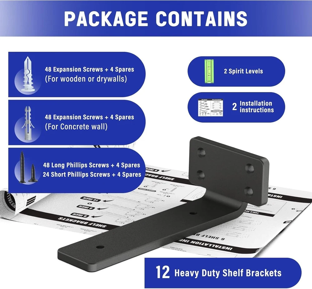 Batteries Included?: No Item Length: Shelf Brackets Material: Iron, Metal Suitable For: Books Item Height: Shelf Brackets Included Components: Floating Shelf Brackets Assembly Required: Yes Size: 6 Inch Item Weight: 10.52 lb Batteries Required?: No Set Includes: Shelf Brackets Features: Heavy Duty, Durable Coating Item Depth: 3.94 Inches Product Dimensions: 7.48 X 3.94 X 8.07 Inches Brand: Unbranded Additional Parts Required: No Required Tools: No Tools Required Room: Kitchen, Living Room, Bedroom, Bathroom, Storage Room, Utility Room, Checkroom, Laundry Room Number of Items in Set: 12 Item Width: Shelf Brackets UPC: Does not apply gtin13: Does not apply Finish Type: Frosted Coating Distance from Floor to Bottom: 3.94 in Color: Black Mounting: Wall Mounted Mounting Type: Wall Mount Shape: Rectangle Packaging: Flat Pack Department: Adults Finish: Frosted Maximum Weight per Shelf: 160 lb Type: Shelf Brackets Item Dimensions L X W X H: 7.48 X 3.94 X 8.07 Inches Style: Contemporary/Modern Maximum Weight Capacity: 160 lb Number of Shelves: 6 Personalized: No
