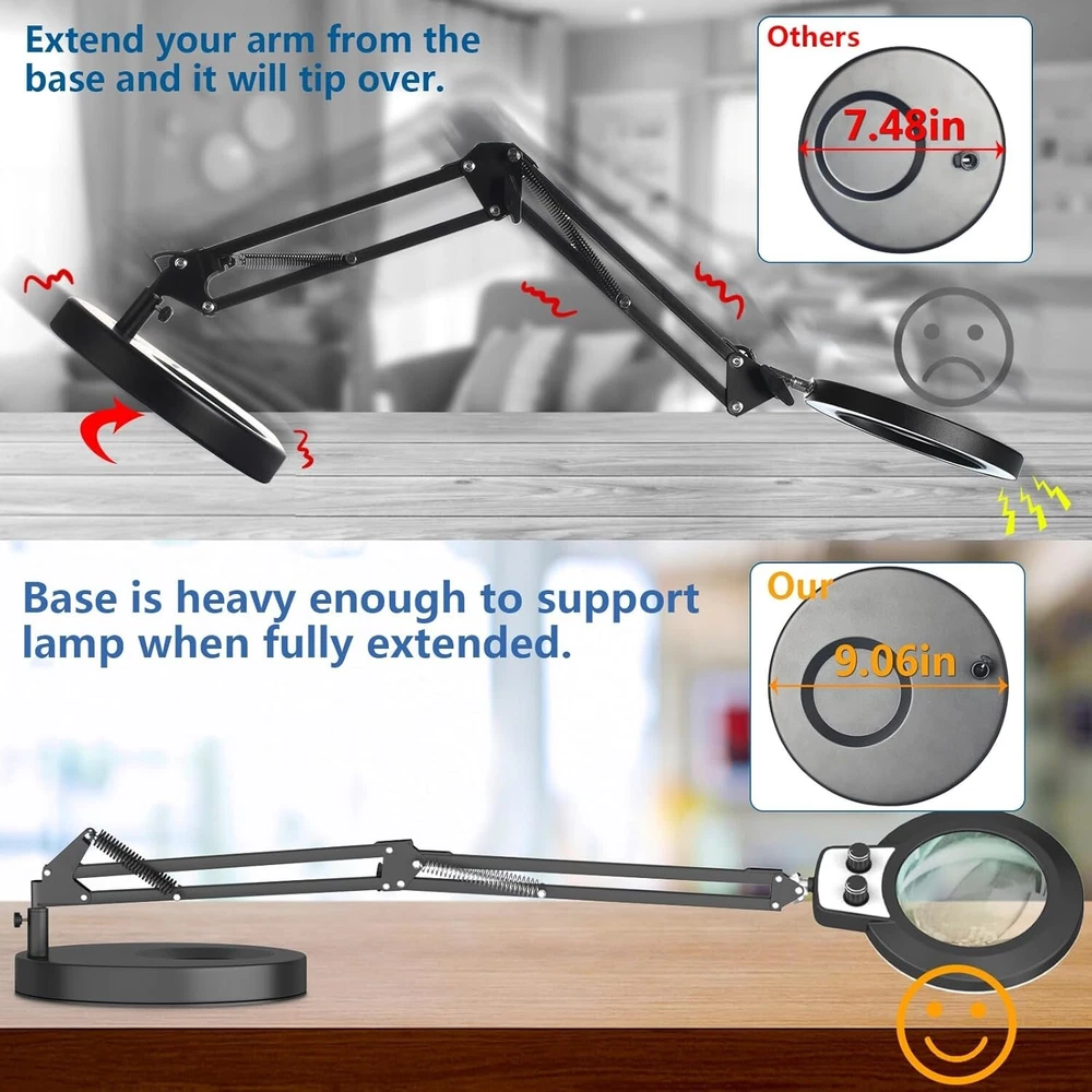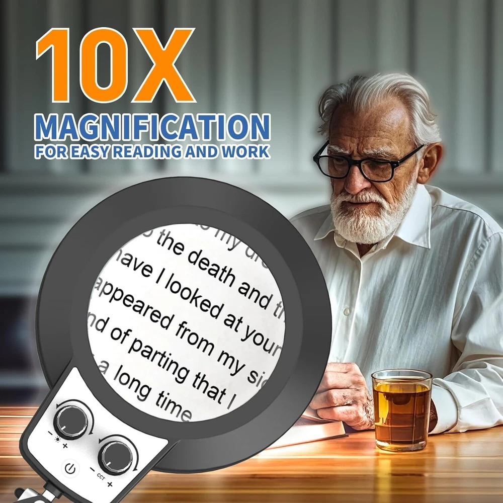 10X Magnifying Glass with Light Hands Free, 2024 New Upgrade Infinite Color and Brightness Magnifying Desk Lamp & Clamp, 2-in-1 LED Lighted Magnifier Stand for Craft Reading Hobby Close Work Product Description Finish Type Painted Base Material Aluminum Product Dimensions 42"D x 9.06"W x 2"H Item Weight 5 Pounds Lamp Type Desk Lamp About this item 【2024 New Head Rotating Knobs】Our magnifying lamp features a 360° horizontal head rotation knob for even force distribution and stability, preventing the lens from tipping over. Unlike traditional overhead Button that apply downward force and cause drooping, our design ensures stable performance. 【Infinite Color and Brightness】Our upgraded magnifying glass exceeds standard 3-color modes. Turn on the switch and use the two dials to control lighting: the left knob adjusts brightness for cool light LEDs, while the right knob adjusts warm light LEDs. Customize the color temperature exactly to your preference. 【10X HD Real Glass Magnifier】 Magnifying glass with light and stand equipped with 4.3-inch high-definition optical real glass lens, 10x magnification. Built-in light prevents glare, ensures clear and distortion-free vision, restores true colors, and provides a comfortable viewing experience. 【2-in-1 Design & Powerful Swing Arm】This magnifier with light serves as both a desk and clip lamp. Large 9.06-inch base prevents tipping, addressing issues with smaller bases. The sturdy metal clip is suitable for workbenches/desk/tables, and the 4 springs and 3 knobs ensure stability and flexibility. 【Memory Function & Cool-to-Touch Magnifying Desk Lamp】Our magnifying glass with light hands free features a memory function to restore the last used mode without readjustment. Additionally, the lamp head remains cool even after extended use, preventing overheating and ensuring safety and comfort.