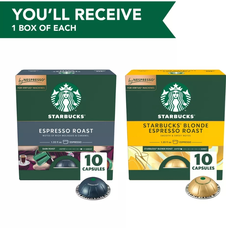 Enjoy the authentic café taste of Starbucks coffee at home like never before on Nespresso Vertuo Machines. Made with the premium quality Starbucks coffee that you know and love, Starbucks capsules are developed with Nespresso to work perfectly with the Nespresso Vertuo system and are fully recyclable through the Nespresso recycling program. Starbucks Espresso Roast has notes of rich molasses and caramel, while Starbucks Blonde Espresso Roast features smooth and sweet notes. Both are perfect for making oh-so-delicious espresso drinks. Each precision-brewed Starbucks coffee is made with 100% arabica coffee beans. Authentically delicious perfection is just a cup away. Nestlé uses Starbucks trademarks under license. NESPRESSO is a registered trademark of Société des Produits Nestlé S.A., Vevey, Switzerland. NET WT 2.39 OZ (68 g) each