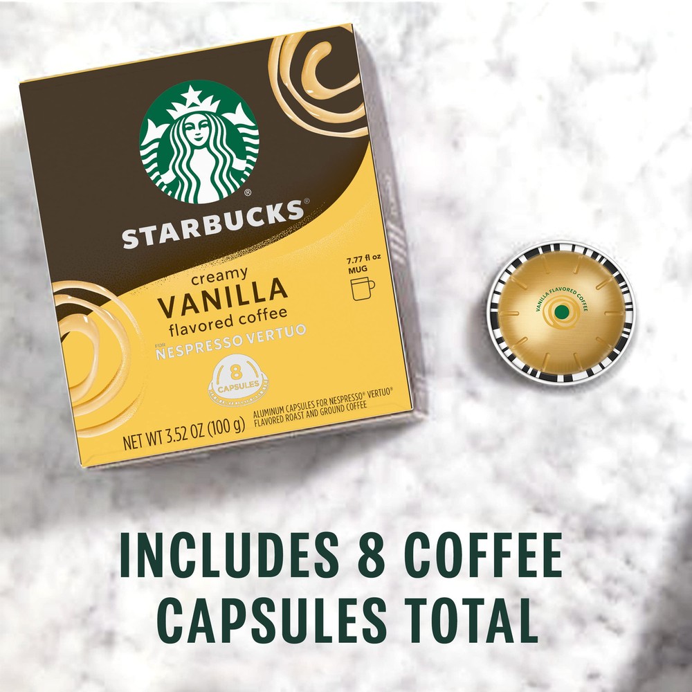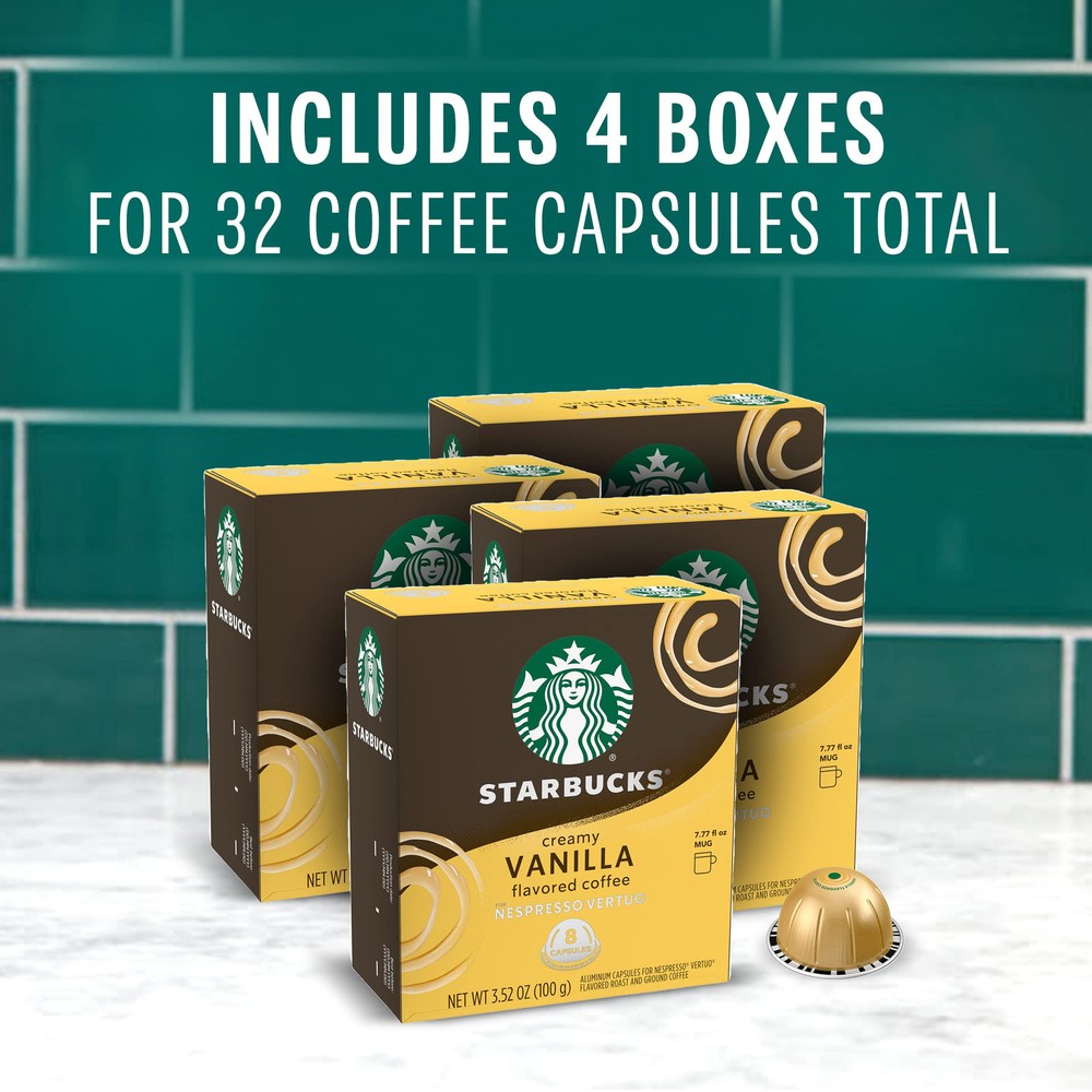 Enjoy the authentic café taste of Starbucks coffee at home like never before on Nespresso Vertuo machines. Made with the finest-quality Starbucks coffee that you know and love, Starbucks capsules are developed with Nespresso to work perfectly with the Nespresso Vertuo system. Each cup of Starbucks Creamy Vanilla naturally flavored coffee carries sweet notes of vanilla and shortbread and is made with 100% arabica coffee beans. Authentically delicious perfection is just a cup away. Nestlé uses Starbucks trademarks under license.. : Enjoy the classic taste of Starbucks you love with this 4 pack of Starbucks Creamy Vanilla Flavored Coffee for Nespresso Vertuo coffee pods SWEET AND CREAMY VANILLA: Sweet vanilla and decadent shortbread come together with one of our lightest roasts. Made with natural flavors, it’s a delightful cup—perfectly balanced and velvety smooth. Enjoy with milk for a creamy, flavorful moment MADE FOR NESPRESSO VERTUO: Each Starbucks capsule for Nespresso Vertuo machines best brews a 7.77-fluid-ounce mug RECYCLABLE: for Vertuo coffee pods are made from aluminum and are fully recyclable through the Nespresso recycling program STARBUCKS QUALITY AT HOME: Starbucks capsules for Nespresso Vertuo machines contain the high-quality Starbucks coffee that you know and love