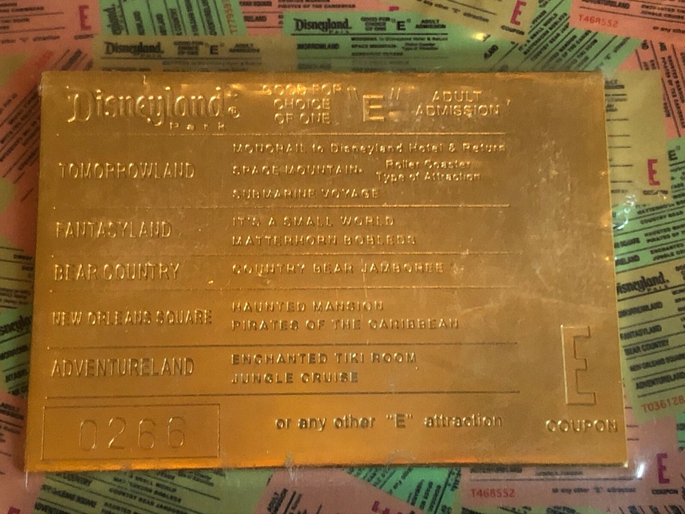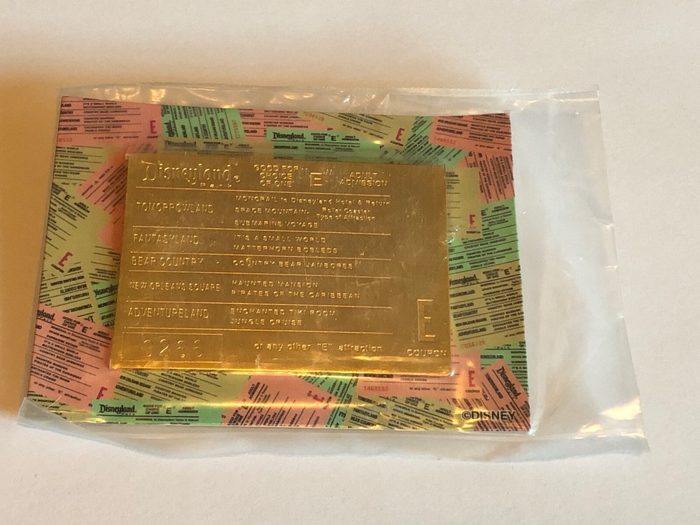 Up for Auction is (1) Very Rare - Disneyland Golden E-Ticket # 0266 Limited Edition Pin 19226 . This limited edition individually numbered pin with a unique printed back card of multiple tickets features a golden E-Ticket Adult Admission from the olden days. Pin measures approximately 2-3/4" x 1-7/8". The individual numbers, on these pins, appears on the front of the pin instead of the back. The pin is much more beautiful than the picture shows. It is bright, shiny gold, which makes it very difficult to scan and photograph. Please do not be deceived....this is an absolutely gorgeous pin. To add to the rarity there is a misprint on the pins, it reads Matterhorn Bobleds instead of Matterhorn Bobsleds. Also on some of the pins the backs are breaking off (not on this one) Due to the error and the pin backs breaking, this pin was pulled from sale. It was originally a limited edition of 2500, however it's estimated that less than 400 were sold before being pulled and destroyed. Condition is "New" on original card in original unopened packaging. Check out my other listings to save on combined purchases. Shipped with USPS First Class.