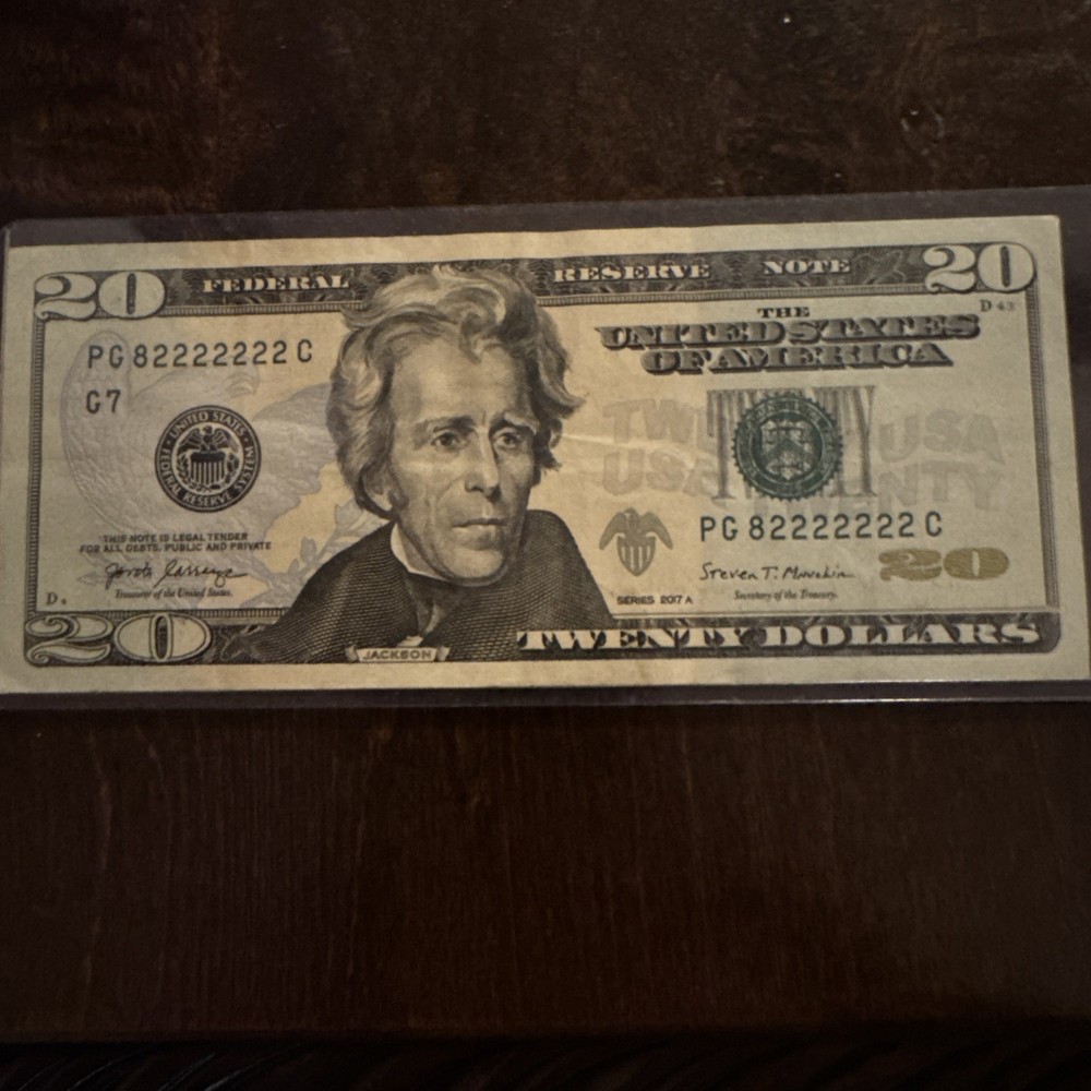 Very Rare Fancy Serial Number $20 Dollar Bill P G82222222C year 2017
