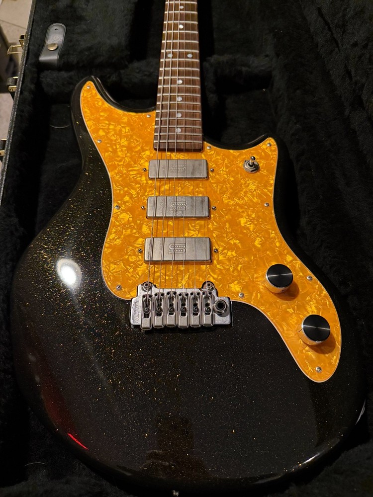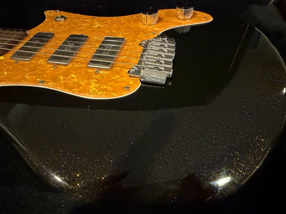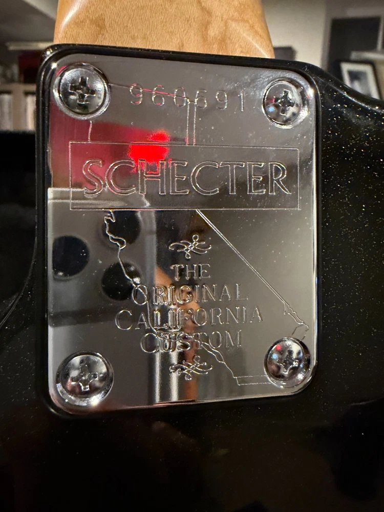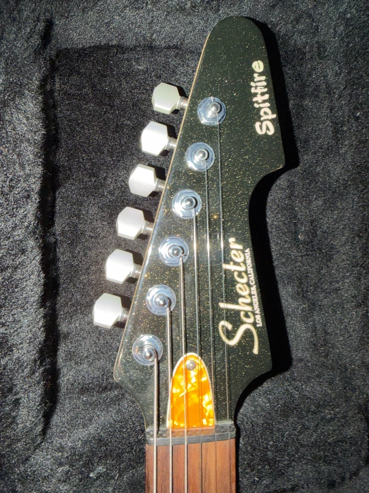 Presenting a 1996 Schecter California Custom Spitfire guitar, crafted in the USA. Notably, this version of the Spitfire was produced for just one year, adding to its collectibility and rarity. This instrument is in outstanding, collector-grade condition, showing only light pickguard marks with no significant nicks, dings, or scratches. The frets are excellent, and it appears to have been played very little, maintaining its original state throughout. The guitar boasts a stunning black-sparkle finish, complemented by a light orange pickguard. It’s equipped with three Seymour Duncan mini humbuckers, a USA-made Wilkinson tremolo, and locking Sperzel tuners. Included is the original Schecter-branded case. This model is VERY RARE, and finding another in such pristine condition is exceptionally uncommon. Dates of manufacture: 1996 Production of the retro styled Schecter Spitfire began in 1996 - but legal complications forced Schecter to change its name to the Hellcat by 1997. "designed to be the ultimate marriage of the 60s and the 90s, the three mini-humbuckers offer a wide array of shimmering tones. Cool vintage finishes, psychedelic colored pearl pickguards and oversized 'radio' knobs add to the retro look, while the VS-100 tremolo and Sperzel locking tuners give the tuning stability that the 'pawnshop' specials of yesteryear did not have."