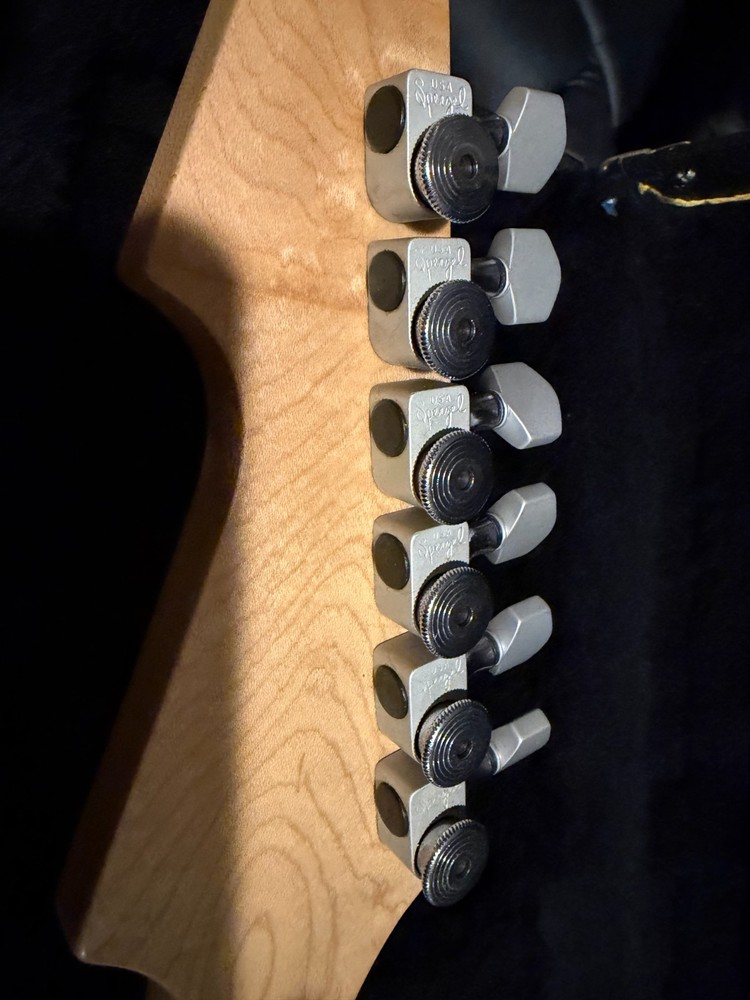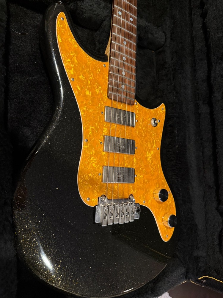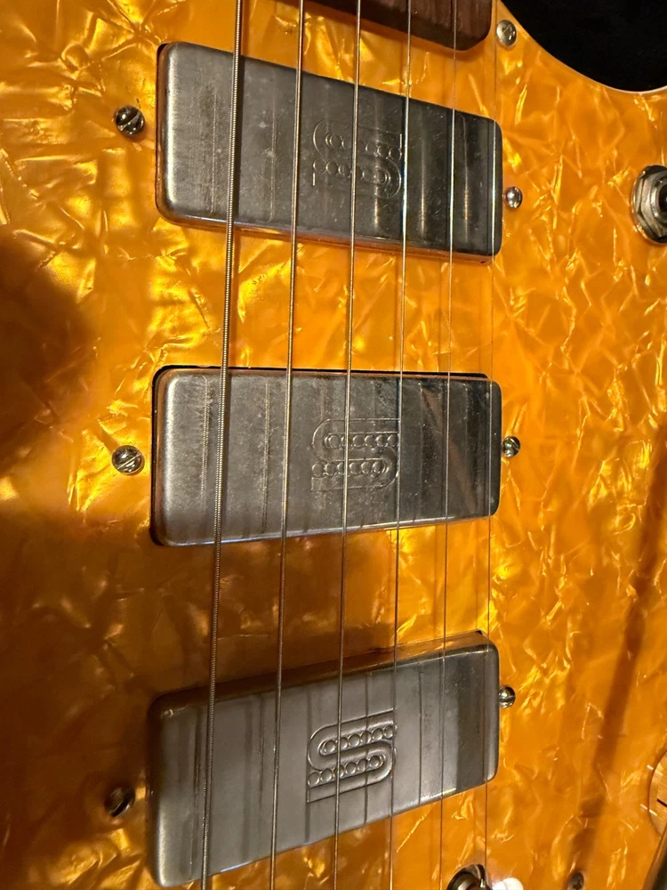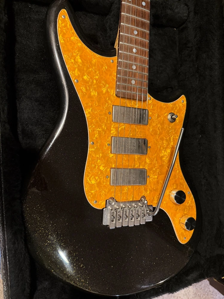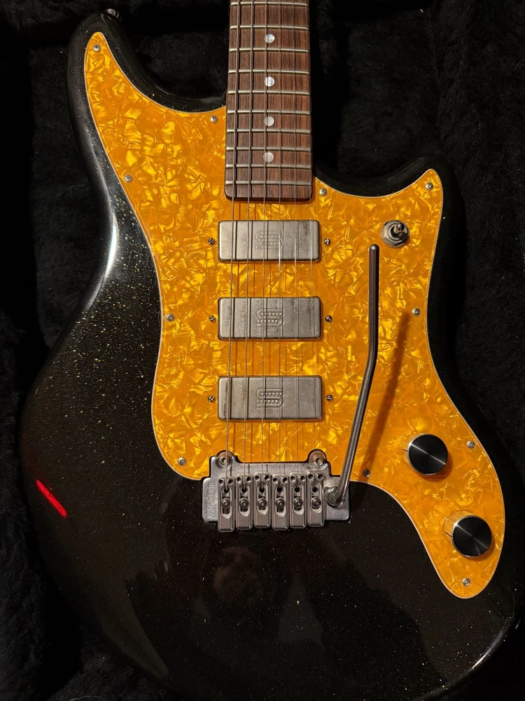 Presenting a 1996 Schecter California Custom Spitfire guitar, crafted in the USA. Notably, this version of the Spitfire was produced for just one year, adding to its collectibility and rarity. This instrument is in outstanding, collector-grade condition, showing only light pickguard marks with no significant nicks, dings, or scratches. The frets are excellent, and it appears to have been played very little, maintaining its original state throughout. The guitar boasts a stunning black-sparkle finish, complemented by a light orange pickguard. It’s equipped with three Seymour Duncan mini humbuckers, a USA-made Wilkinson tremolo, and locking Sperzel tuners. Included is the original Schecter-branded case. This model is VERY RARE, and finding another in such pristine condition is exceptionally uncommon. Dates of manufacture: 1996 Production of the retro styled Schecter Spitfire began in 1996 - but legal complications forced Schecter to change its name to the Hellcat by 1997. "designed to be the ultimate marriage of the 60s and the 90s, the three mini-humbuckers offer a wide array of shimmering tones. Cool vintage finishes, psychedelic colored pearl pickguards and oversized 'radio' knobs add to the retro look, while the VS-100 tremolo and Sperzel locking tuners give the tuning stability that the 'pawnshop' specials of yesteryear did not have."