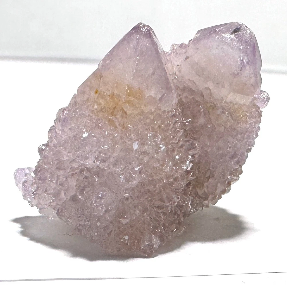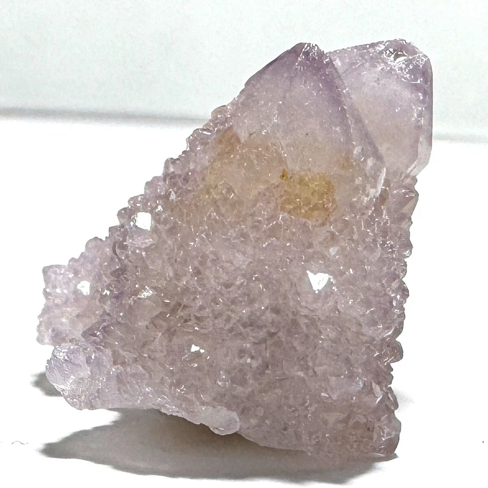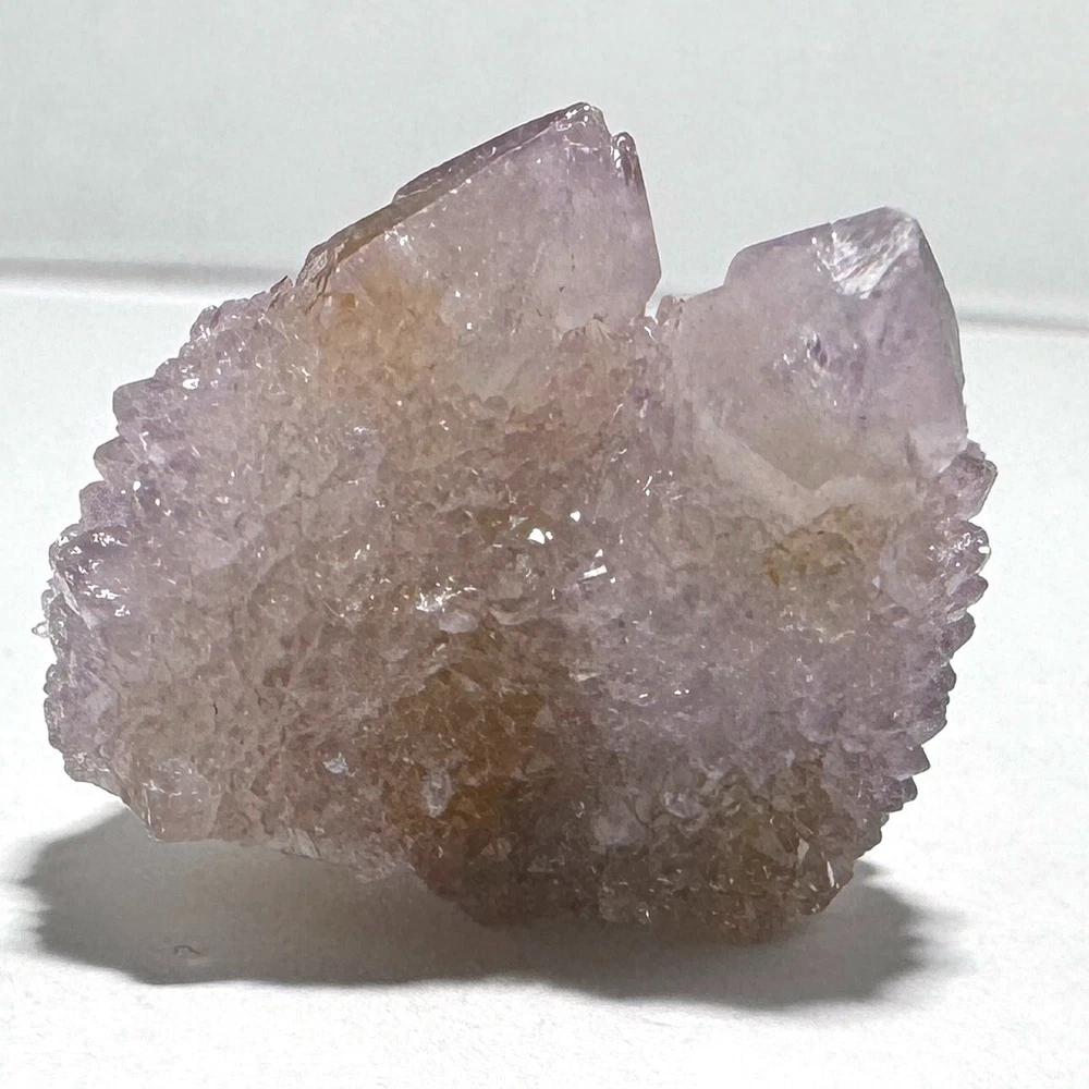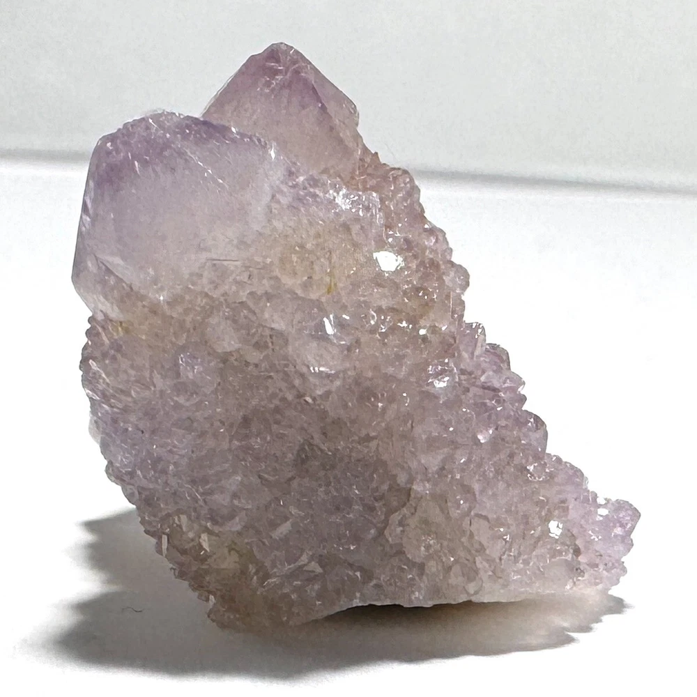 Cactus Quartz or Spirit Quartz Size Approximately 2.5 cm x 2.5 cm x 2.5 cm 12.6 g View My Other Items For Sale Visit My eBay Store Add me to your Favorite Sellers A cactus or spirit quartz is a quartz crystal that is encrusted by a second generation of smaller crystals grown on its prism faces. These crystals were first discovered in 1986 in the Magaliesberg Mountain Range near Pretoria, South Africa. It occurs as quartz, citrine and amethyst, and comes in a wide range of colors, including purple amethyst, violet amethyst, smoky, milky clear and golden citrine. FAQ/Tips Crystals are priced by quality, color and size. Purple amethyst is more highly prized and will cost more for a smaller lesser quality crystal. Lavender is the most common color and where you will find the best quality/value for price Crystals change colors with changes in type angle and intensity of light. Color may also vary between monitors. Pictures were taken in bright natural light. We do our best to give you many views so you can judge the quality of the given crystals. If you have questions please ask before bidding or buying. Many of the crystals have special color properties: Many have phantoms, not just the ones we?ve indicated. Some have ?floating? purple tips. The placement of darker purple against purple or white crystals appears to change as the crystal is turned. Many are a mixture of citrine and amethyst. The ones called ?Golden Healers? or ?Sunshine? have a rainbow effect on crystal faces. We value your feedback please contact us with problems. Items are returnable. Track Page Views With Auctiva's FREE Counter