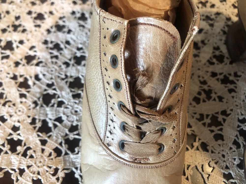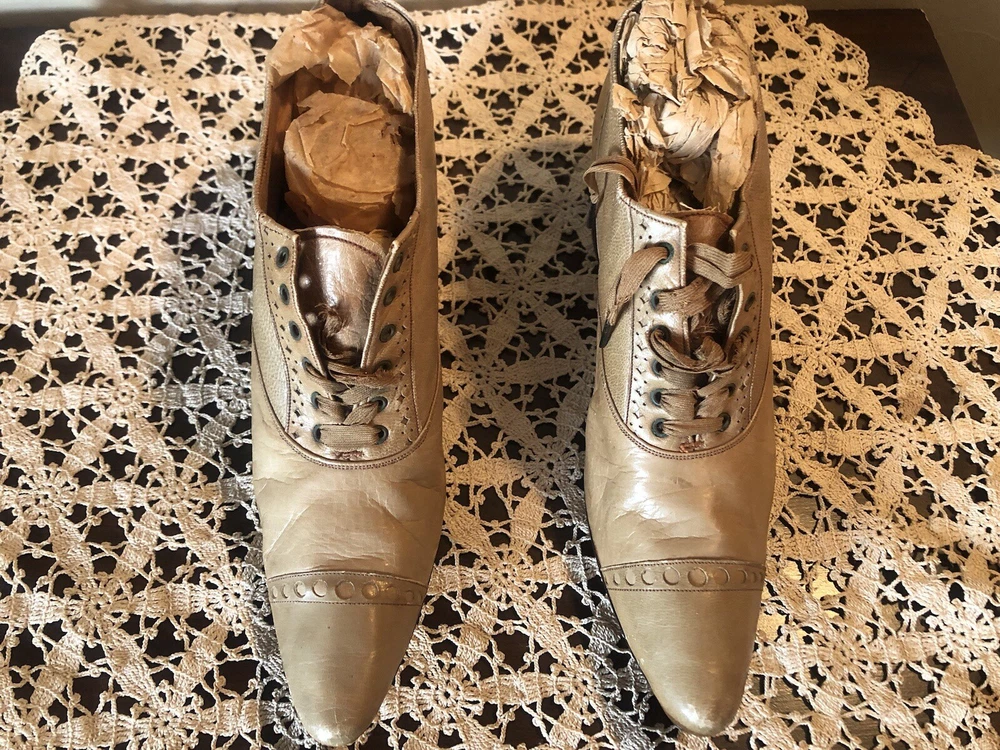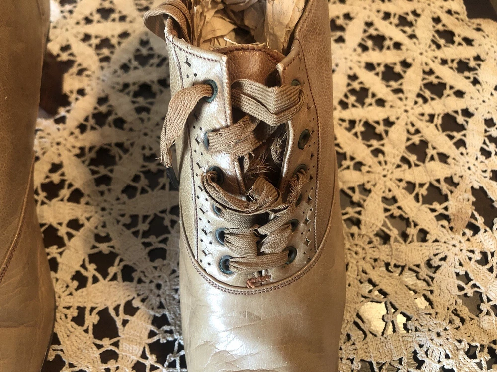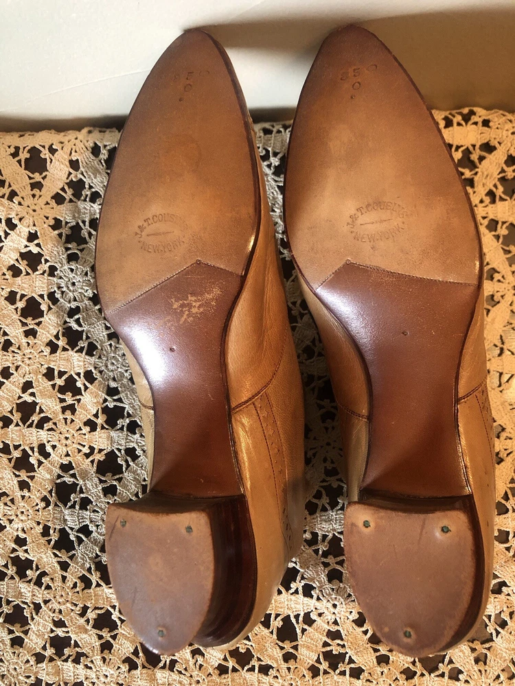 Very small Victorian women's shoes from the early 1900s. They are made of tan leather. The insole is stamped D.H. Downing & Sons, Peoria Ills. The sole is stamped with J & T Cousins, New York. These appear to be a handcrafted “one at a time” production. These shoes are a unique piece of history that would appeal to collectors of antique footwear or those interested in the fashion of the early 20th century.